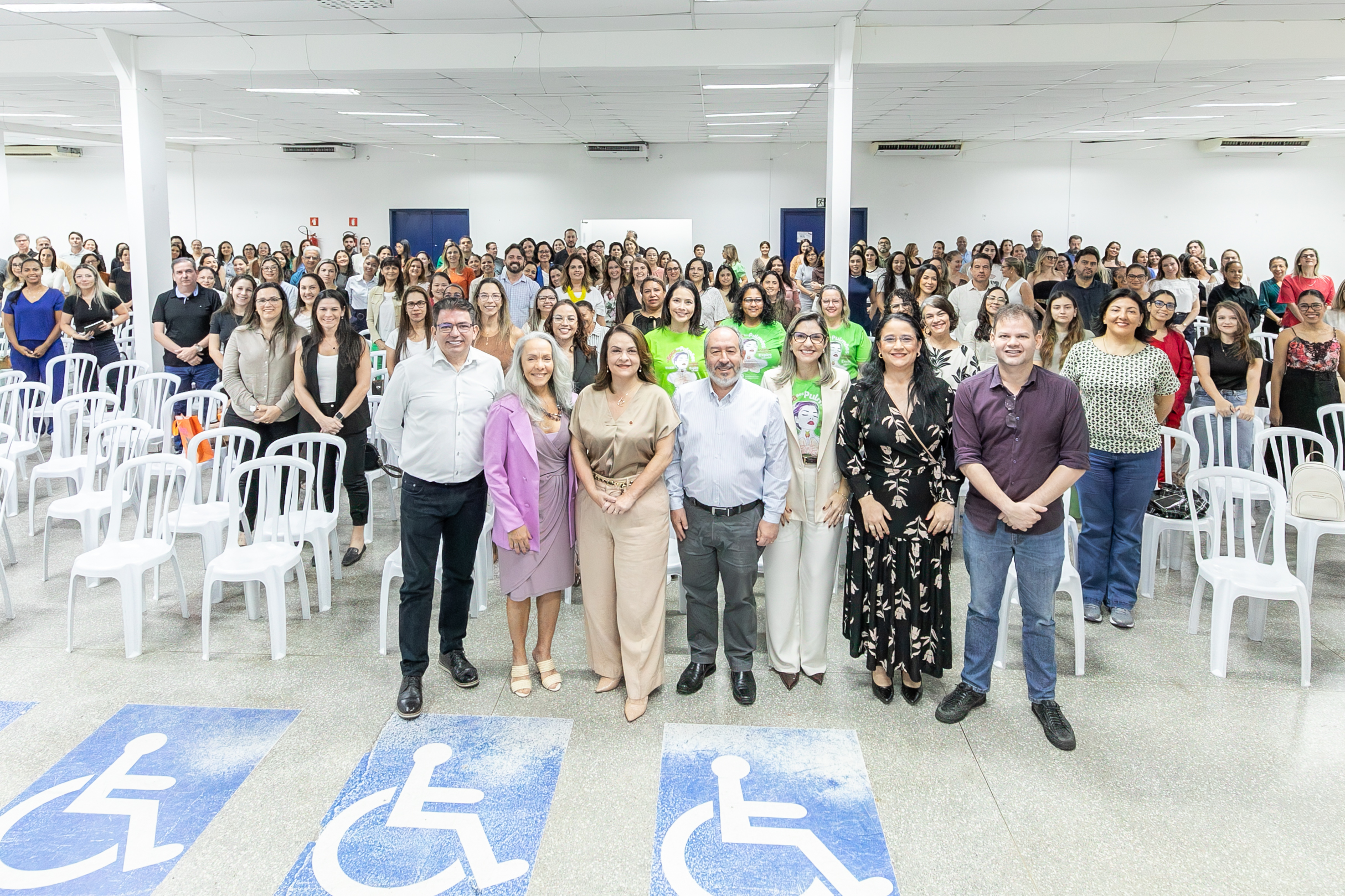 A imagem mostra um grupo de pessoas participando de uma palestra de capacitação dos servidores da Saúde de Cuiabá. À frente, estão as autoridades que compõem a mesa diretora, e ao fundo, os demais servidores que receberam a capacitação.