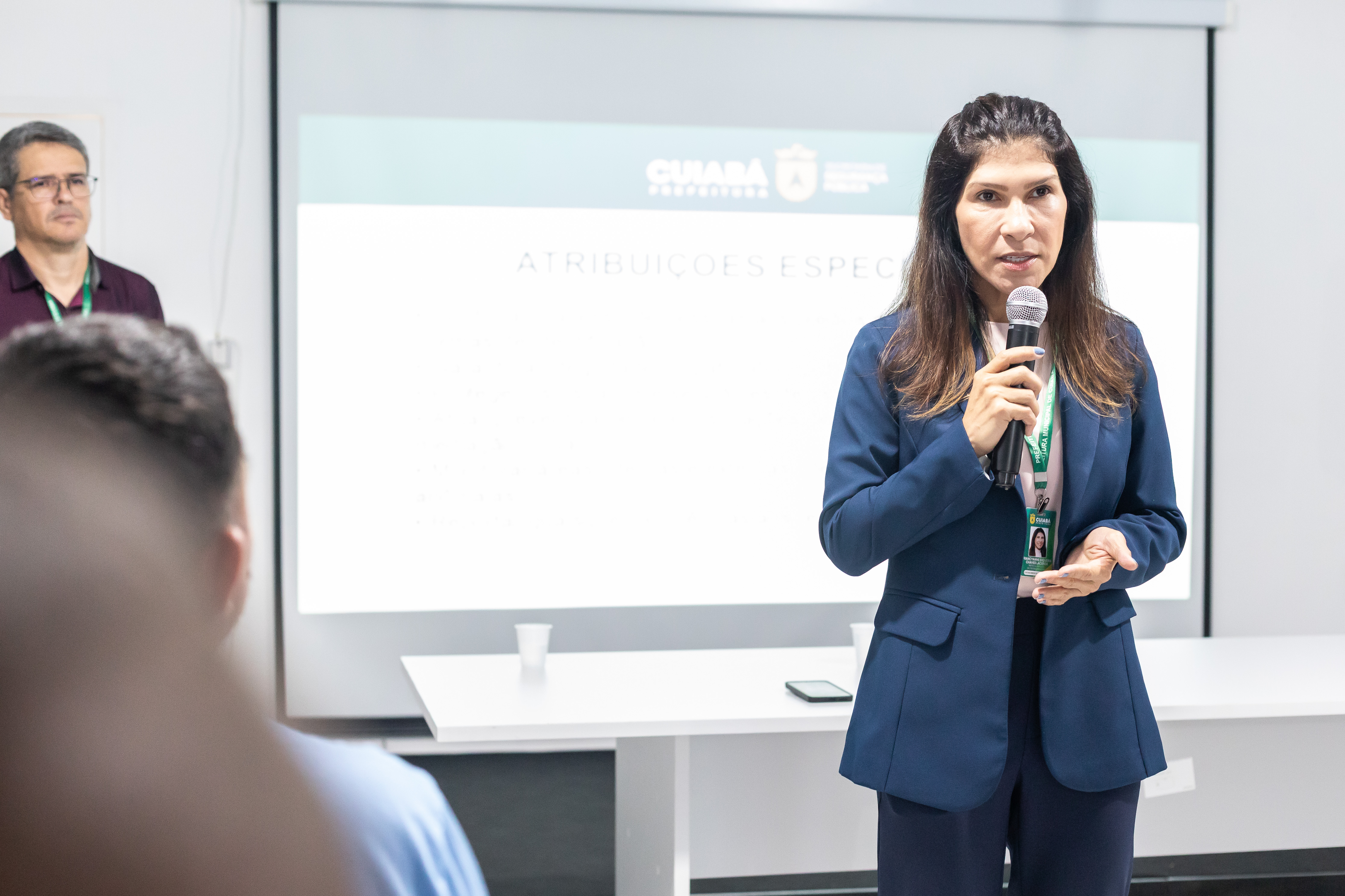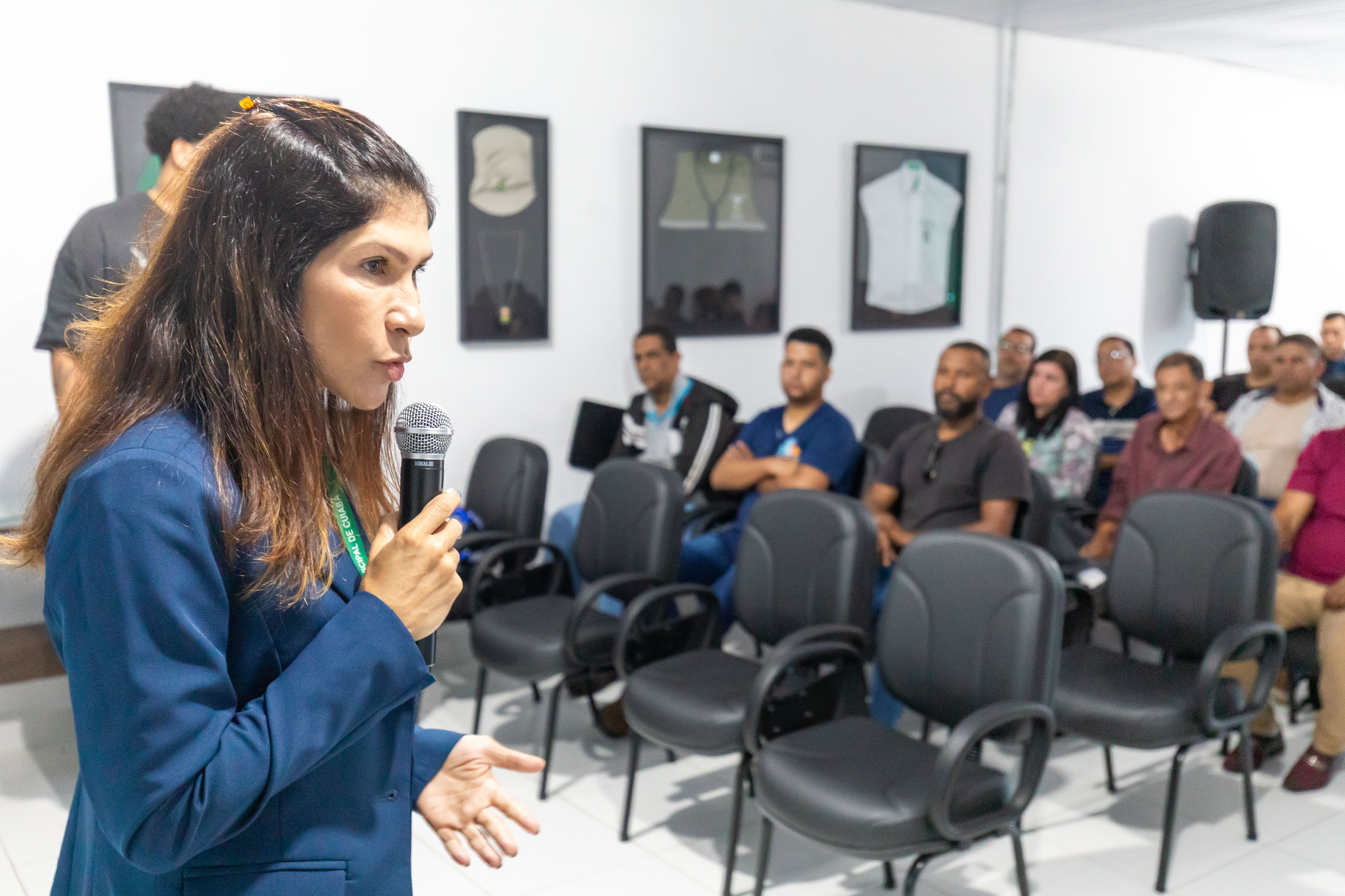 A imagem mostra a secretária municipal de Segurança Pública, coronel Francyanne Lacerda, durante a capacitação dos vigilantes da Secretaria de Saúde de Cuiabá.