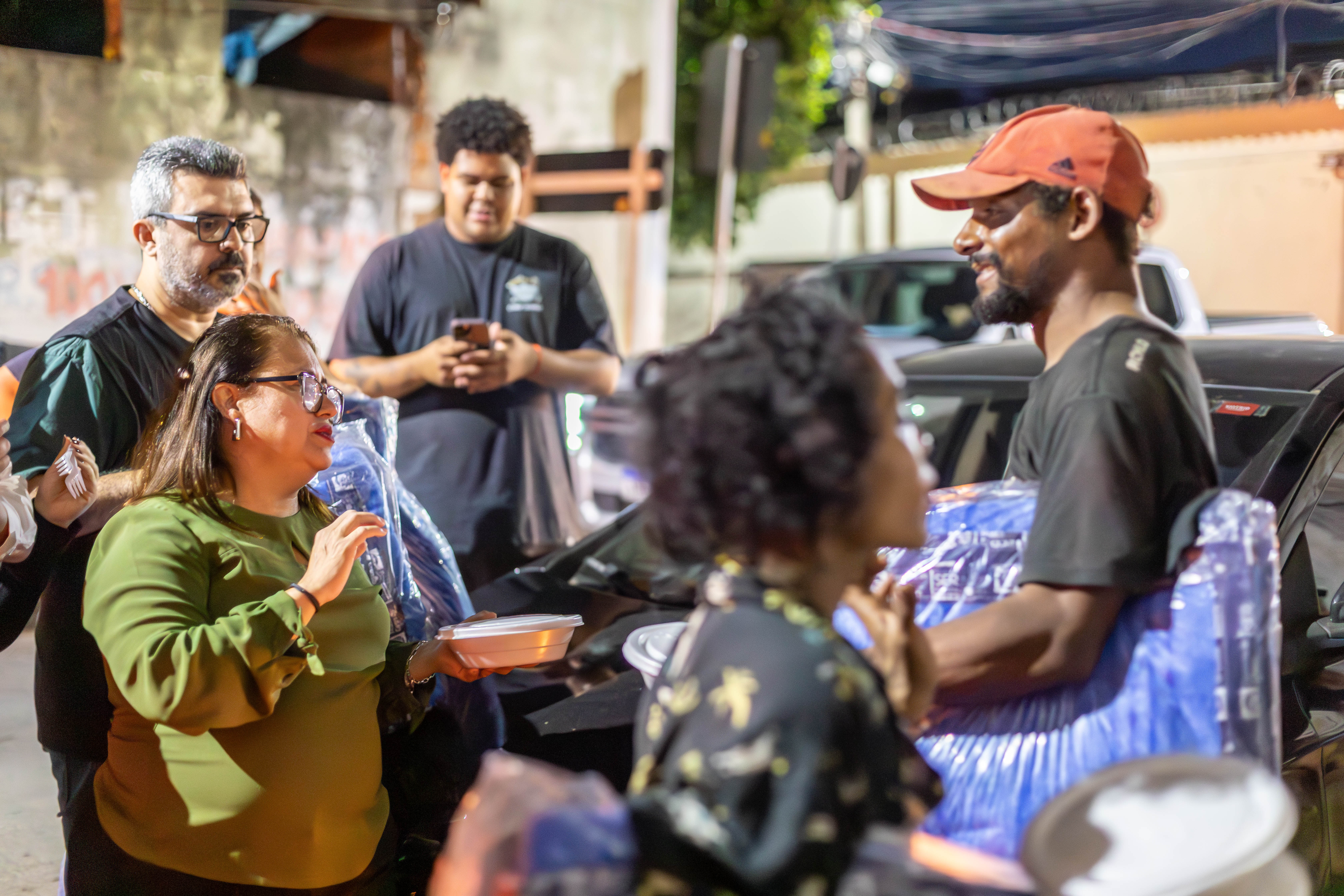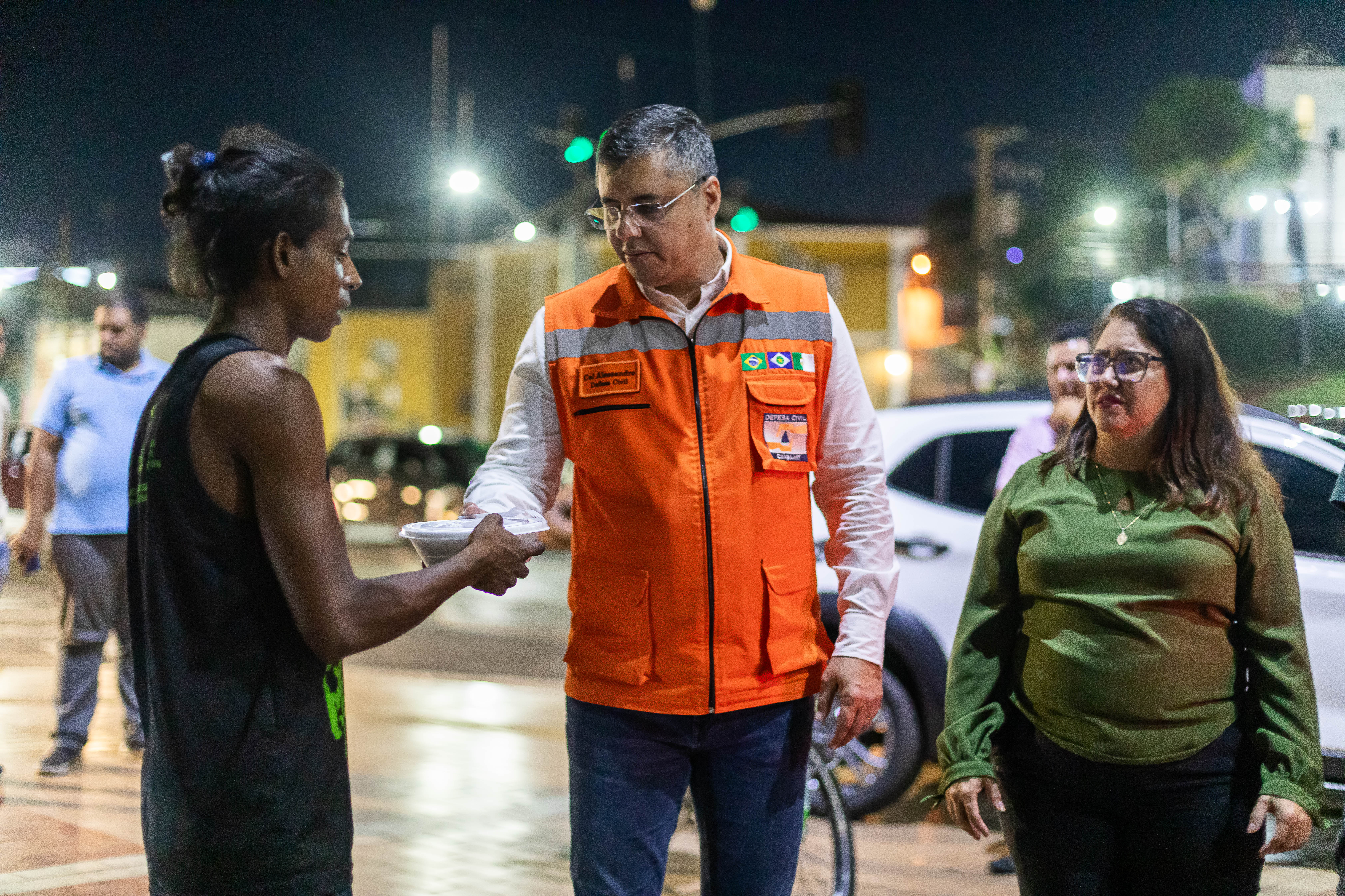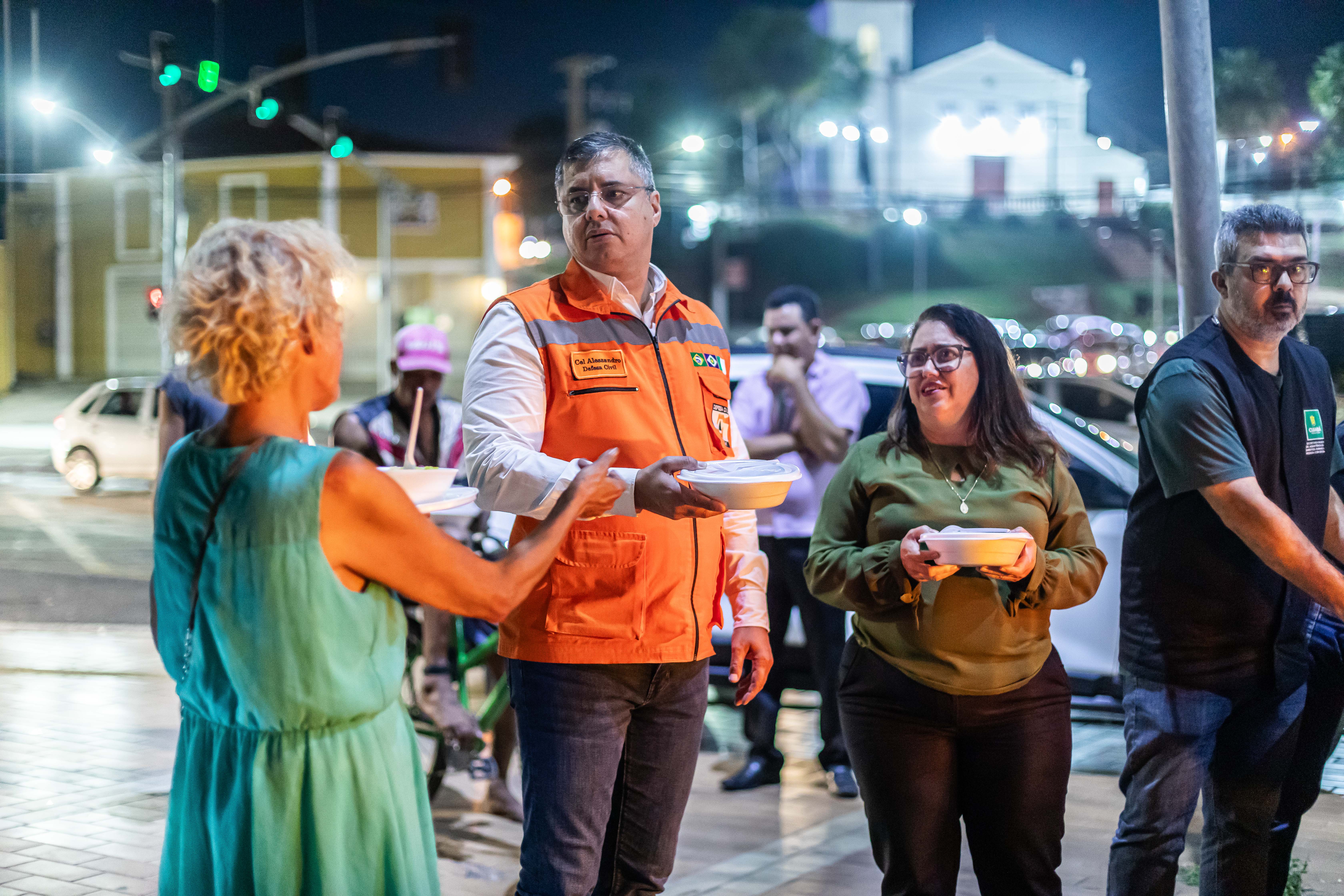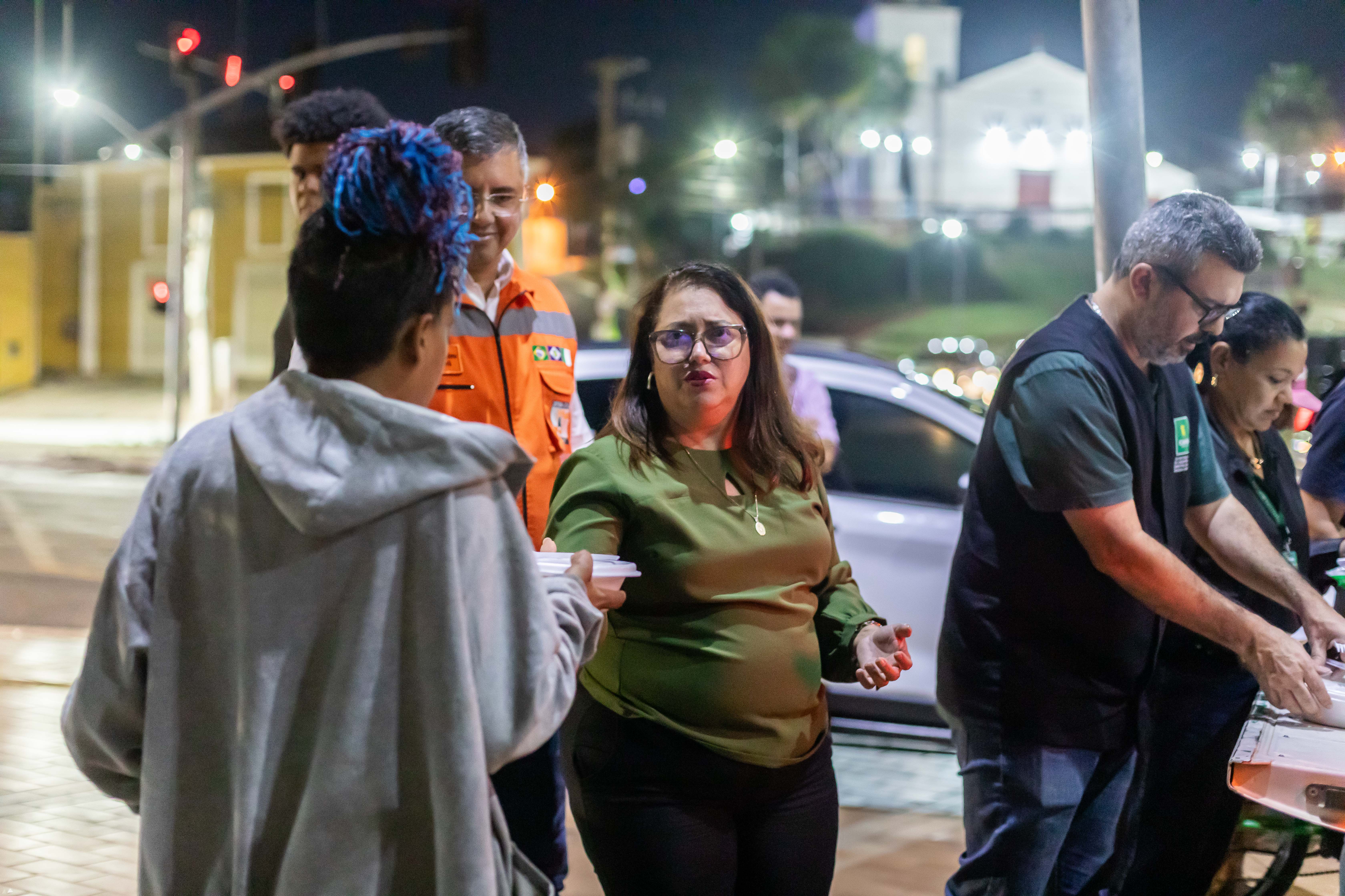 A foto ilustra a secretaria municipal de Assistência Social, Helida Vilela, numa praça pública, entregando muma marmita a um morador em situação de rua.