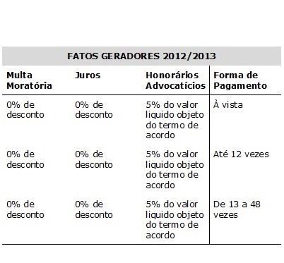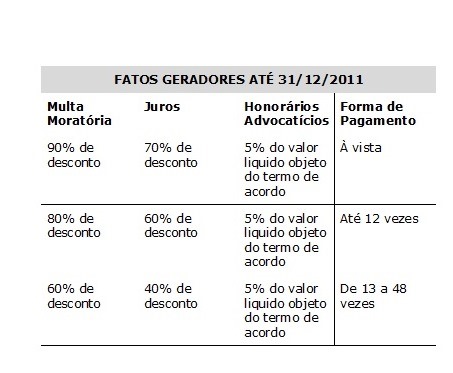 Quem tem débitos com a prefeitura até 31 de dezembro de 2011, poderá obter até 90% de desconto sobre a multa moratória e70% nos juros, se optar pelo pagamento à vista. A opção em até 12 meses dá 80% de desconto na multa moratória e 60 nos juros. (Confira a tabela no arquivo anexo abaixo).
