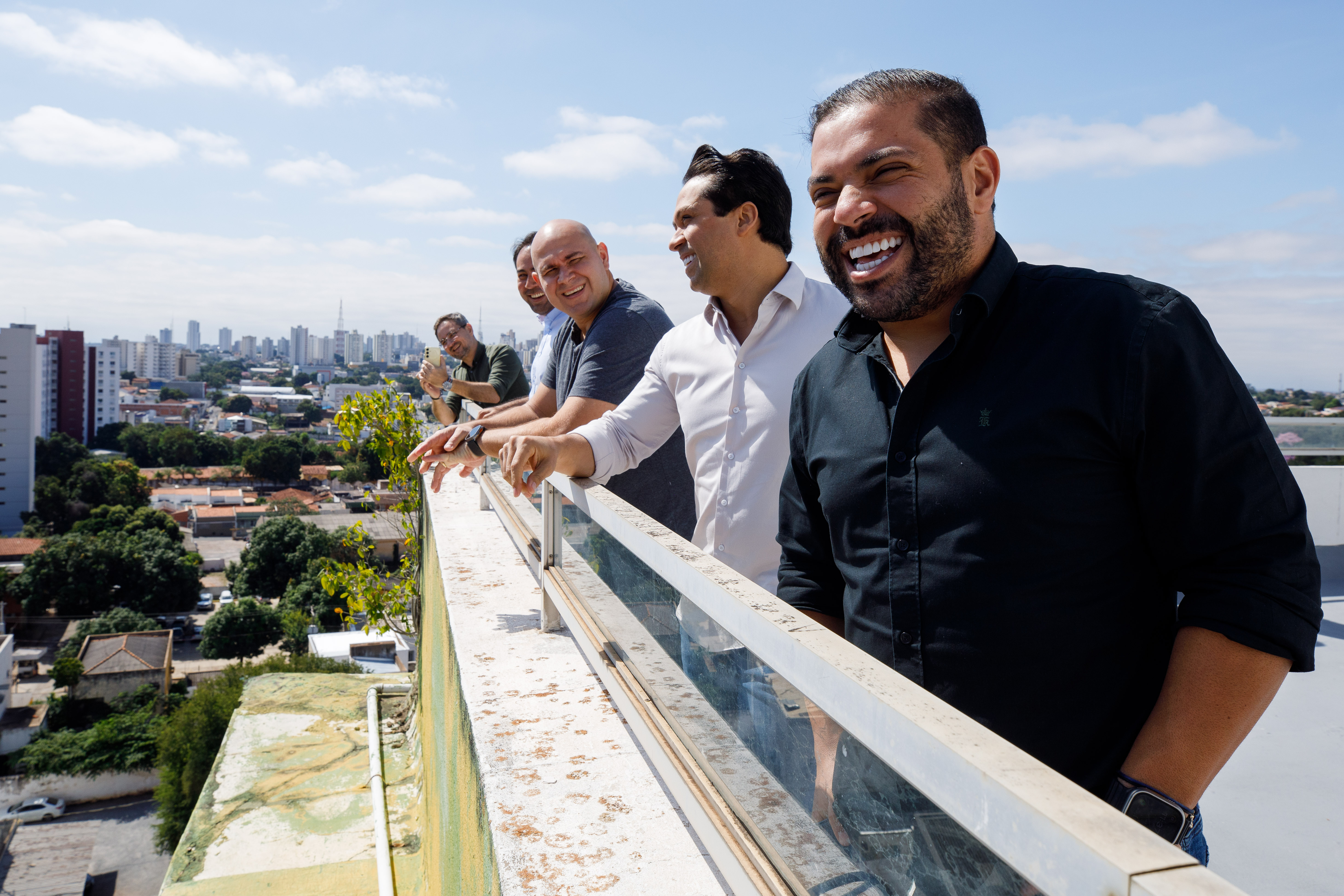 A imagem mostra o prefeito de Cuiabá, Abilio Brunini, ao lado do organizador Elson Ramos e secretários municipais, durante reunião no terraço do Palácio Alencastro.