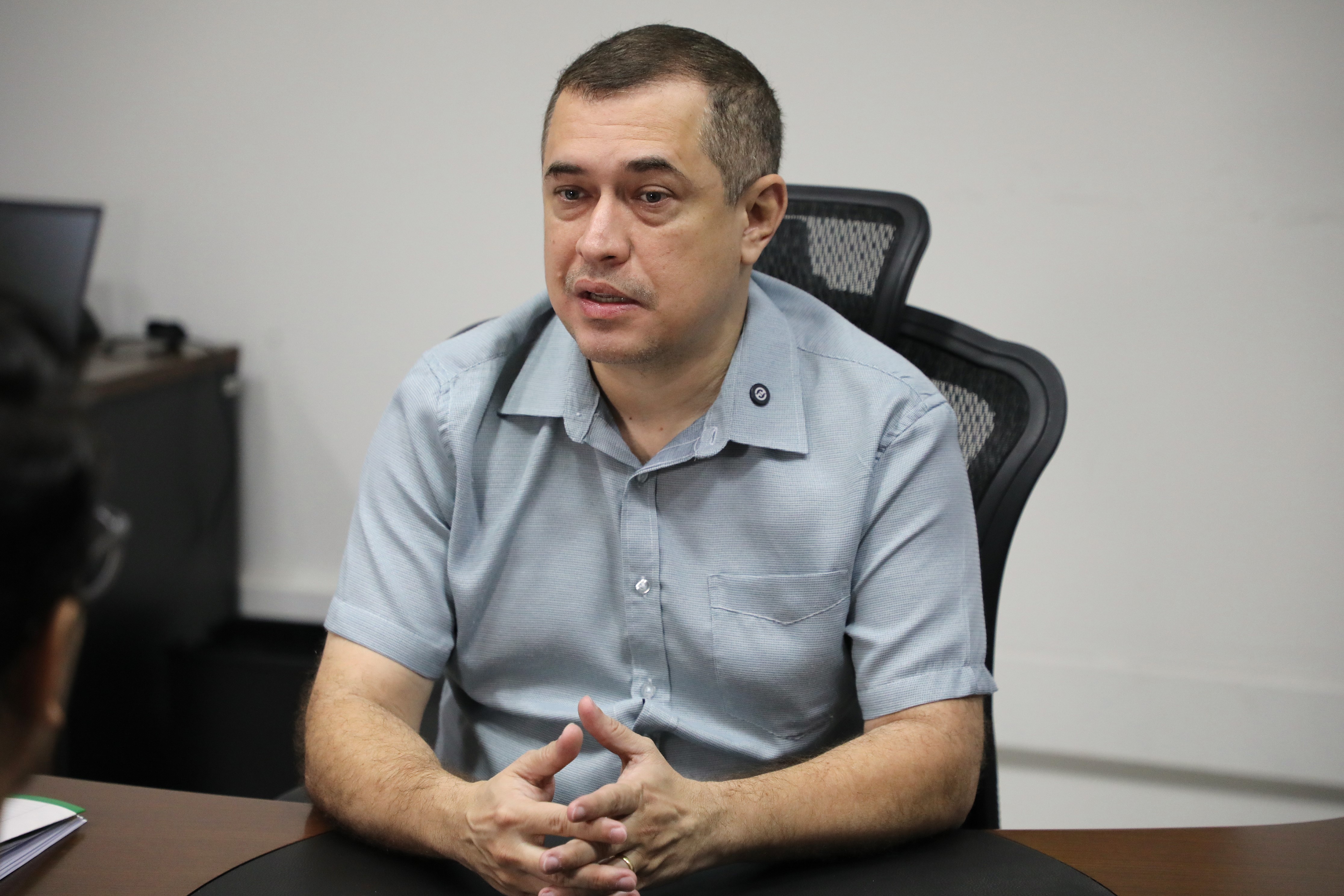 A foto ilustra o secretário Marcelo Bussiki, vestido com camisa azul clara, sentado numa cadeira de cor preta, prestando explicações numa entrevista.