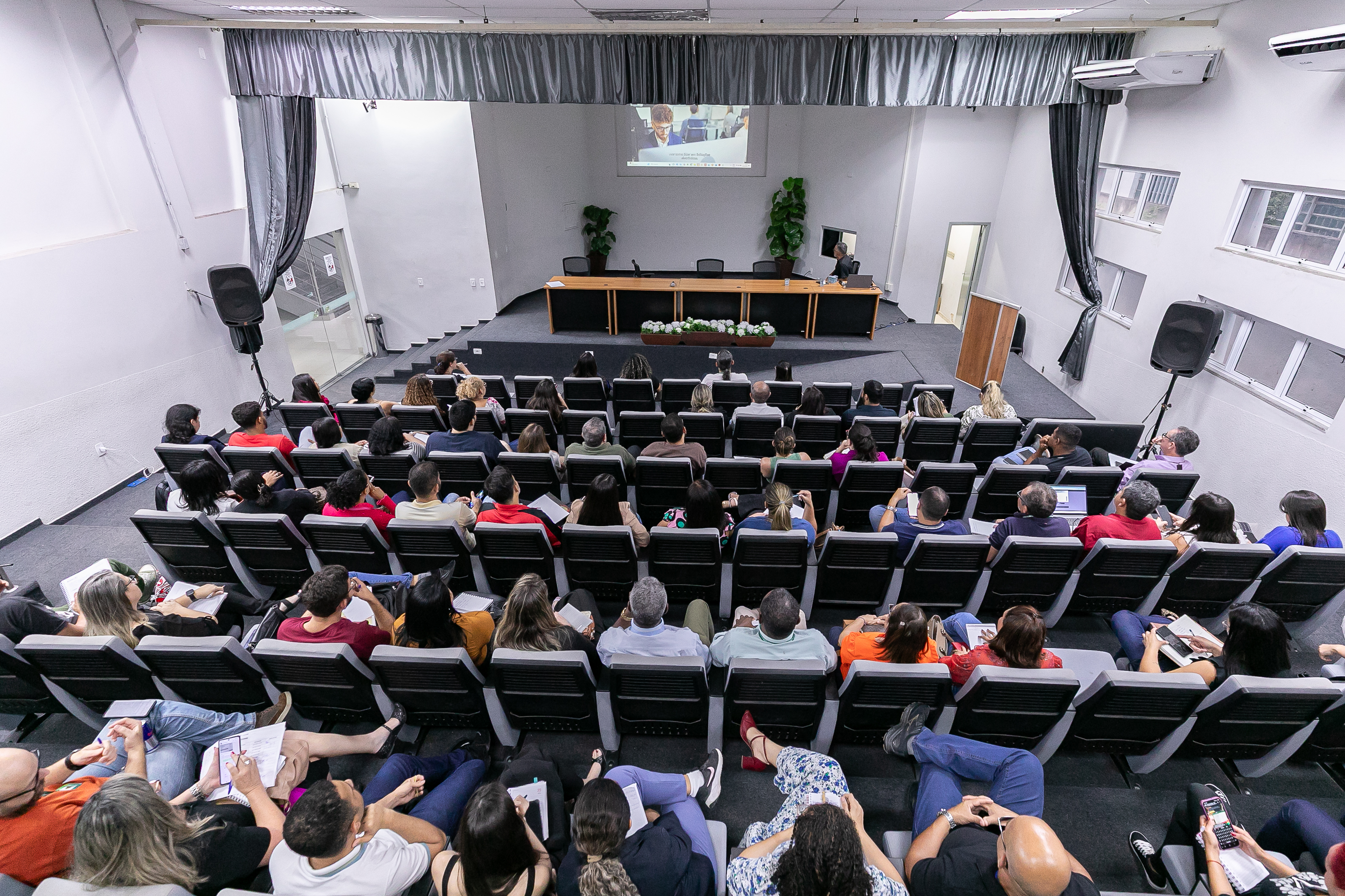 A imagem mostra os servidores da área de licitações no auditório da Secretaria Municipal de Educação durante o curso.