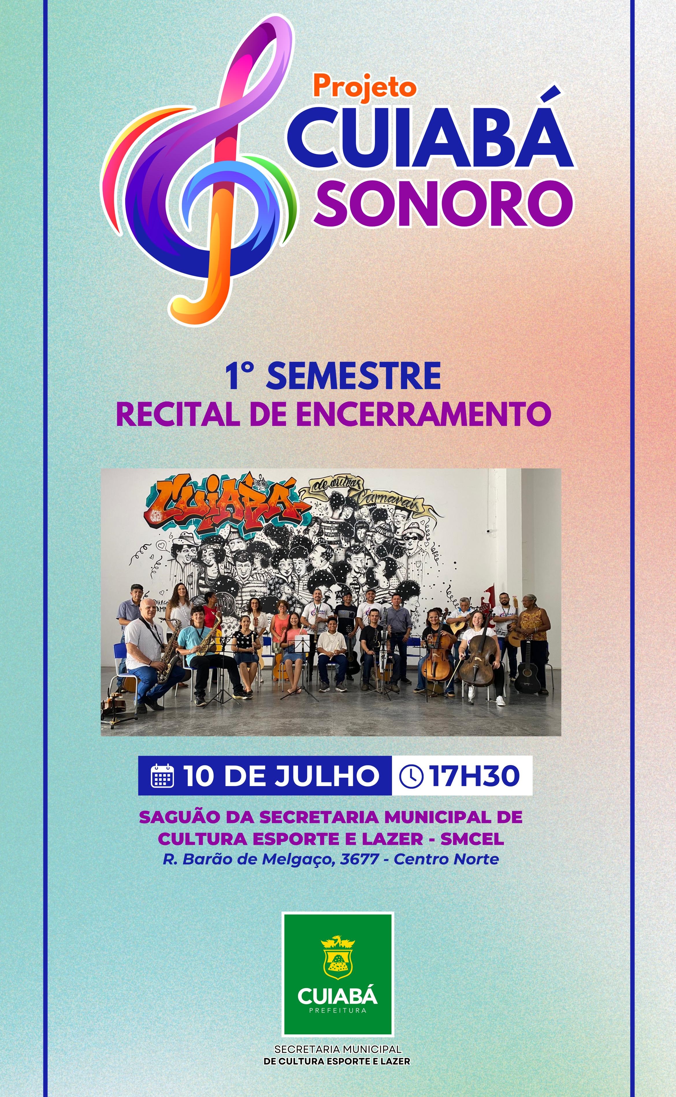 A Prefeitura de Cuiabá, por meio da Secretaria Municipal de Cultura, Esporte e Lazer, convida para o Recital de Encerramento do 1º semestre das atividades do Projeto Cuiabá Sonoro. O evento acontece nesta quarta-feira (10), a partir das 17h30, no saguão da Secretaria. A entrada é gratuita. O público terá a oportunidade de apreciar uma variedade de estilos musicais, todos apresentados pelos alunos do projeto.