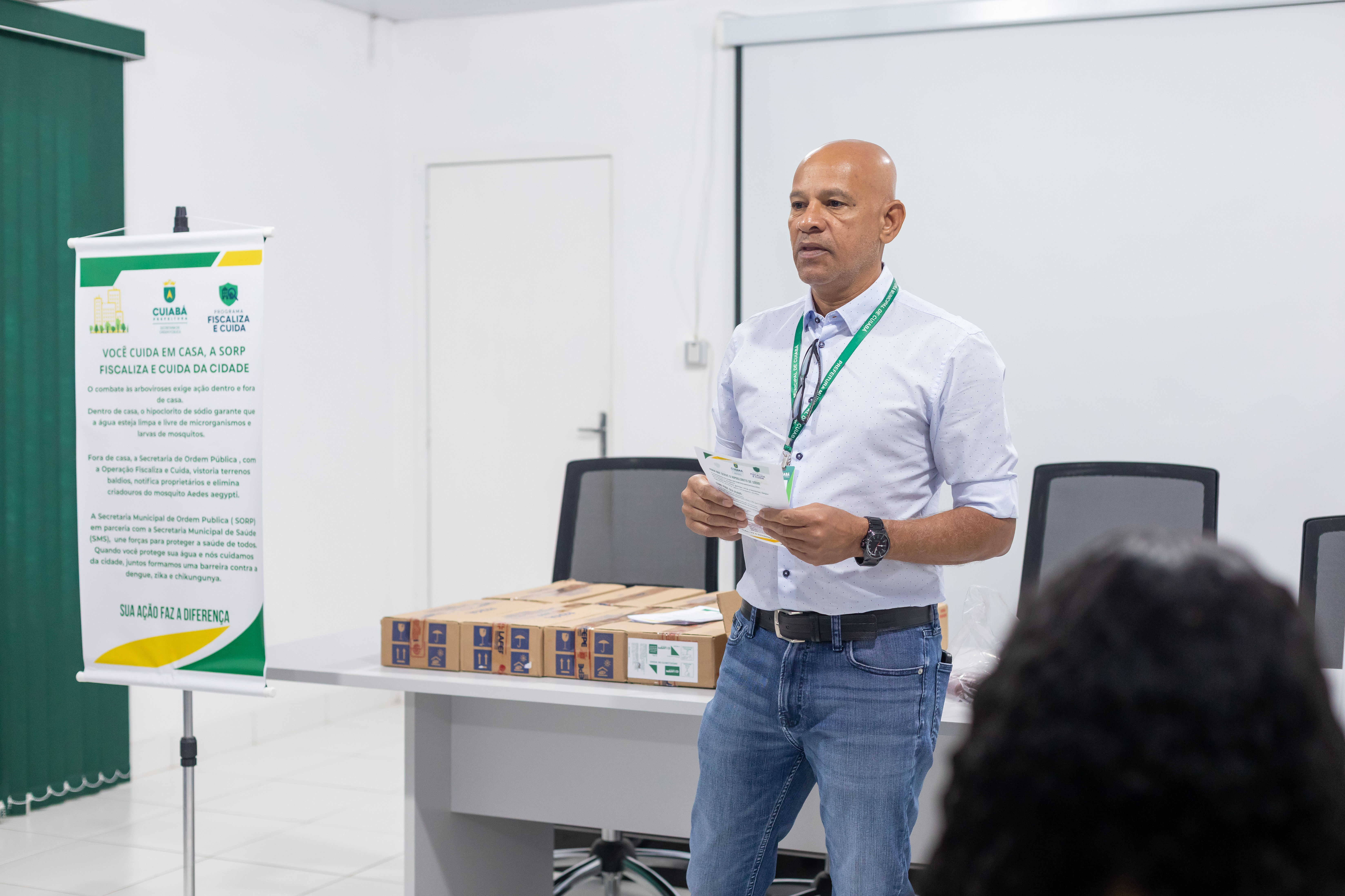 A foto ilustra o momento da entrega gratuita de hipoclorito de sódio e folders informativos aos servidores da Secretaria de Ordem Pública de Cuiabá.