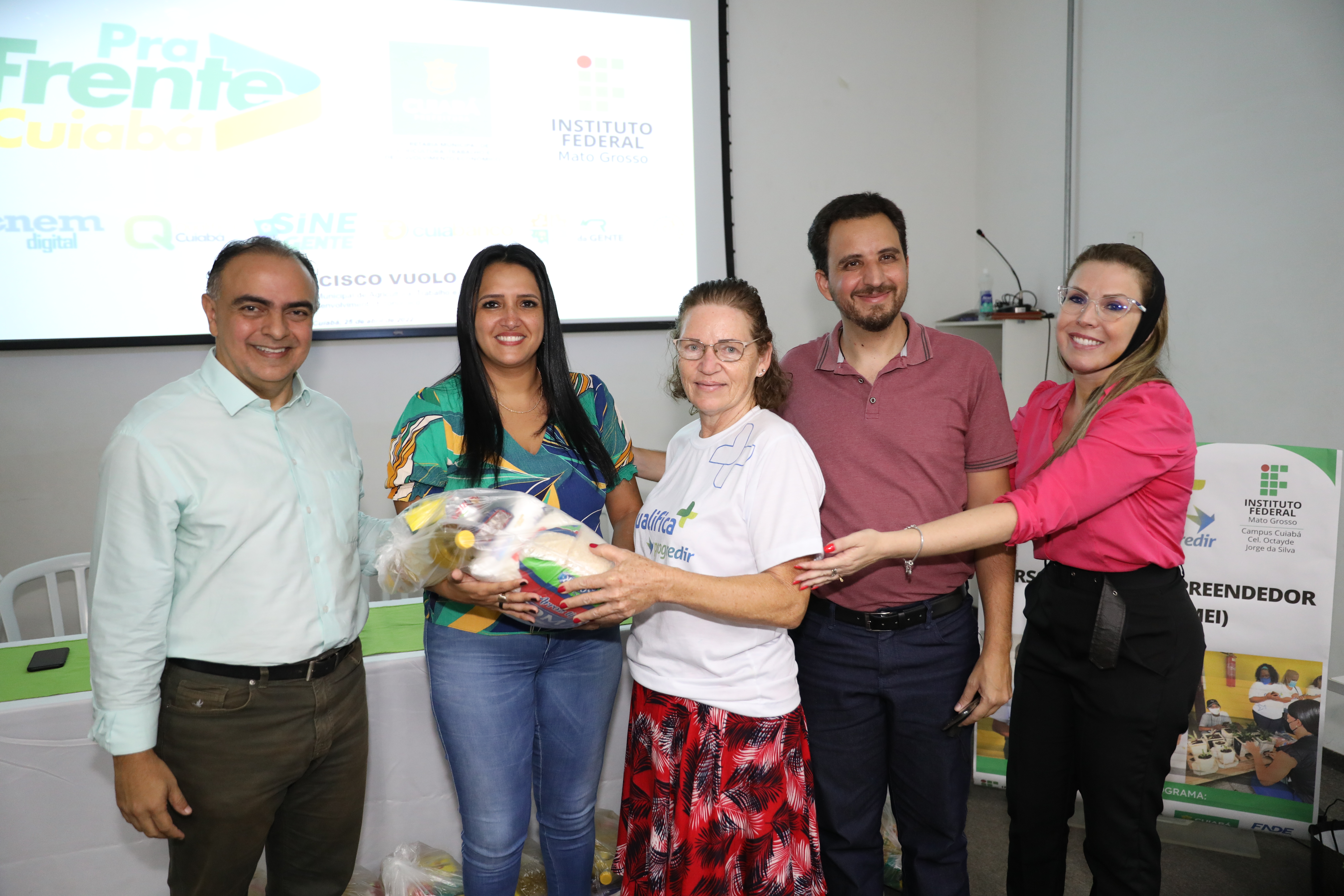A Prefeitura de Cuiabá entregou nesta segunda-feira (25) cestas básicas aos alunos do programa “Qualifica mais Progredir” que alcançaram 75% de presença durante o primeiro mês de curso. A entrega foi realizada no auditório do Instituto Federal de Mato Grosso (IFMT) e contemplou 25 pessoas.