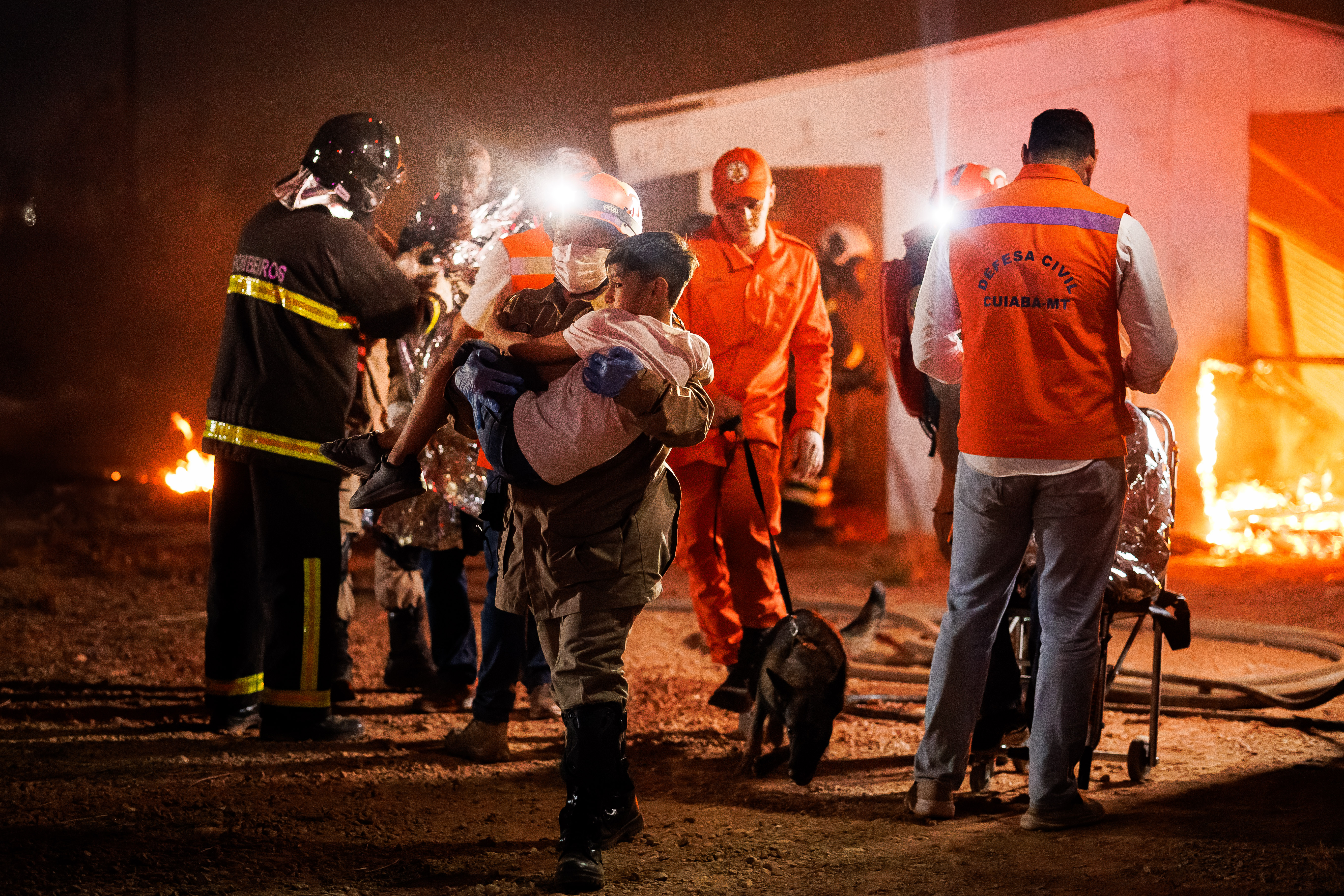 A imagem que ilustra a matéria mostra um treinamento de combate e prevenção a incêndios com atuação conjunta da Defesa Civil Municipal, Bombeiros e brigadistas.