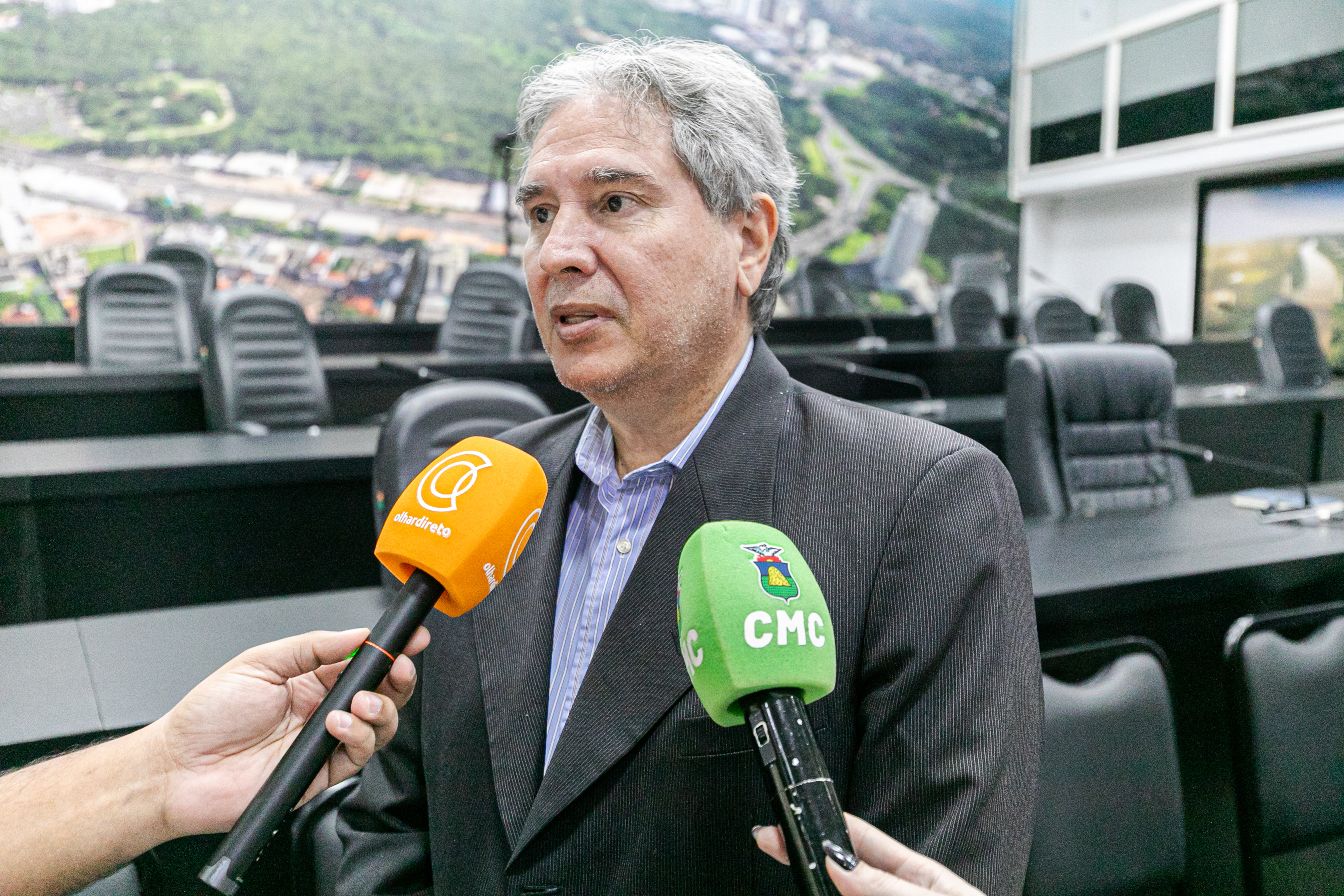 A foto mostra o secretário de Planejamento, Nivaldo Carvalho, vestido com traje social, concedendo entrevista a veículos de comunicação. O ambiente é o plenário da Câmara Municipal de Cuiabá. Ao fundo, é possível visualizar mesas pretas e cadeiras estofadas na cor preta.