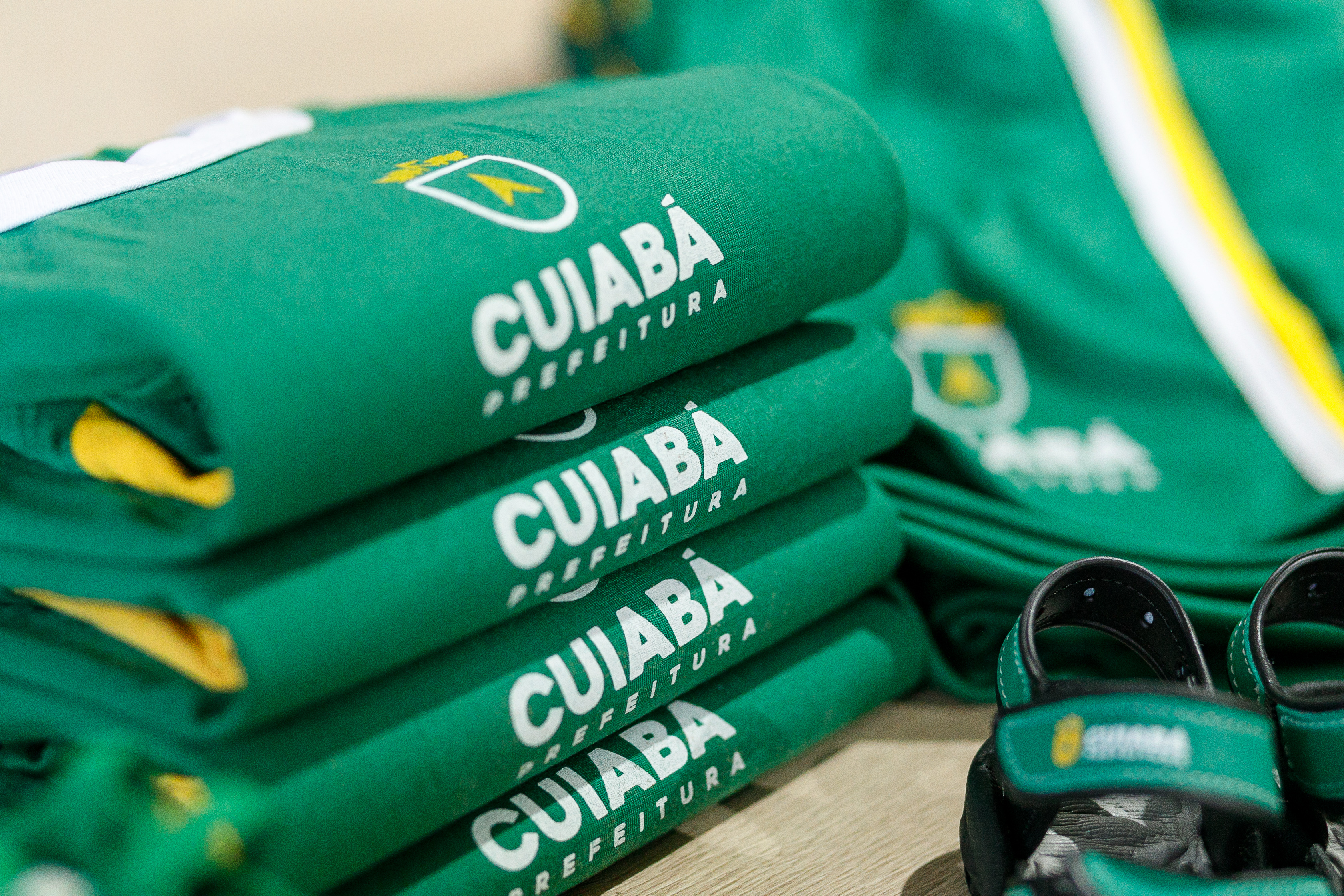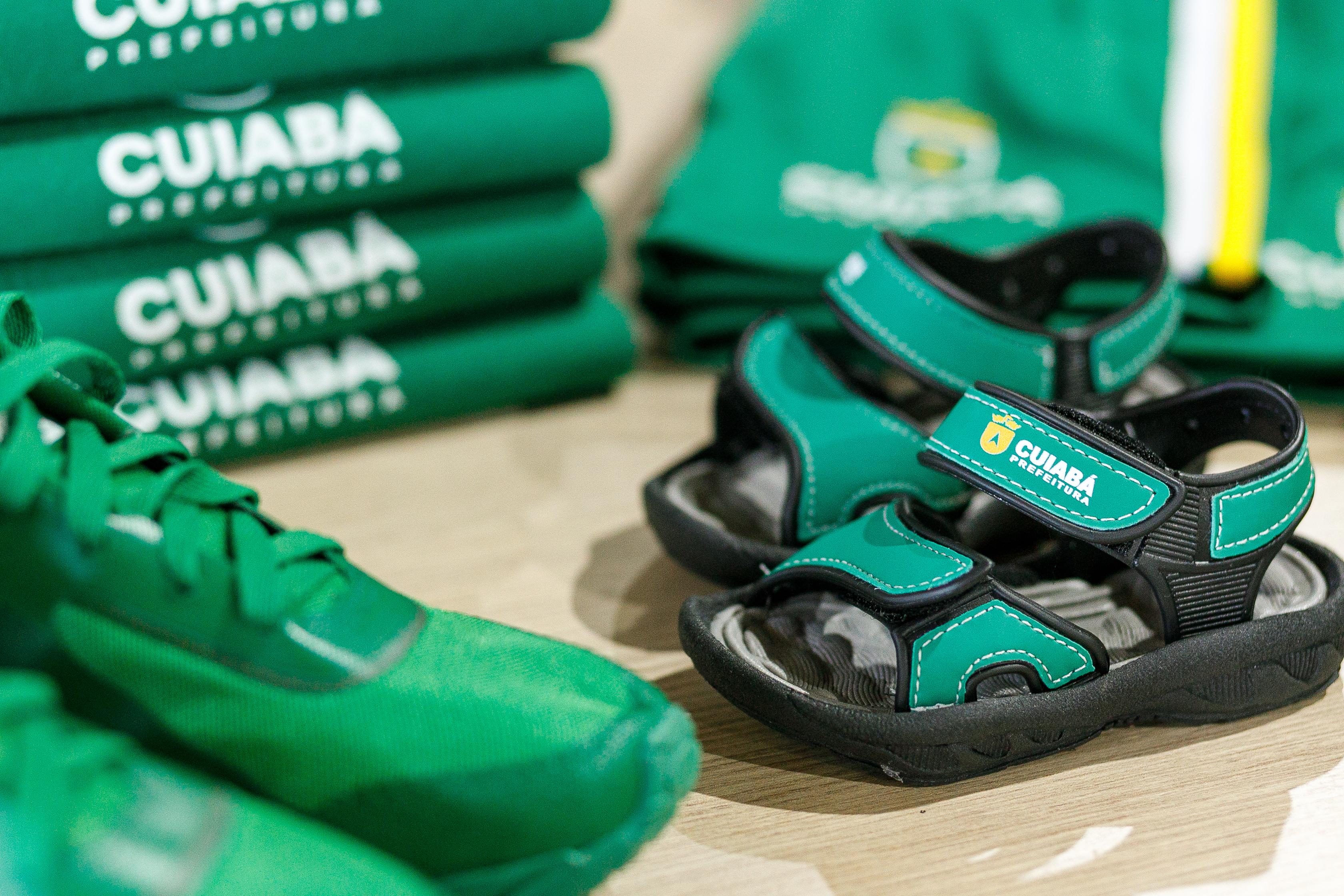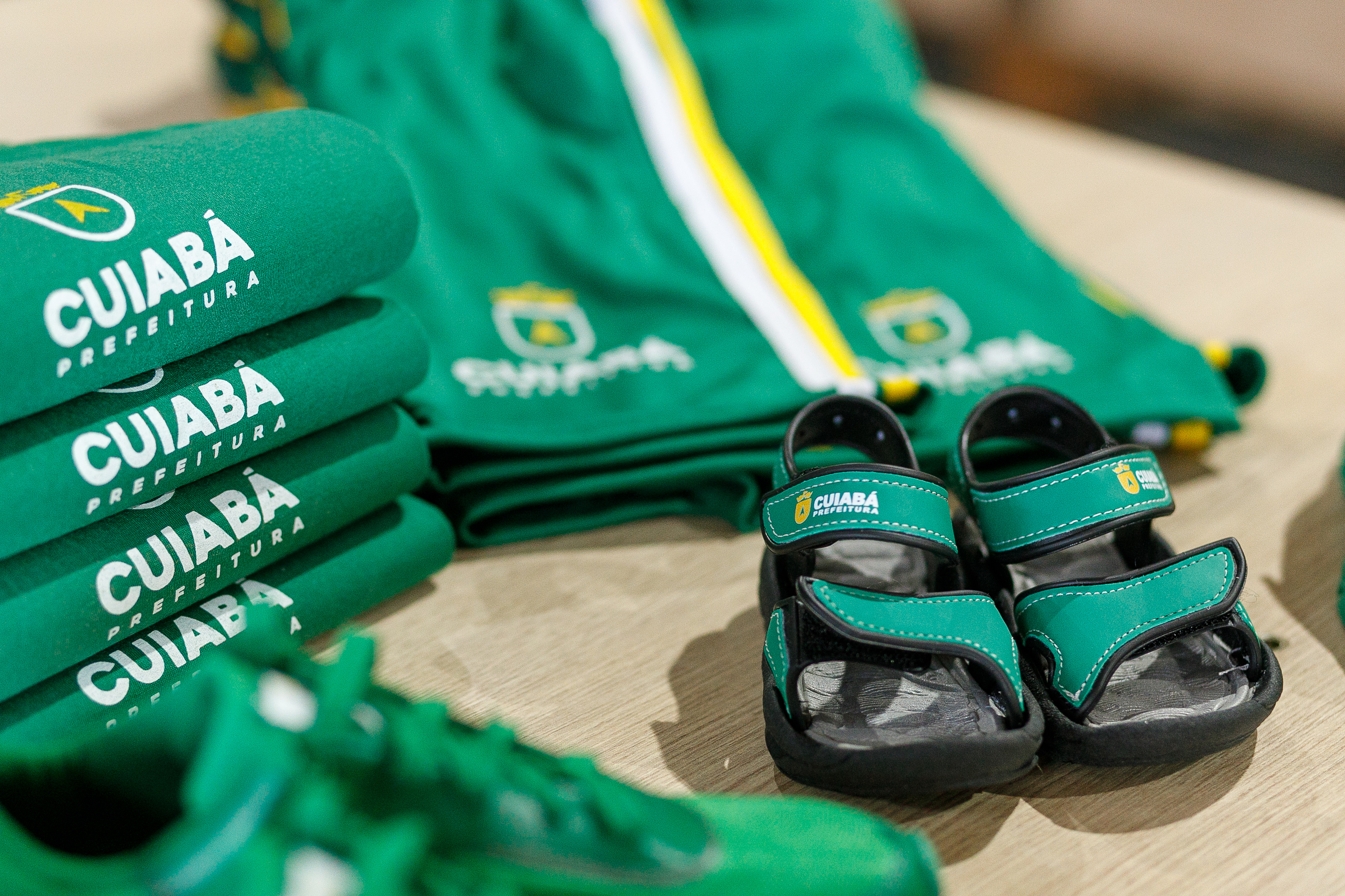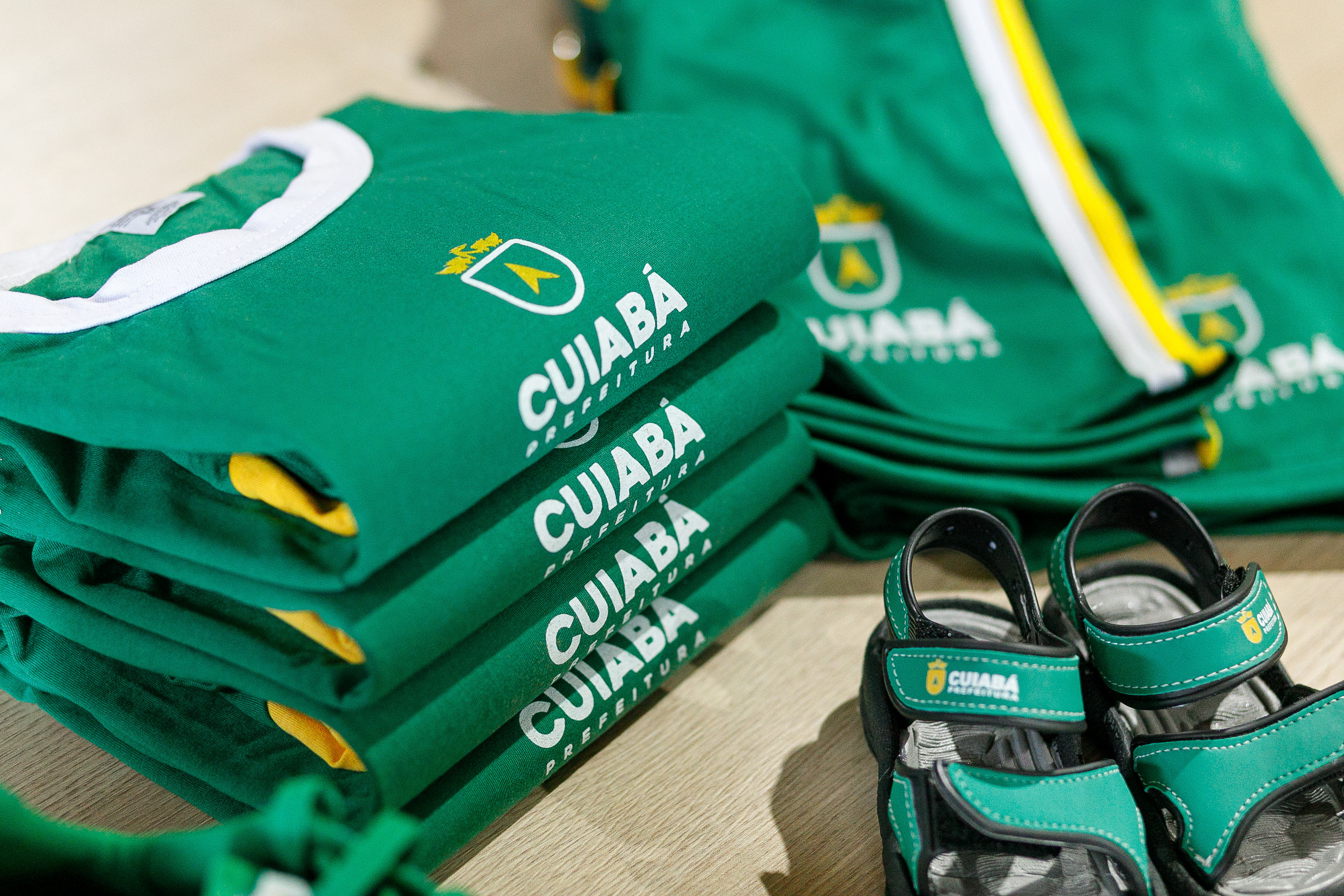 A matéria é ilustrada com camisas de cor verde que exibem o brasão do município com letras brancas escritas "Cuiabá Prefeitura". Todas as camisas estão dobradas. Ainda é exibido um short e uma sandália que compõem o uniforme escolar.