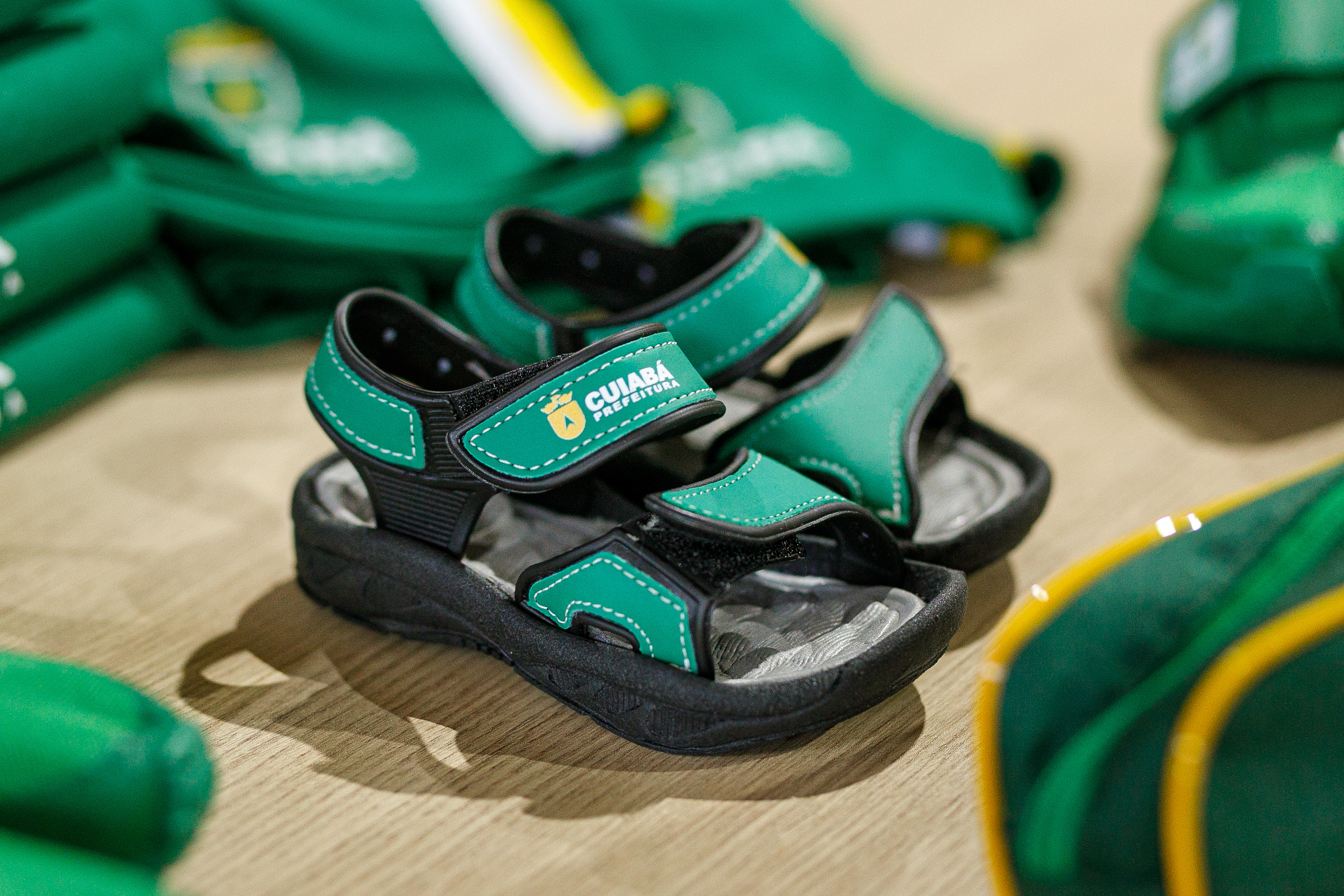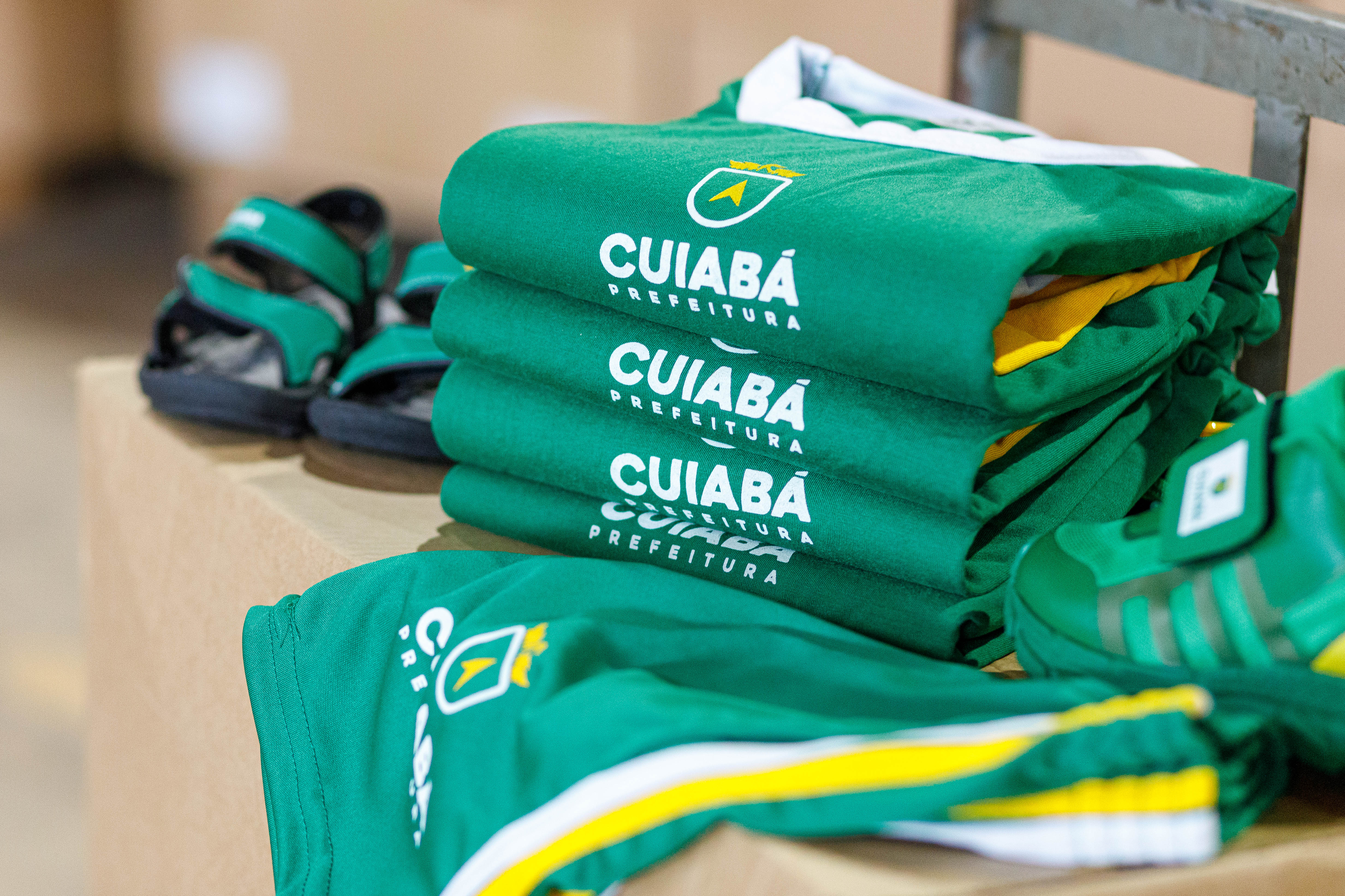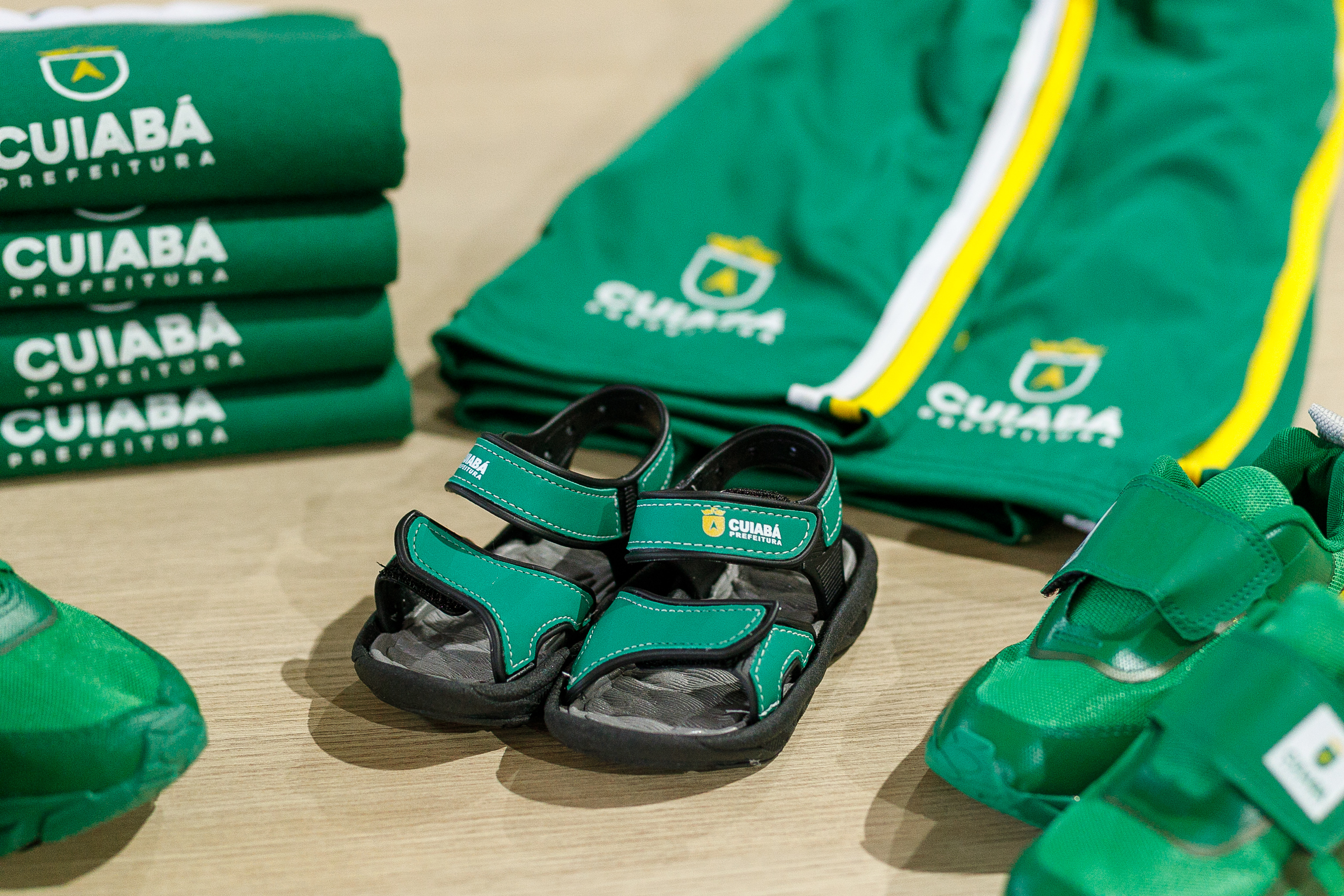 A matéria é ilustrada com camisas de cor verde que exibem o brasão do município com letras brancas escritas "Cuiabá Prefeitura". Todas as camisas estão dobradas. Ainda é exibido um short e uma sandália que compõem o uniforme escolar.