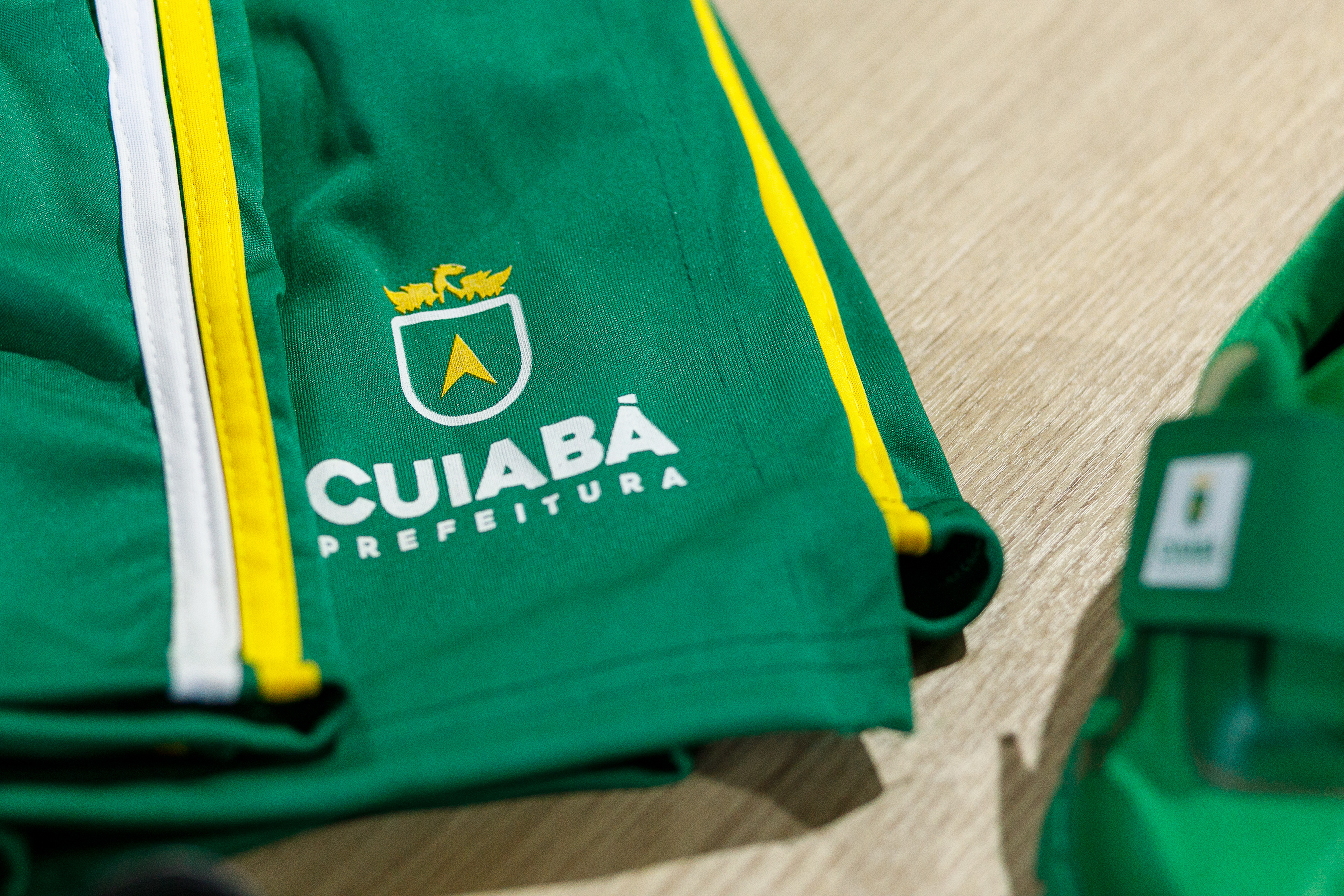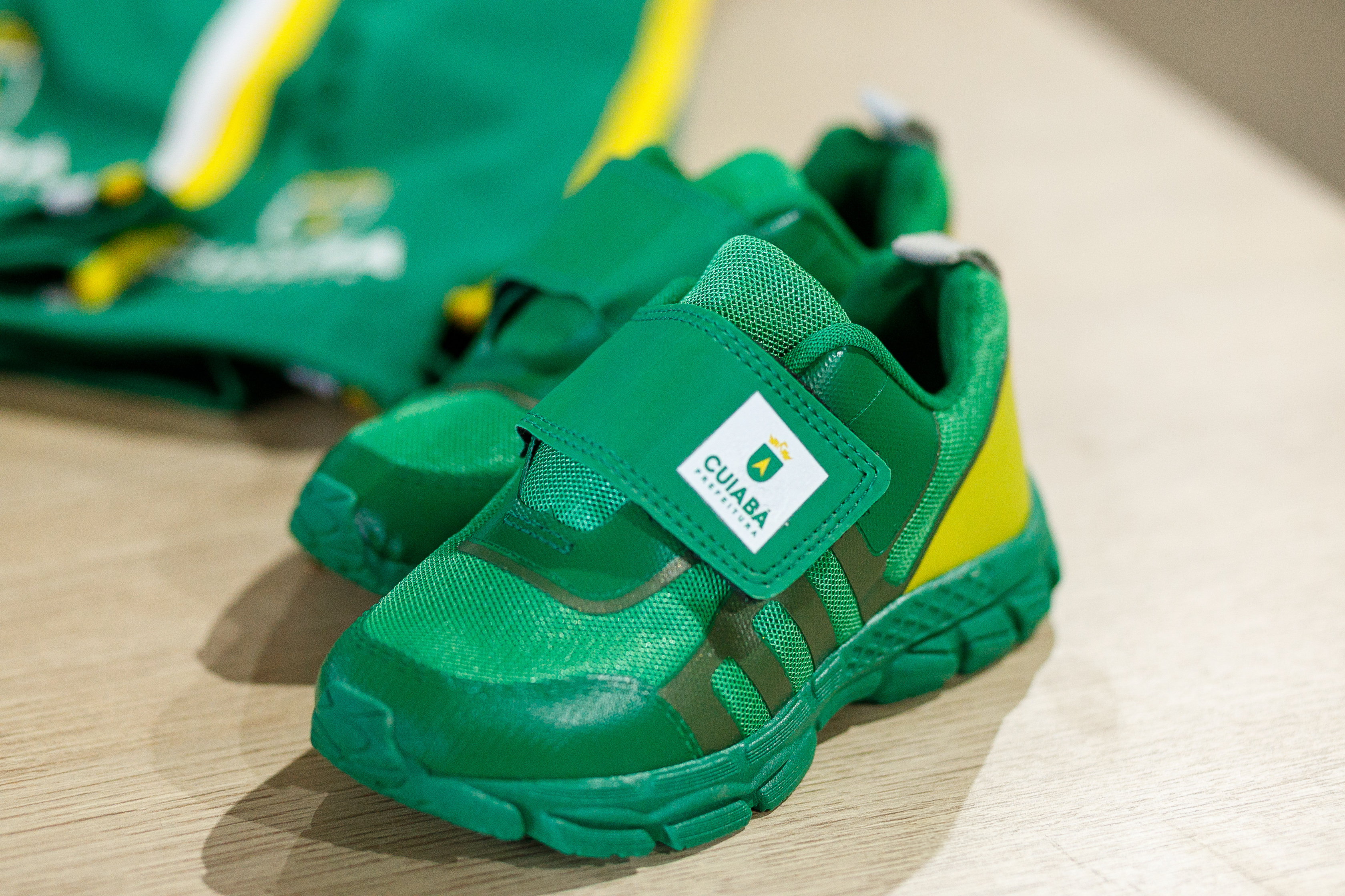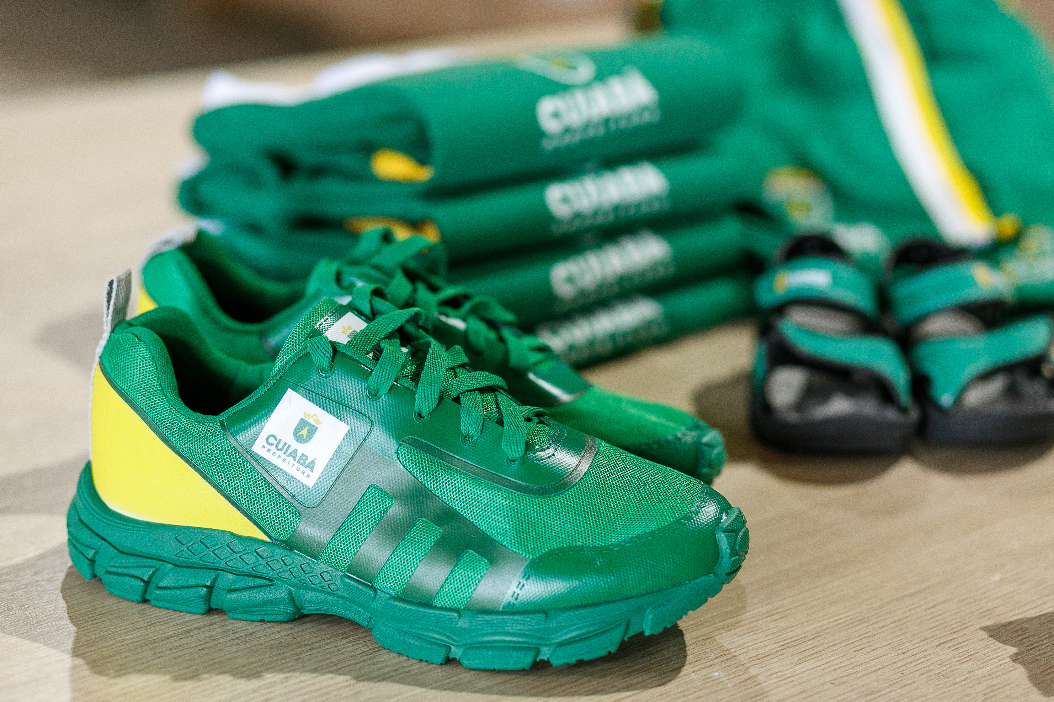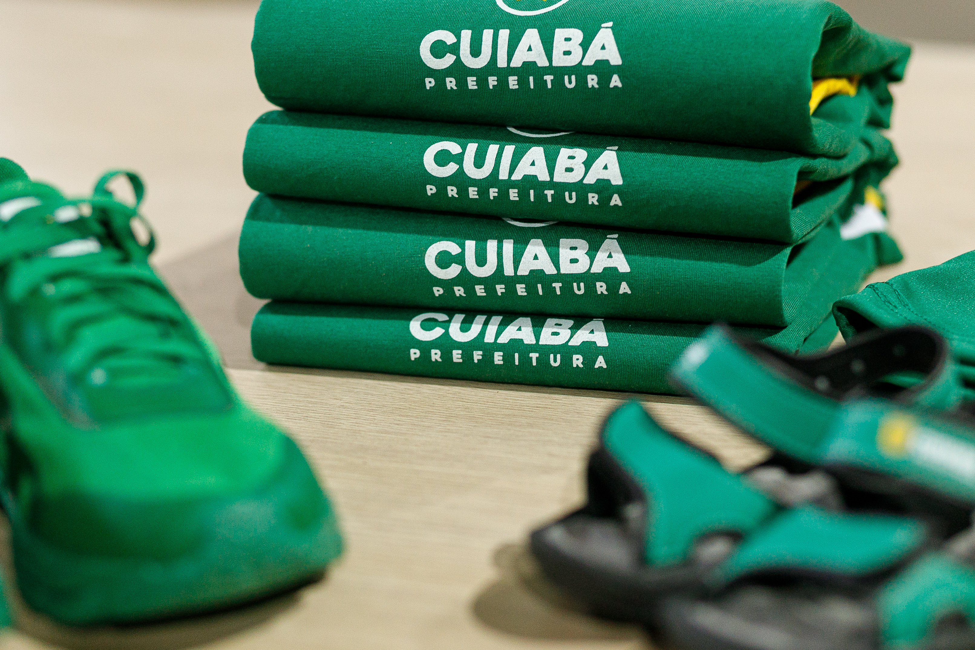 A matéria é ilustrada com camisas de cor verde que exibem o brasão do município com letras brancas escritas "Cuiabá Prefeitura". Todas as camisas estão dobradas. Ainda é exibido um short e uma sandália que compõem o uniforme escolar.