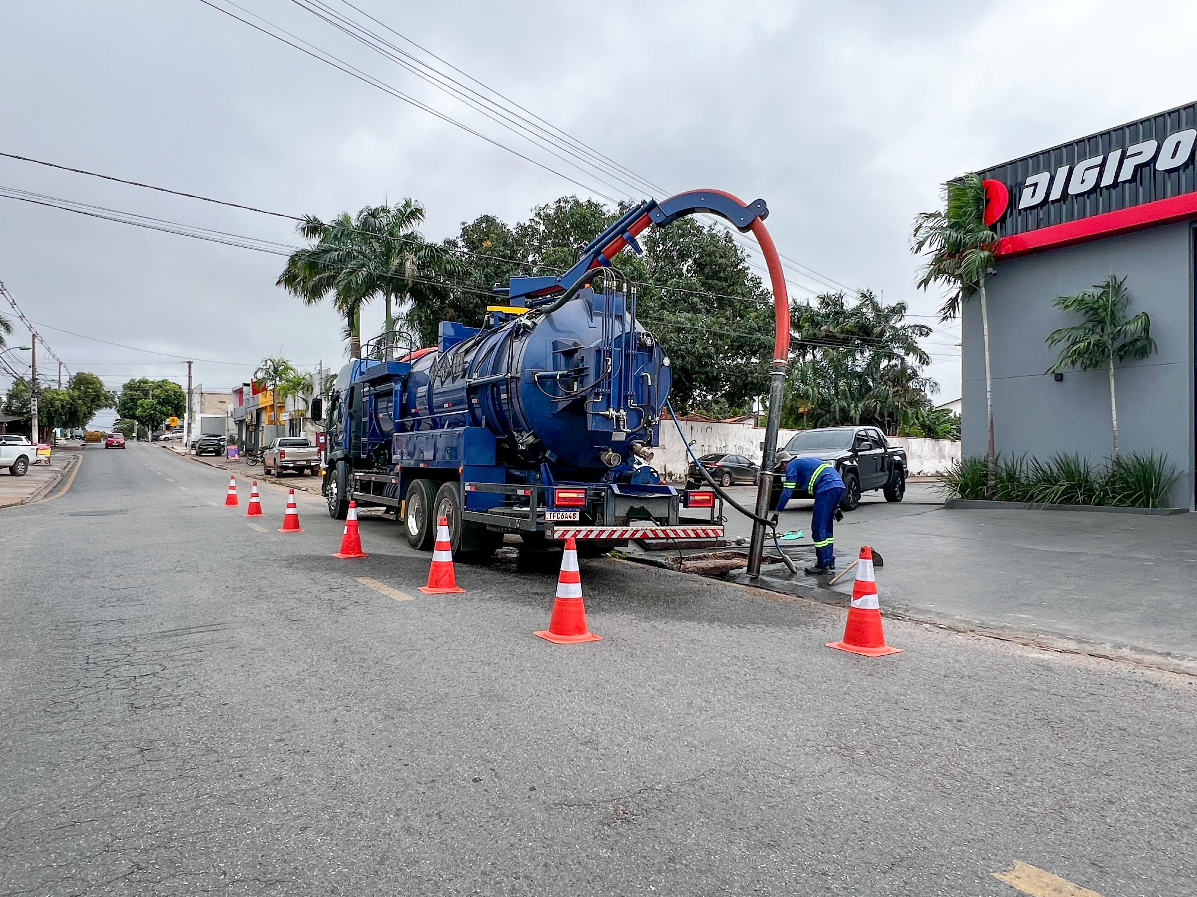 A operação envolveu uma equipe composta por quatro braçais, um encarregado, um operador de máquina, além dos motoristas do caminhão caçamba e do veículo hidrojato.