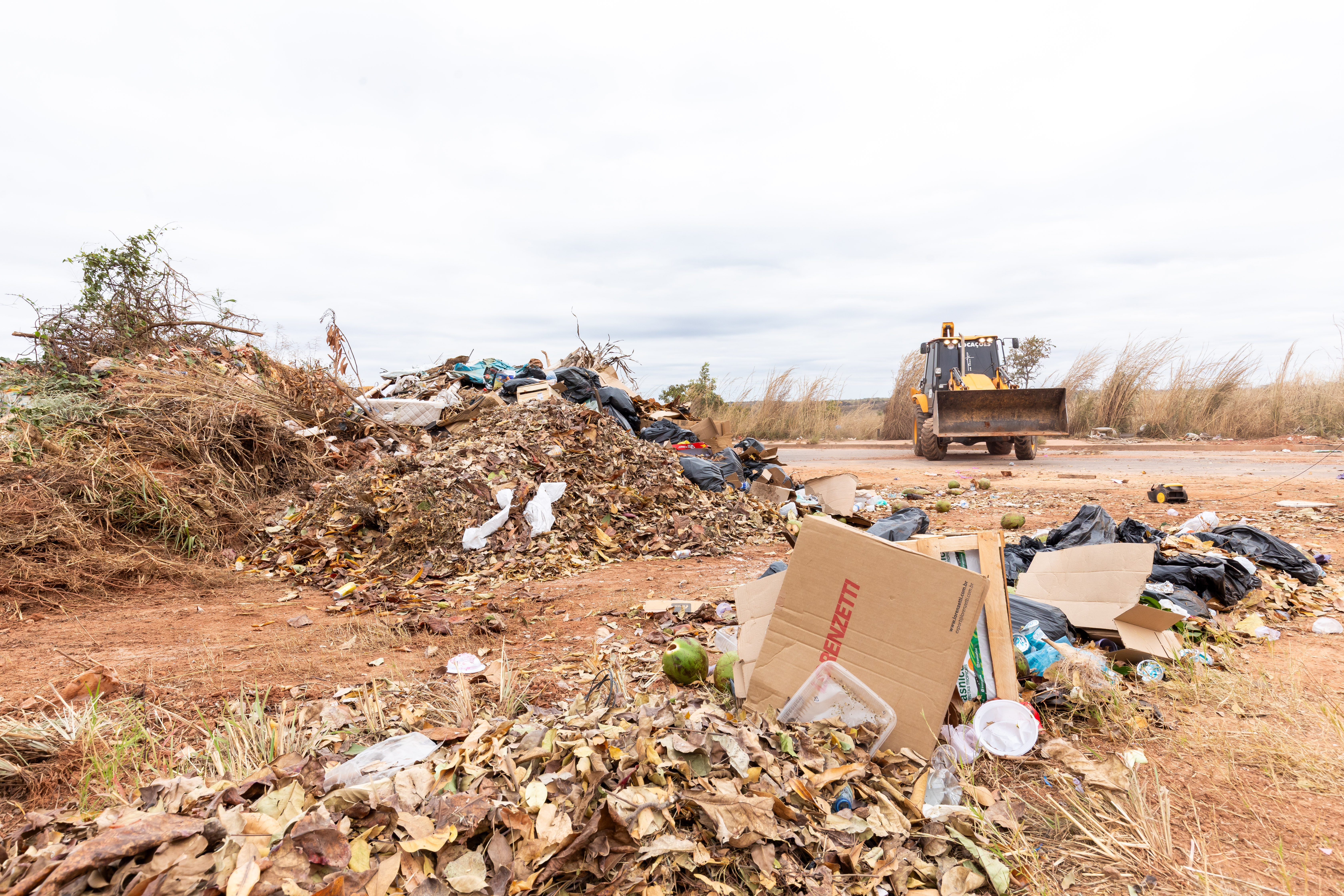 A imagem mostra um bolsão de lixo na avenida Contorno Leste. Ao fundo, uma pá carregadeira executa os serviços de recolhimento do material irregular.