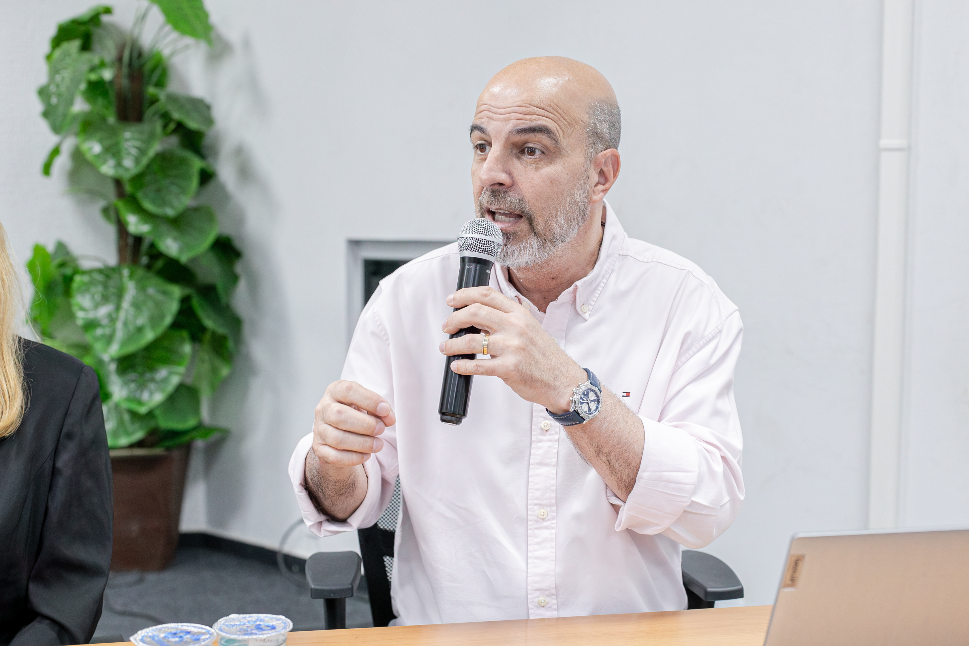 A foto ilustra o secretário Amauri Monge sentado à direita com microfone na mão. Do lado esquerdo, também sentados, está uma mulher e dois homens, todos vestidos com traje devidamente social.