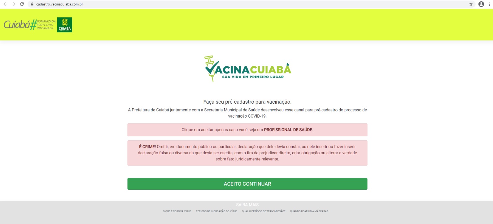 No entanto, com a disponibilização do pré-cadastro pelo site da Prefeitura de Cuiabá, a partir de agora, esses trabalhadores da saúde que estão na linha de frente que desejem se vacinar deverão se pré-cadastar pela internet, inserindo dados pessoais, como o número do cartão SUS (que deve estar atualizado), número do CPF, profissão/cargo que exerce na unidade hospitalar. No site da campanha "Vacina Cuiabá", consta o aviso de que somente profissionais devem se cadastrar.