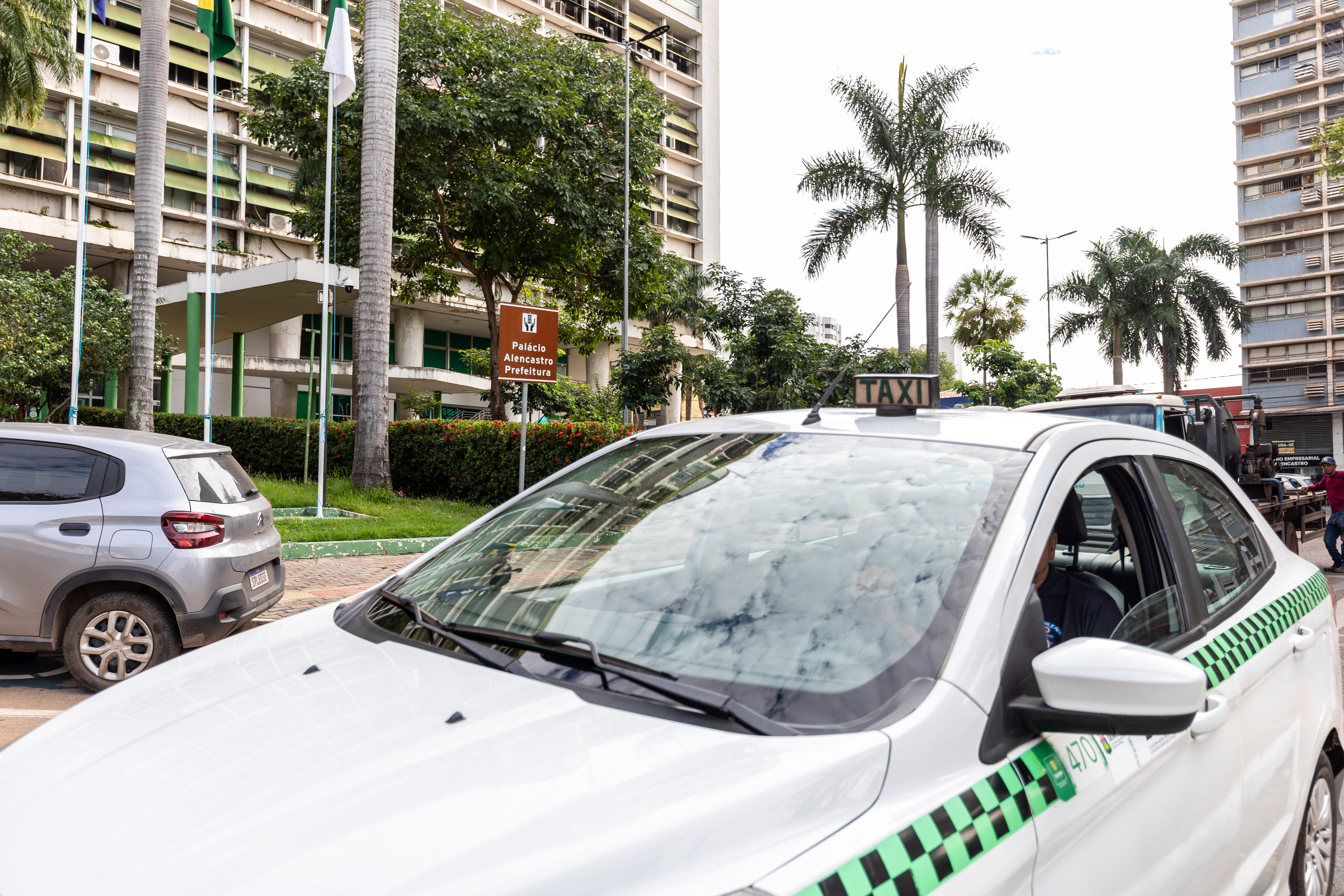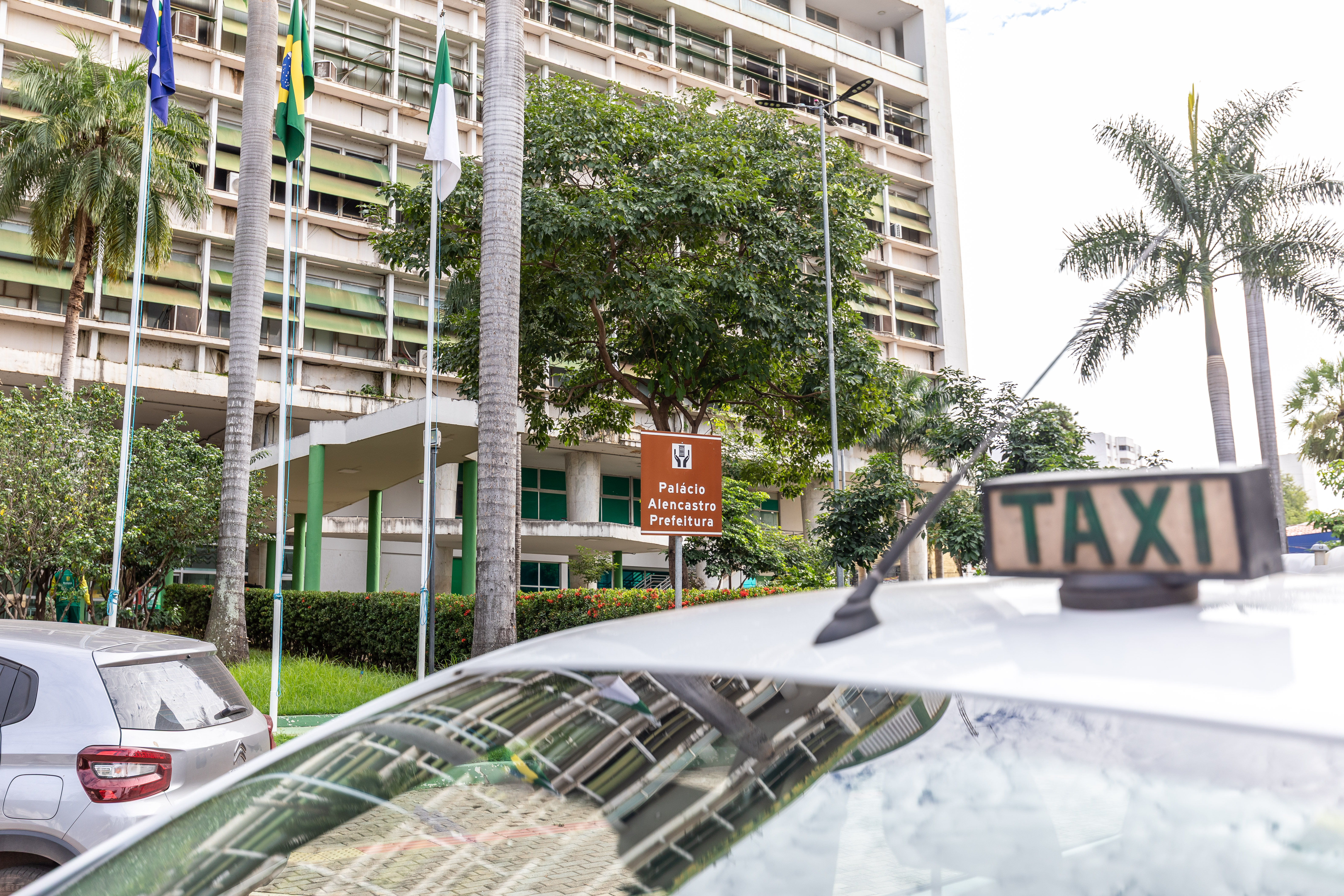 A imagem mostra a entrada do Palácio Alencastro, sede da Prefeitura de Cuiabá. Em primeiro plano, no lado direito, parte de um táxi branco aparece com a placa luminosa no teto com a palavra "TÁXI" escrita em verde.
