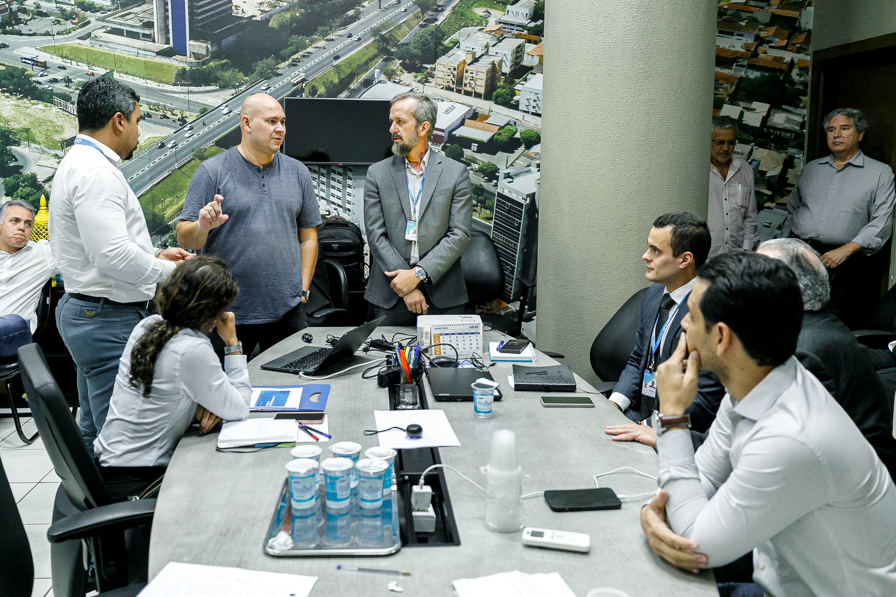 A imagem mostra o prefeito Abilio Brunini reunido com secretários municipais e representantes da Caixa Econômica Federal, durante a reunião que marca o início da estruturação da Parceria Público-Privada (PPP) da Iluminação Pública no município de Cuiabá.