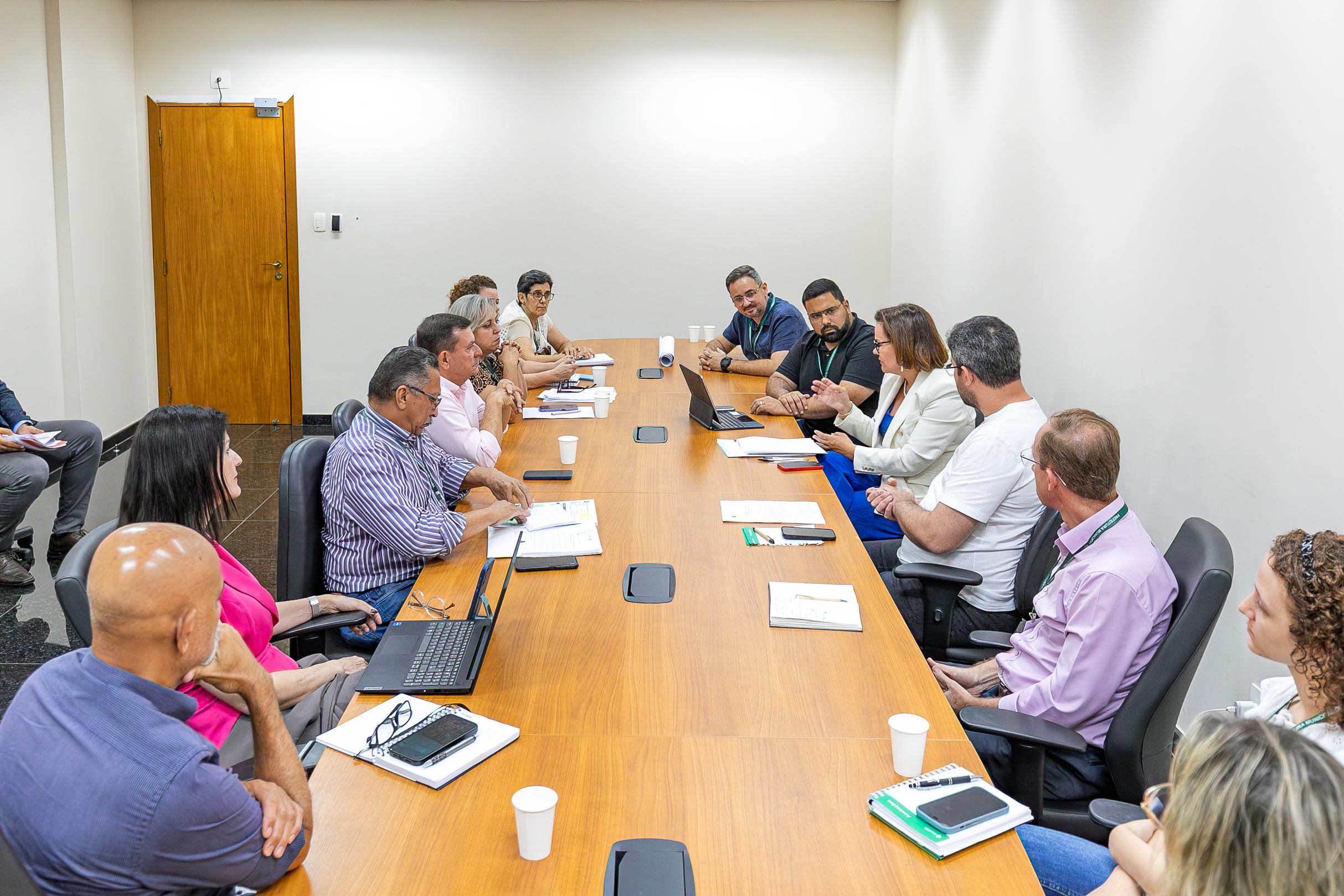 A foto retrata uma reunião realizada no Ministério Público do Estado envolvendo os representantes da gestão municipal de Cuiabá, liderados pelos secretários Fernando Medeiros, de Turismo e Desenvolvimento Econômico, e Fellipe Corrêa, da Agricultura e Turismo, e procuradora da 6ª Vara de Promotoria do Consumidor, Vanilce Silva dos Santos para tratativas sobre os permissionários do Mercado do Porto. Várias pessoas participam da reunião e estão sentados ao redor de uma mesa de longo comprimento.