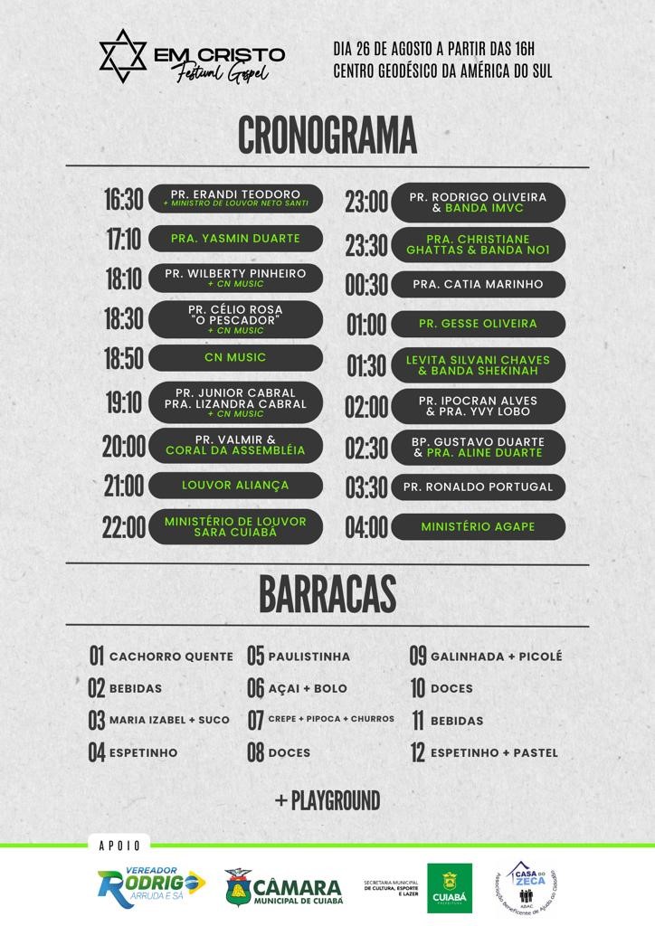 A Prefeitura de Cuiabá, por meio da Secretaria Municipal de Cultura, Esporte e Lazer, convida a população a participar do maior Festival Gospel do Centro-Oeste: ‘Em Cristo’, que acontece neste sábado (26). O evento, que promete ser um momento de celebração, música e espiritualidade, começa às 16h, na Praça Paschoal Moreira Cabral, localizada em frente à Câmara Municipal de Cuiabá. A entrada é um quilo de alimento não perecível. O evento tem como objetivo louvar a Jesus Cristo.