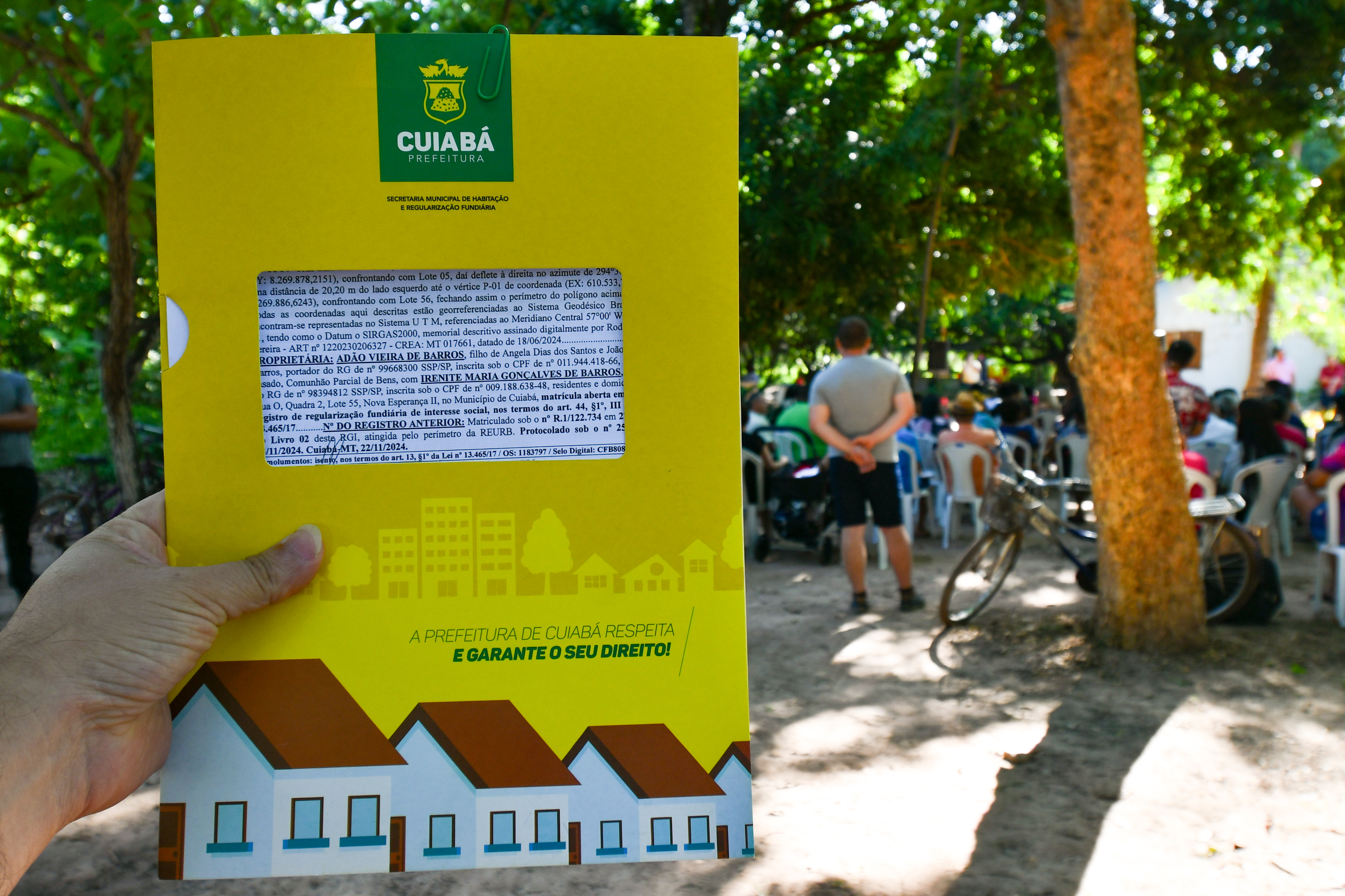A Prefeitura de Cuiabá, por meio da Secretaria Municipal de Habitação e Regularização Fundiária, realizou nesta quinta-feira (19) a entrega de 800 títulos definitivos de propriedade aos moradores do bairro Parque Nova Esperança II, situado na região da Grande Pedra 90.
