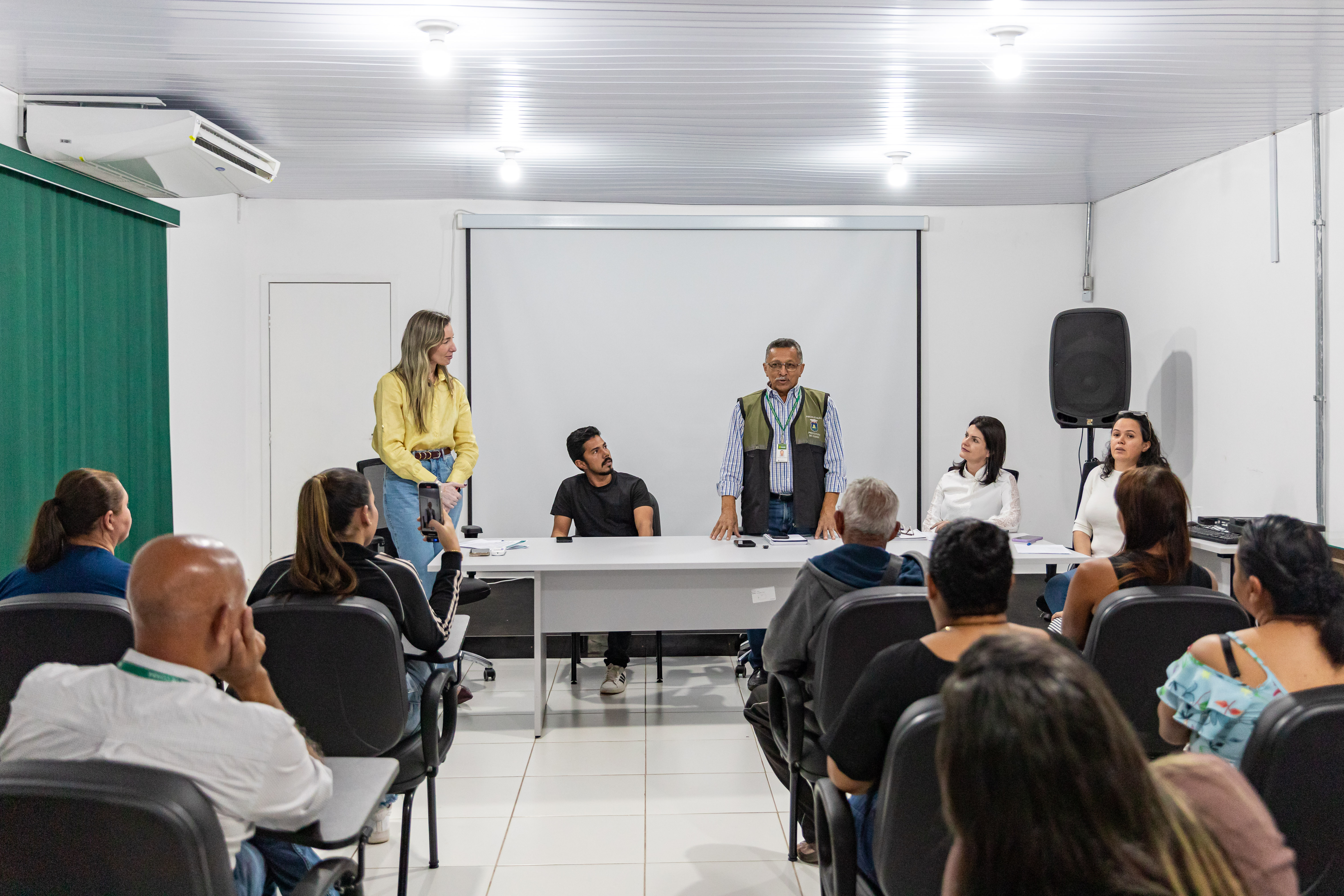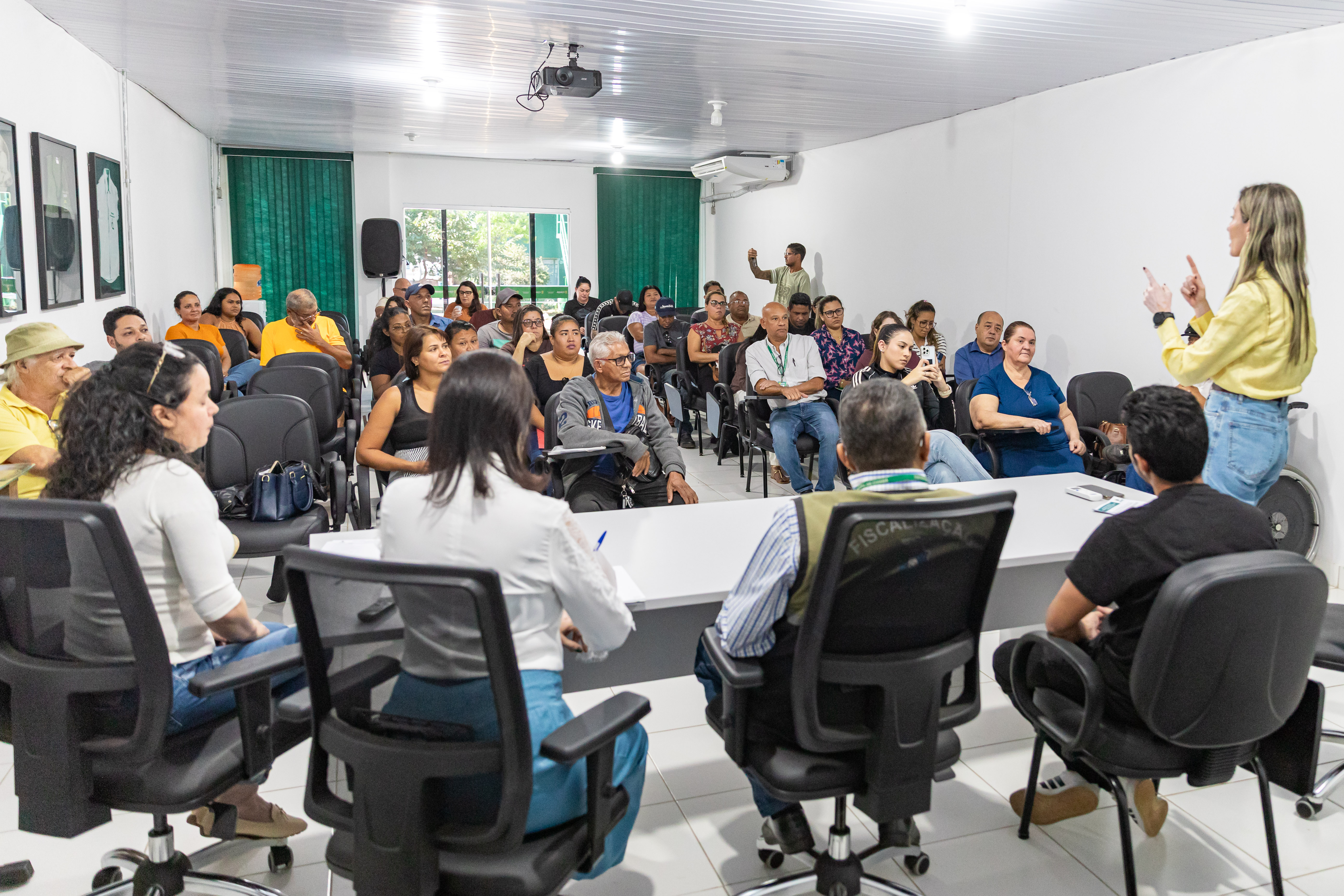 A foto ilustra os trabalhadores reunidos no auditório da Secretaria de Ordem Pública. Eles estão ouvindo as explicações da secretária Juliana Palhares. Abaixo, há uma galeria de fotos que mostra outros momentos da entrega da autorização