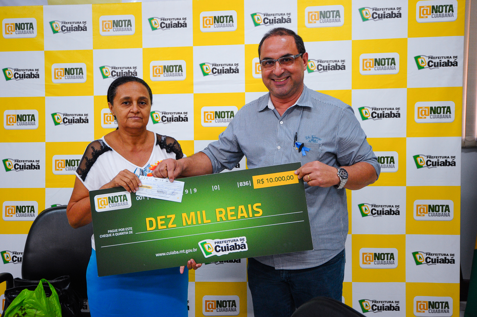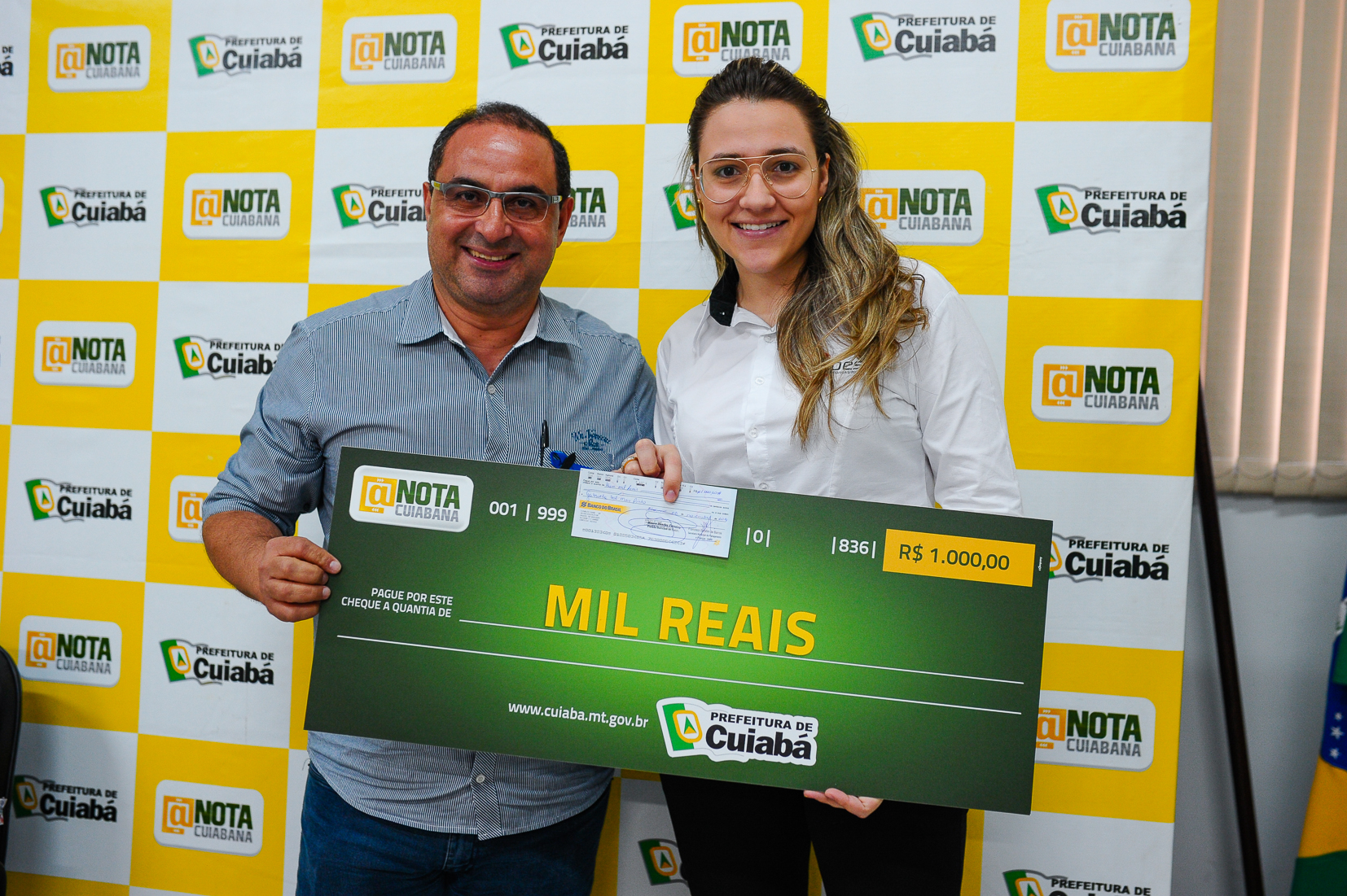 A Prefeitura de Cuiabá entregou na manhã desta quinta-feira (06), os prêmios aos vencedores de mais uma etapa da Nota Cuiabana neste ano. Os ganhadores receberam um prêmio de 10 mil reais, um de 5 mil e o restante de mil reais. A entrega dos cheques foi feita pelo secretário-adjunto de Fazenda, José Luiz Pacheco.