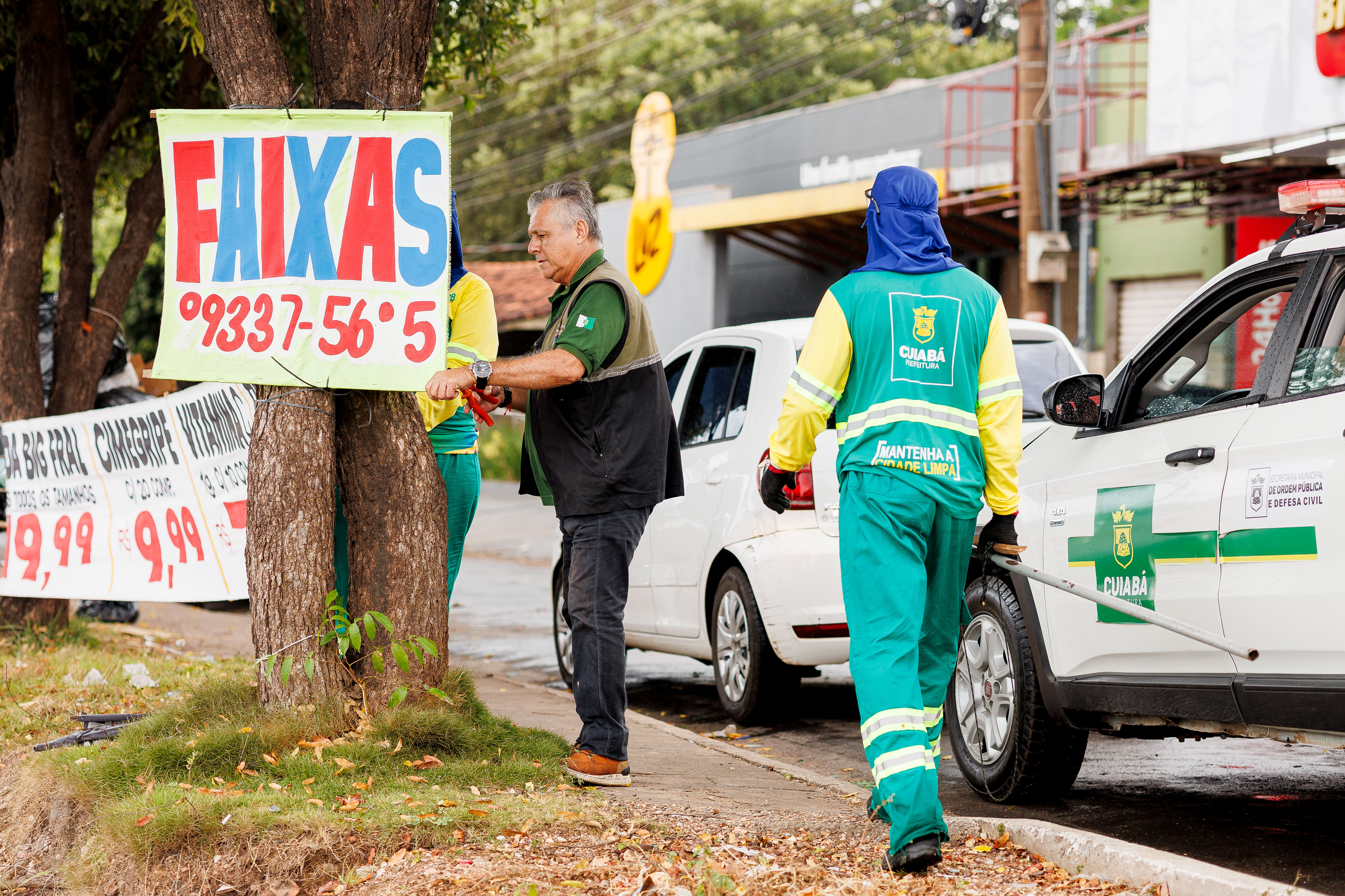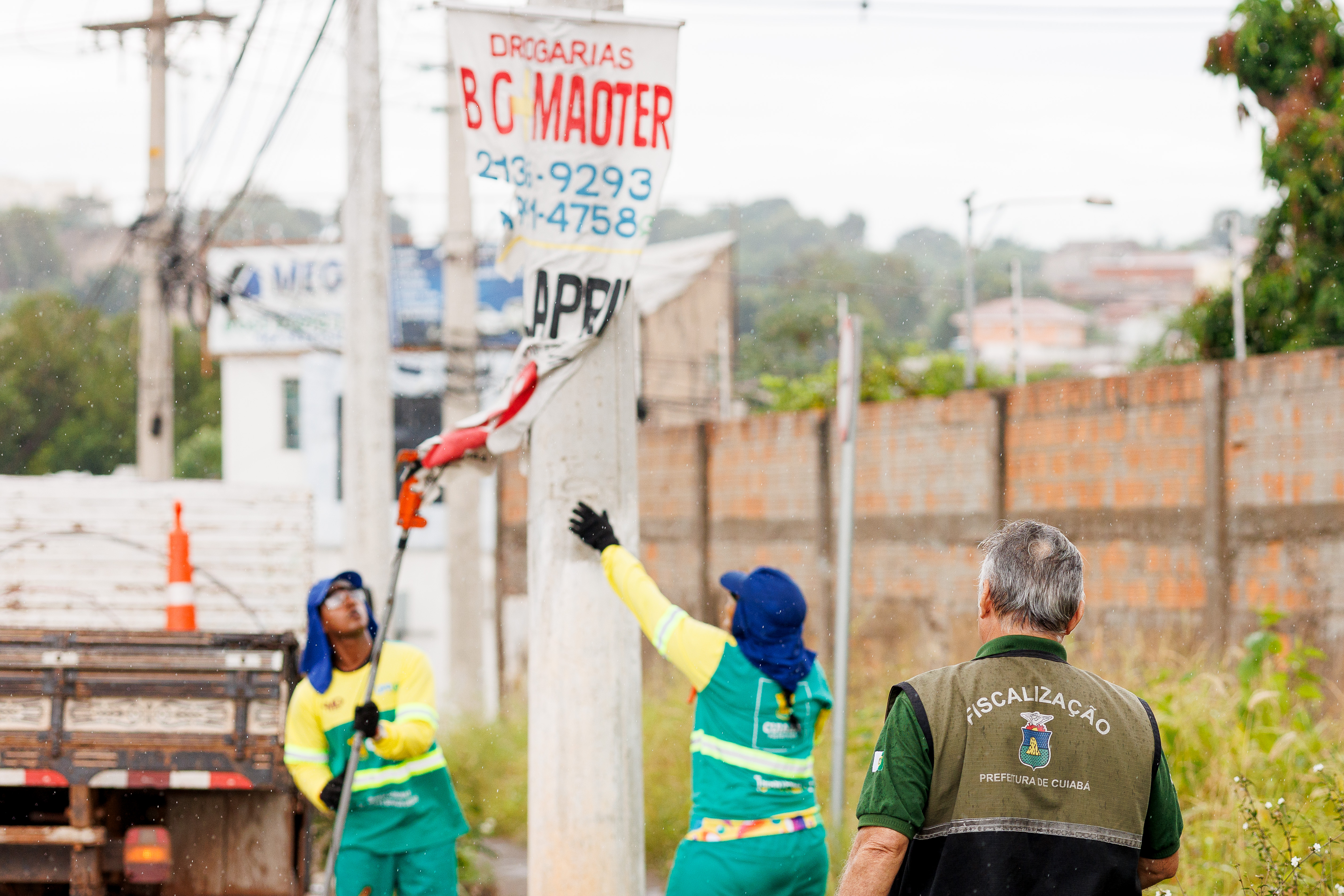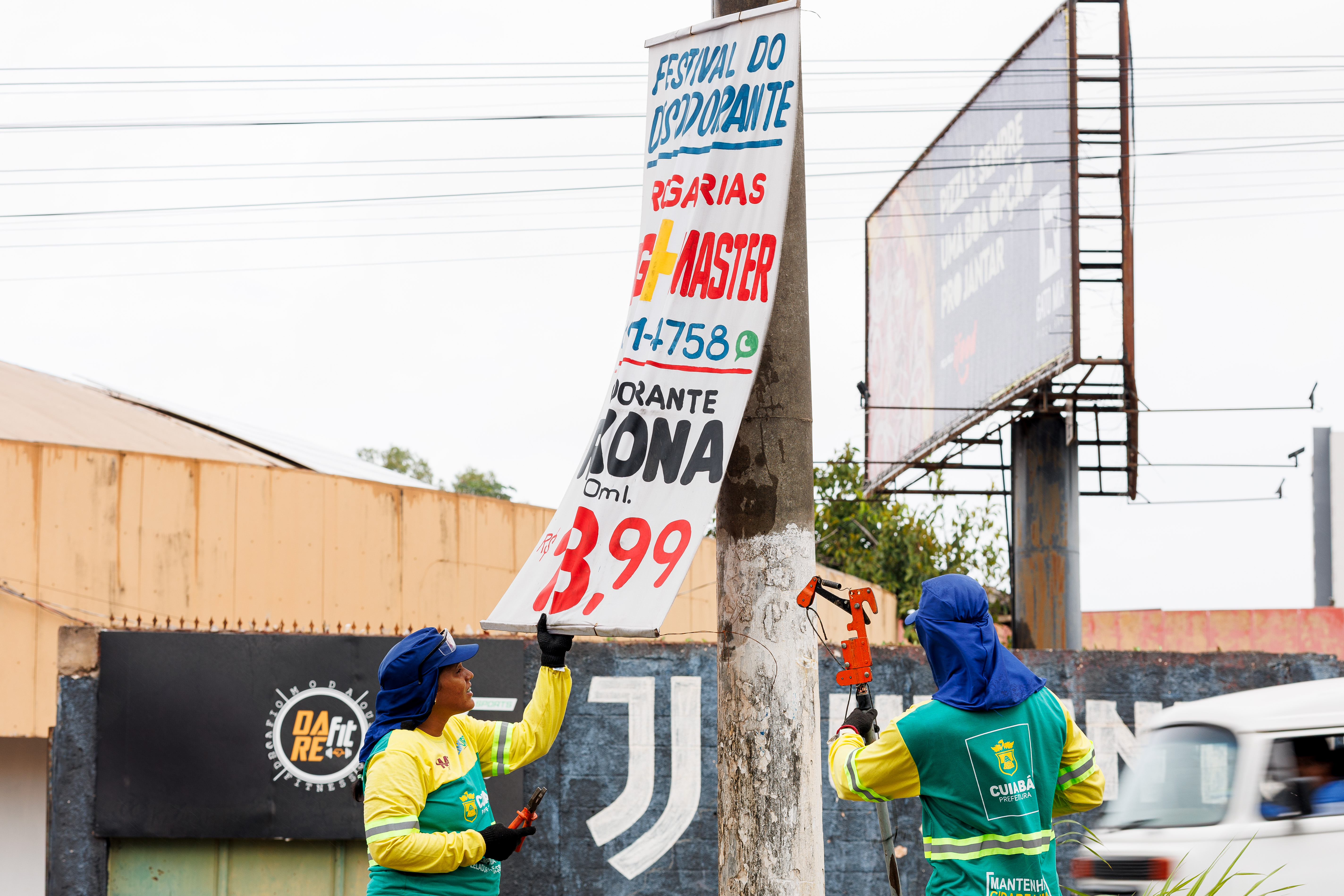 A Prefeitura de Cuiabá, por meio da Secretaria Municipal de Ordem Pública, realizou na quarta-feira (26) a ação “Cidade Limpa”, com foco na retirada de publicidades instaladas irregularmente em áreas públicas. A operação contou com o apoio da Empresa Cuiabana de Zeladoria e Serviços Urbanos (Limpurb) e ocorreu ao longo da Avenida República do Líbano.