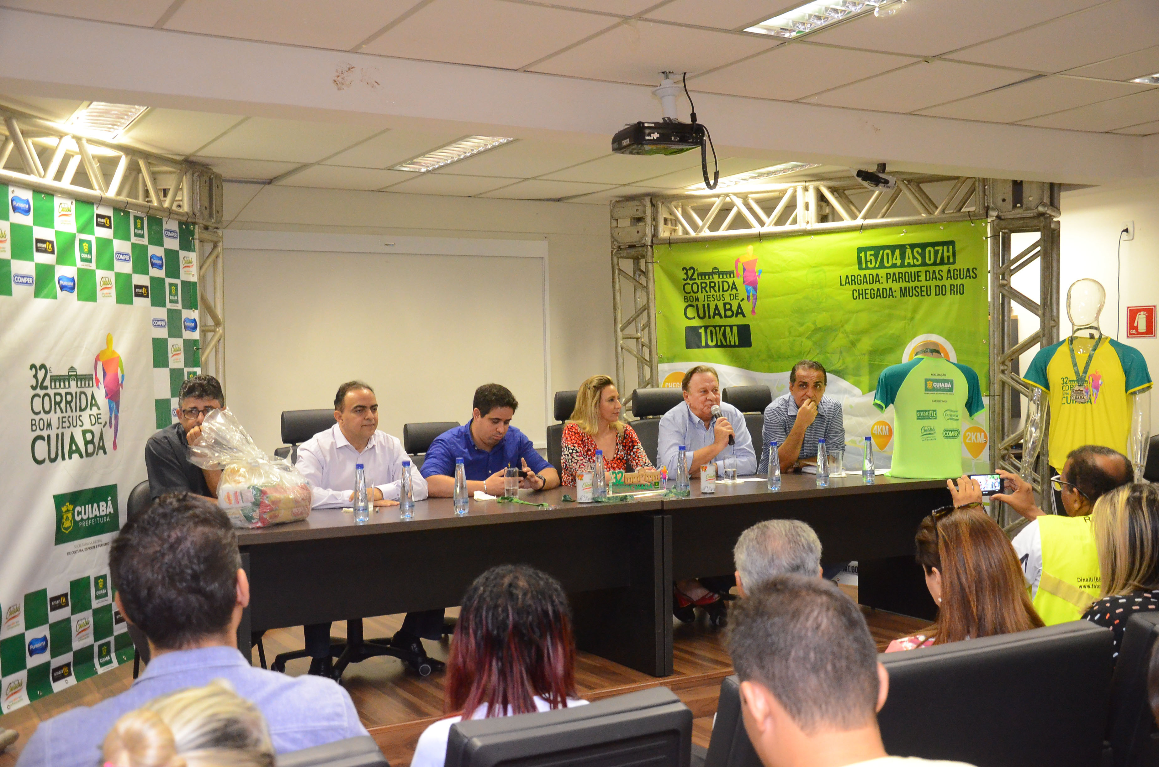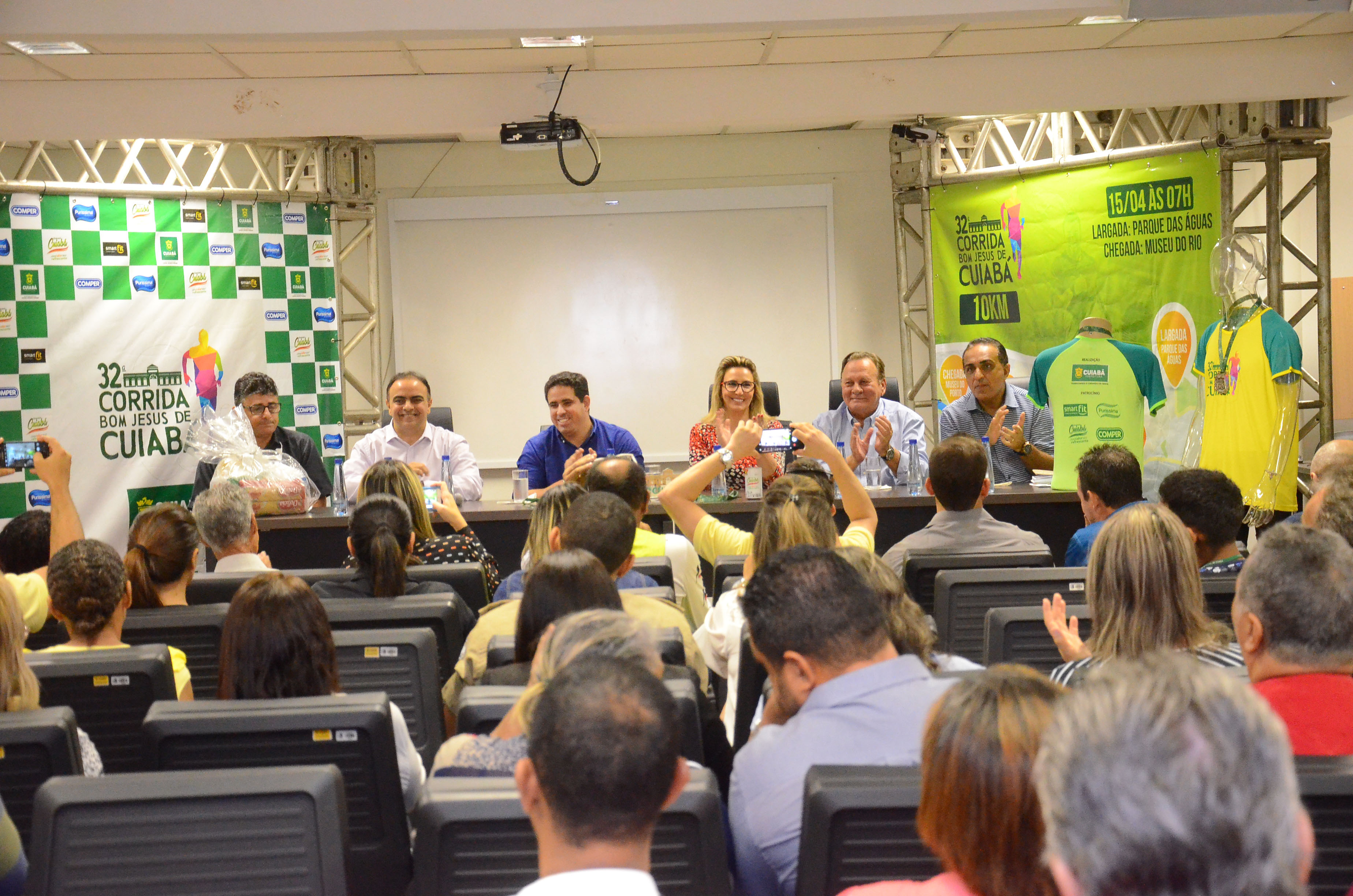 A Prefeitura de Cuiabá por meio da Secretaria Municipal de Cultura Esporte e Turismo lançou nesta quinta-feira (22), no auditório do Palácio Alencastro, a 32ª Corrida Pedestre Senhor Bom Jesus de Cuiabá com a participação da primeira dama Márcia Pinheiro, do vice-prefeito Niuan Ribeiro e do secretário de Cultura Esporte e Turismo Francisco Vuolo. A competição acontece no dia 15 de abril dentro das comemorações do aniversário de 299 anos da Capital.