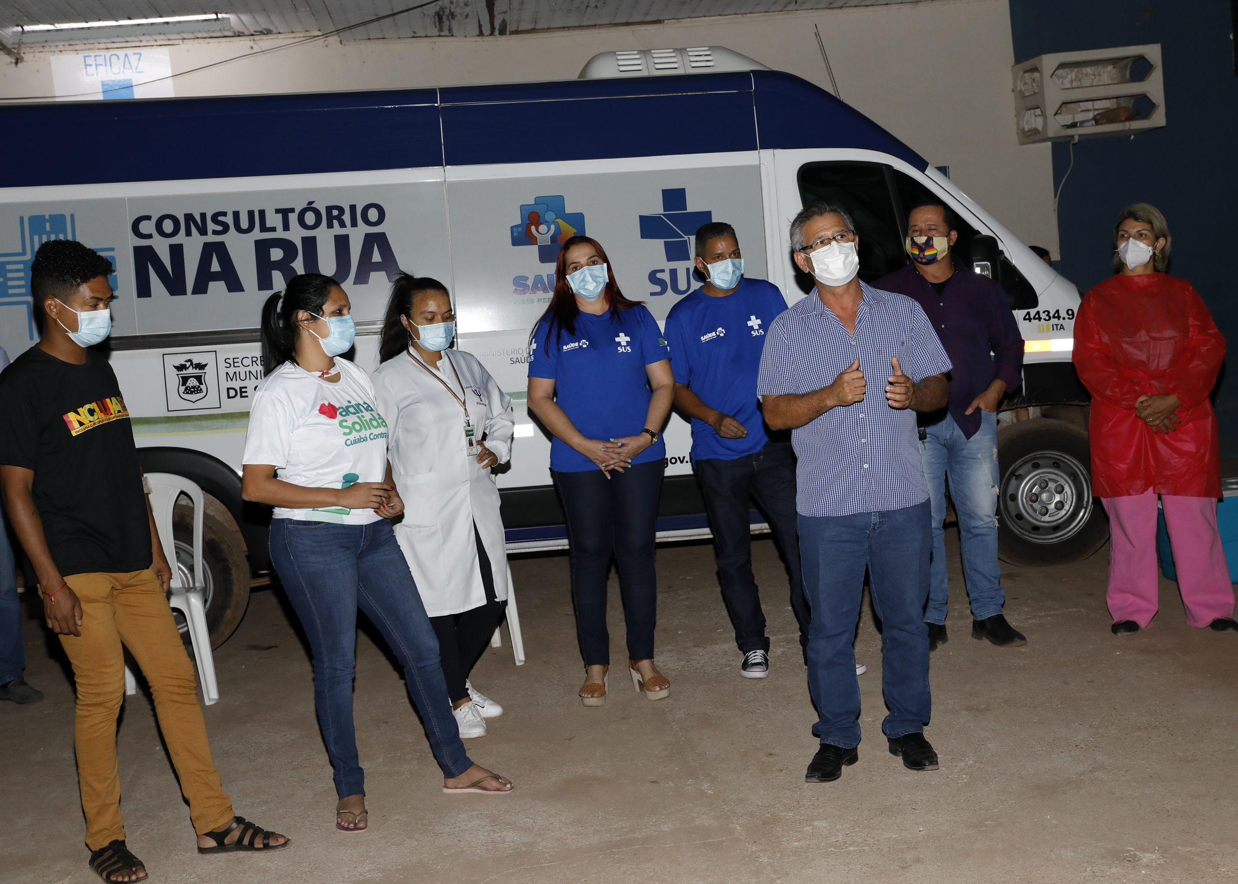 Com foco na imunização contra H1N1 e encaminhamento para atendimento por especialidades, a equipe do Consultório na rua, comandada pela coordenadora Vera Ferreira, se dedicava a dar orientações para atendimentos em unidades de saúde e tirar dúvidas quanto aos cuidados contra a propagação da COVID-19 durante atuação de trabalho. Enquanto isso, Roseli Barranco, coordenadora de saúde bucal de Cuiabá e sua equipe de jalecos rosas orientavam o grupo sobre cuidados para prevenir o câncer de boca dentre outras doenças orais.