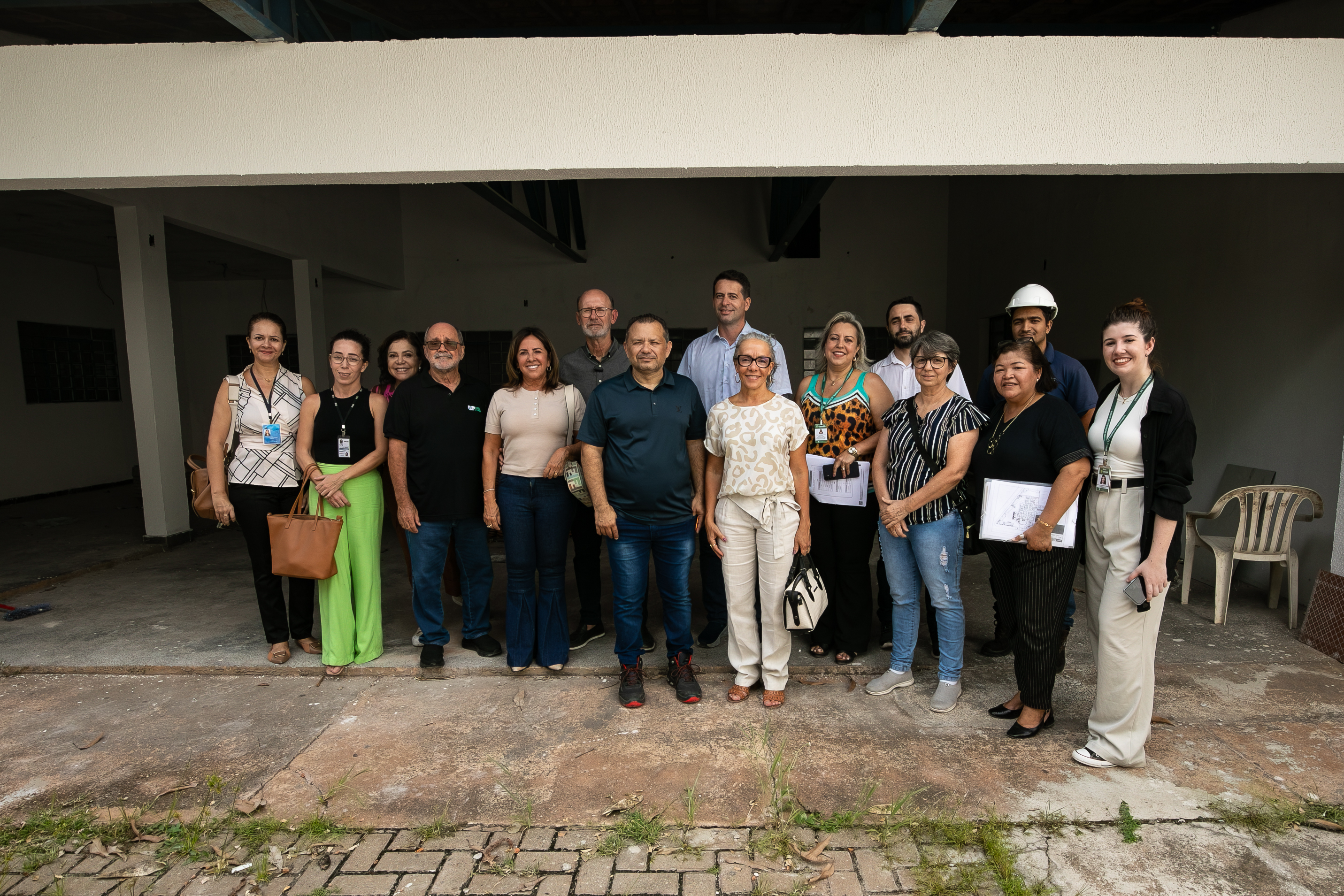A imagem que ilustra a matéria mostra a comitiva de fiscalização em uma unidade do Caps em reforma. O grupo, composto por 15 pessoas dentre homens e mulheres, posa para foto em frente a uma obra. No centro da imagem, a secretária de Saúde de Cuiabá, Lúcia Helena, usa roupas em tons claros e sorri para a câmera.