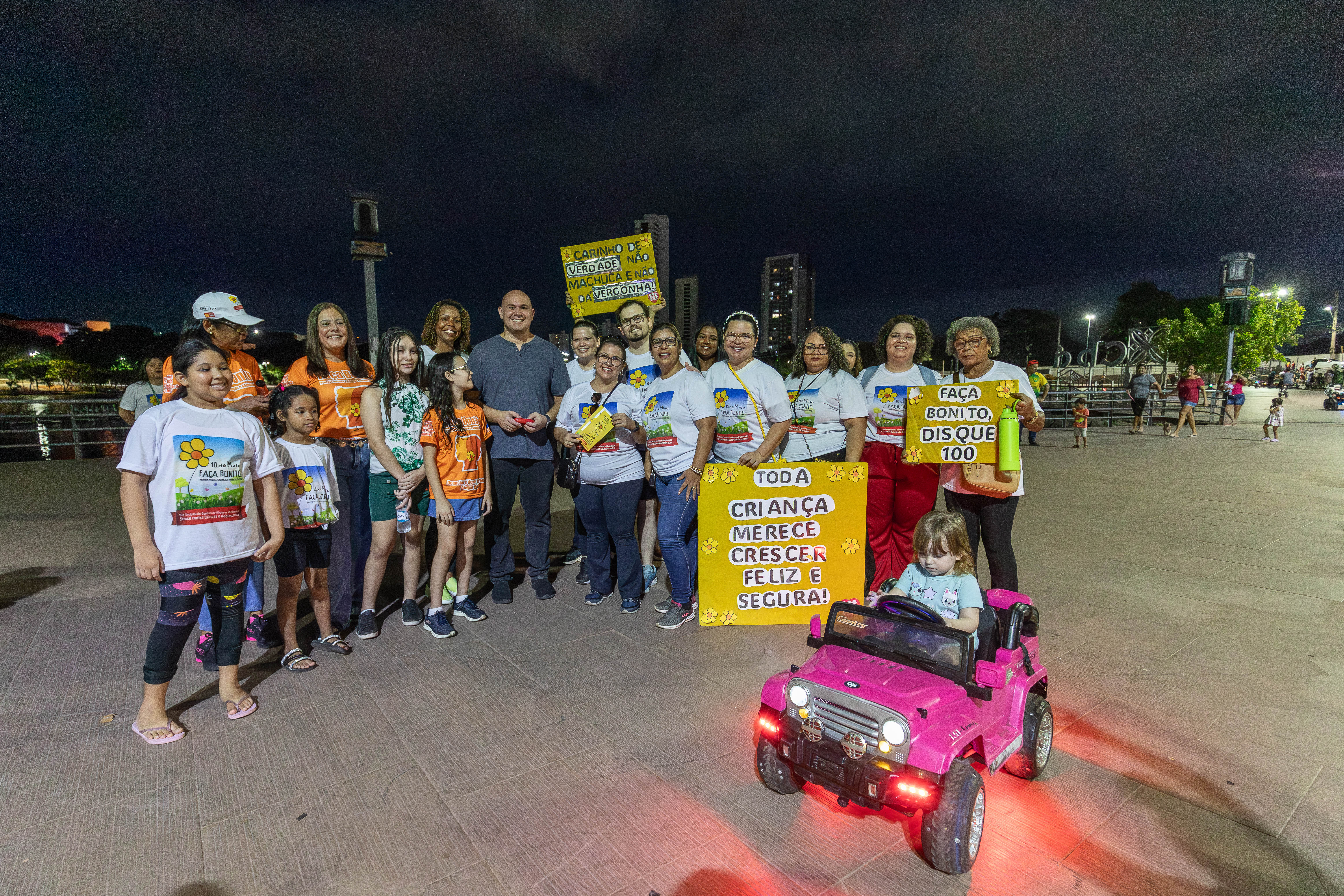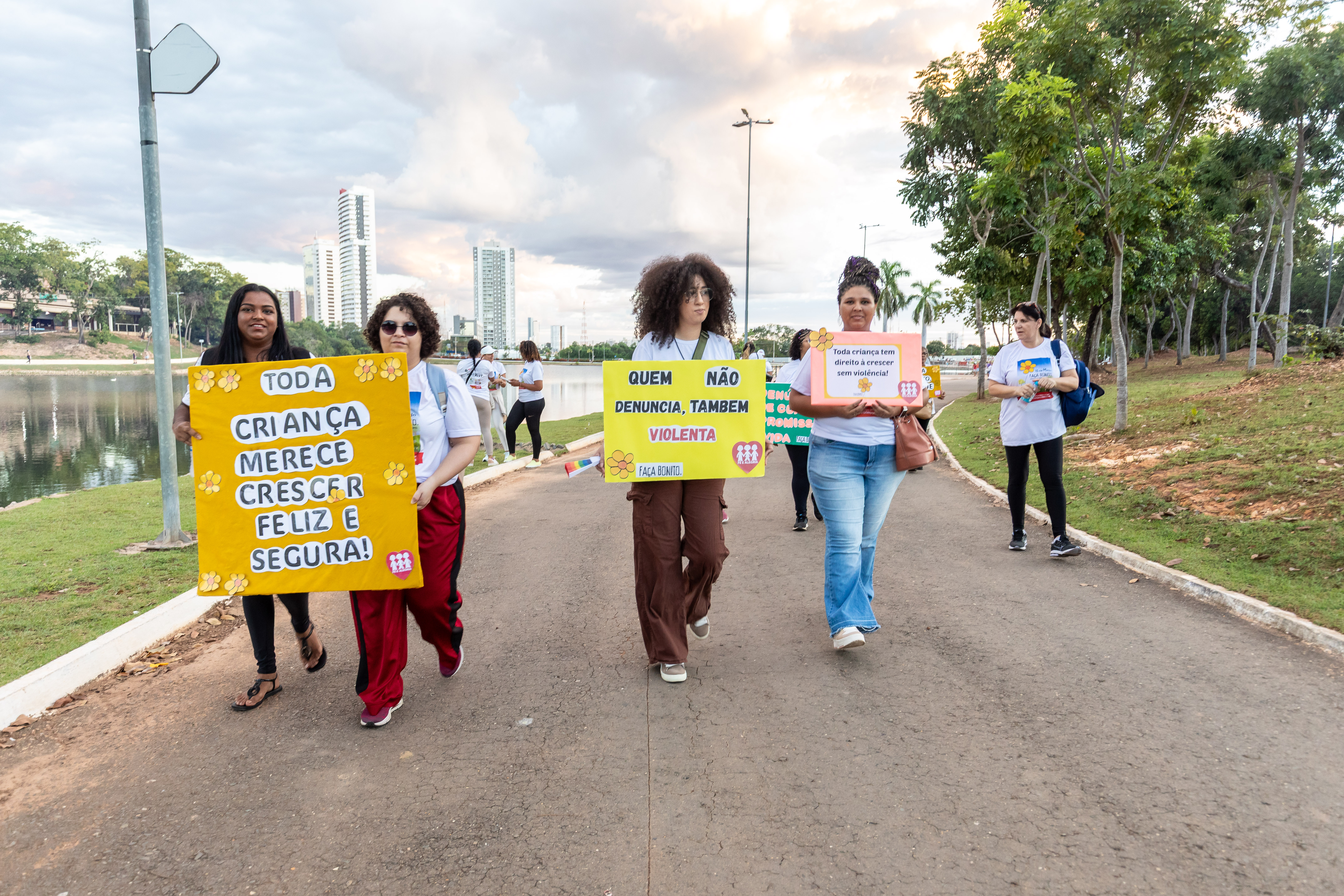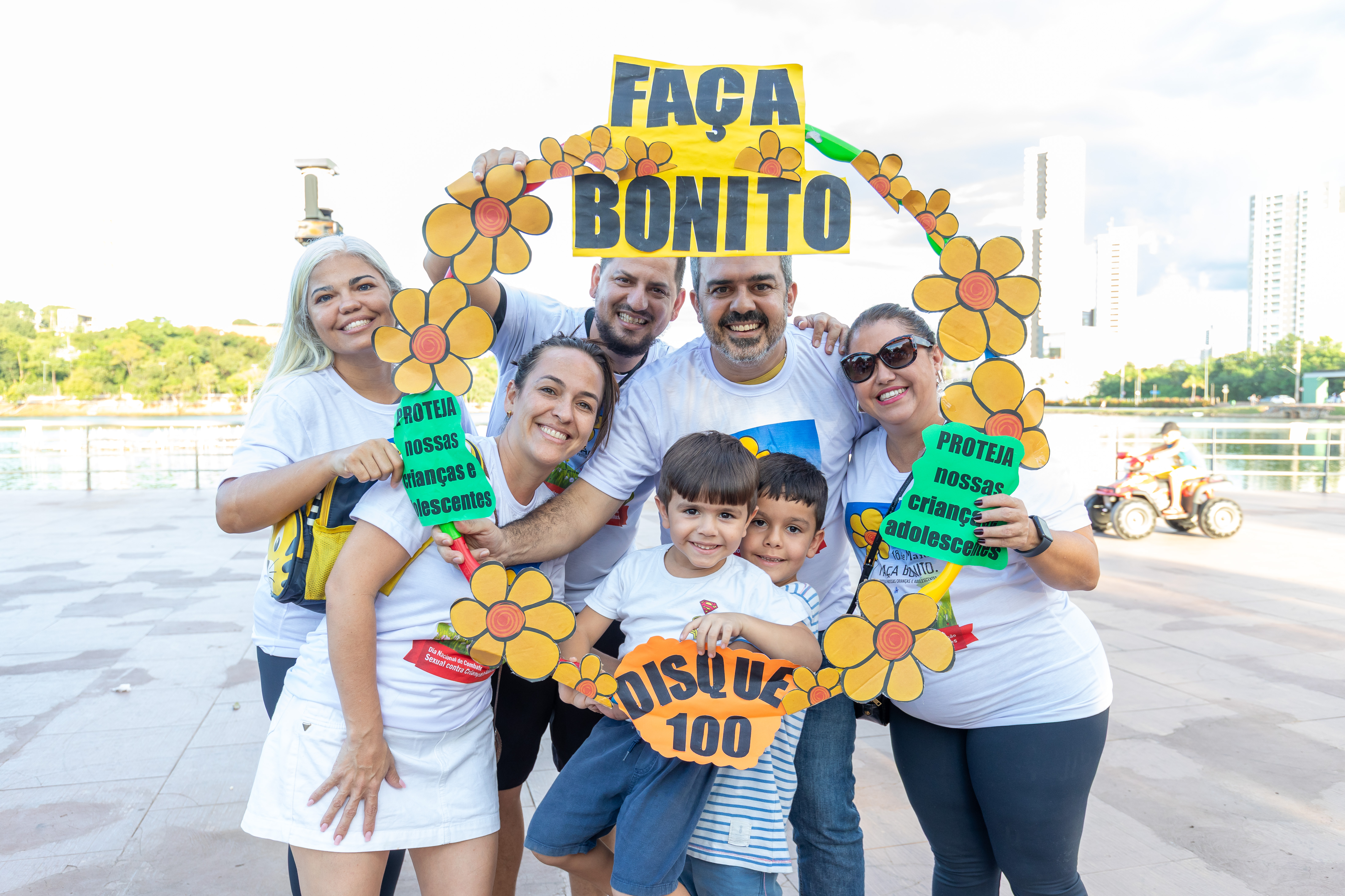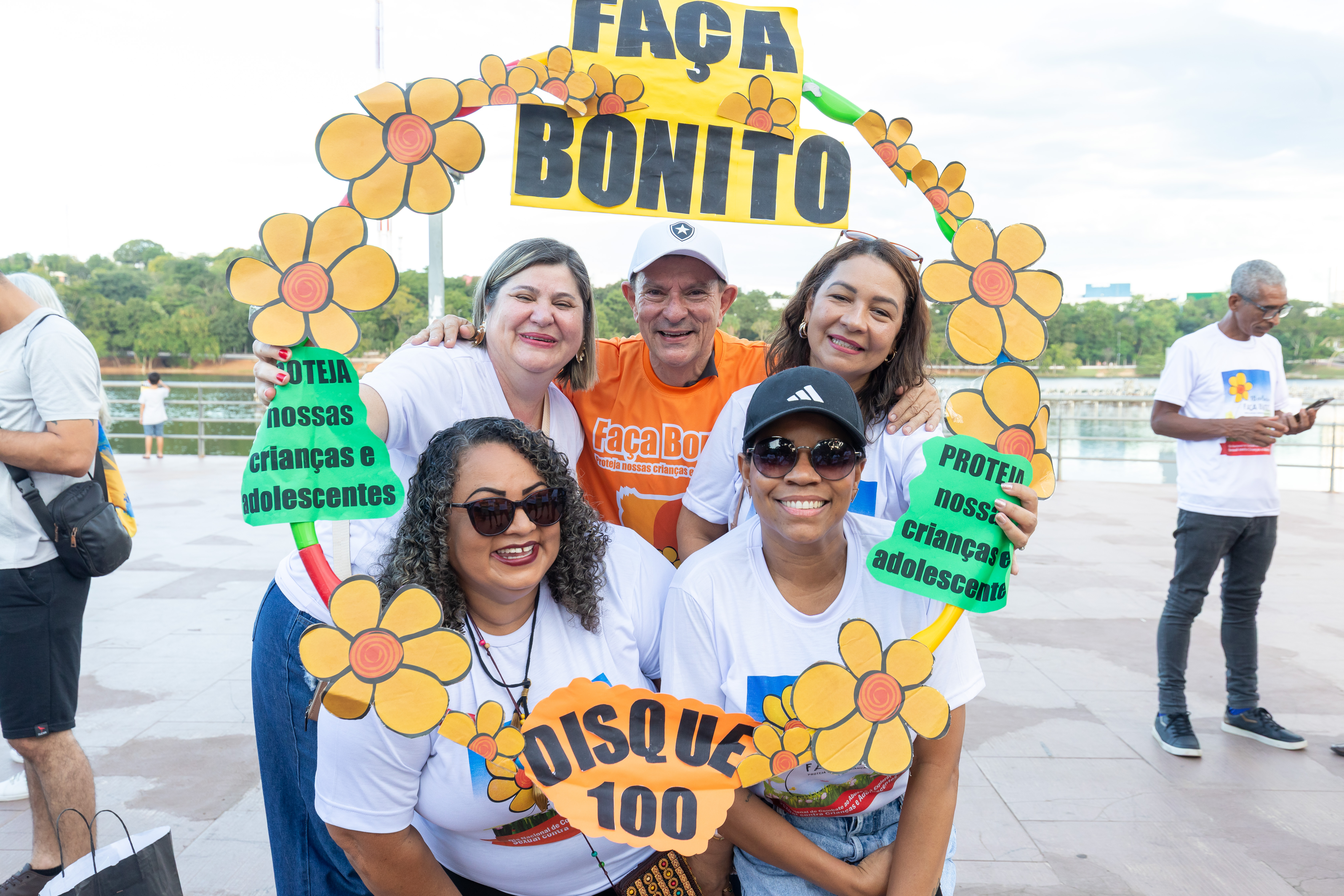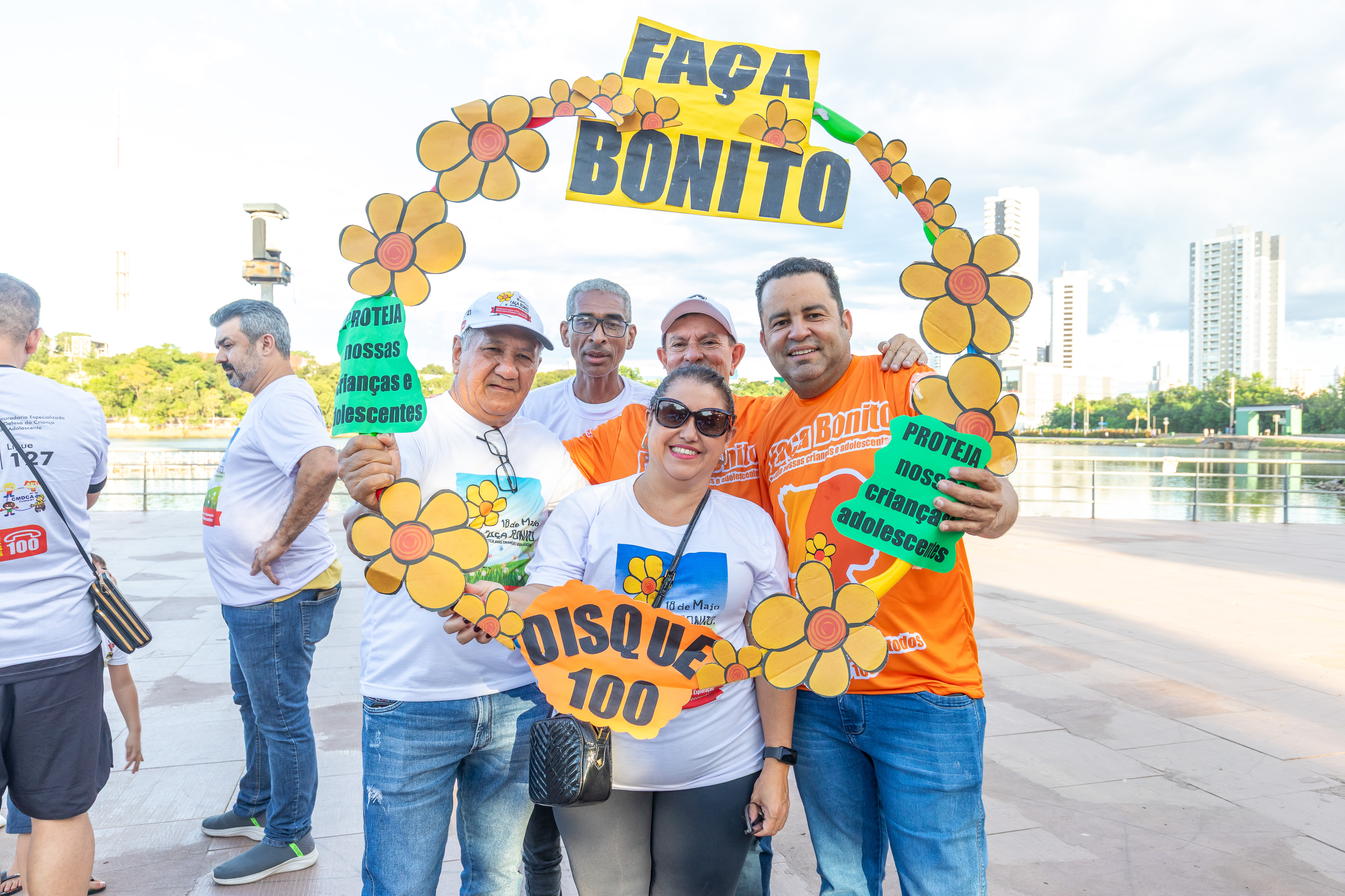 Com faixas com frases como: “Não se cale”, “Você pode salvar uma vida”, “Faça Bonito – Disque 100”, “Carinho de verdade não machuca e não dá vergonha”, “Toda denúncia é um ato de cuidado e compromisso com a vida”, “Toda criança merece crescer feliz e segura”, e “Quem não denuncia também violenta”, os participantes reforçaram a importância da denúncia e da proteção integral da infância.