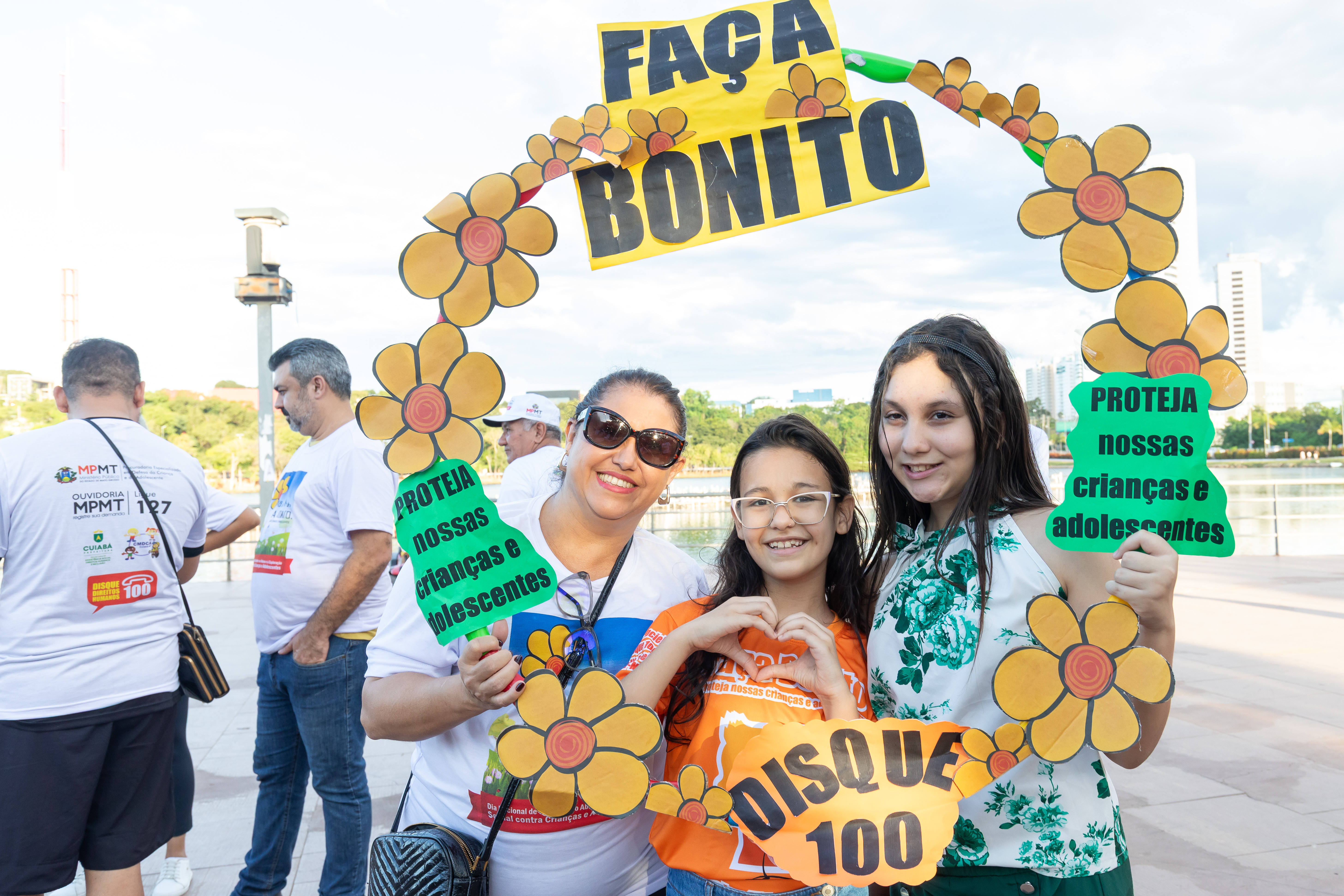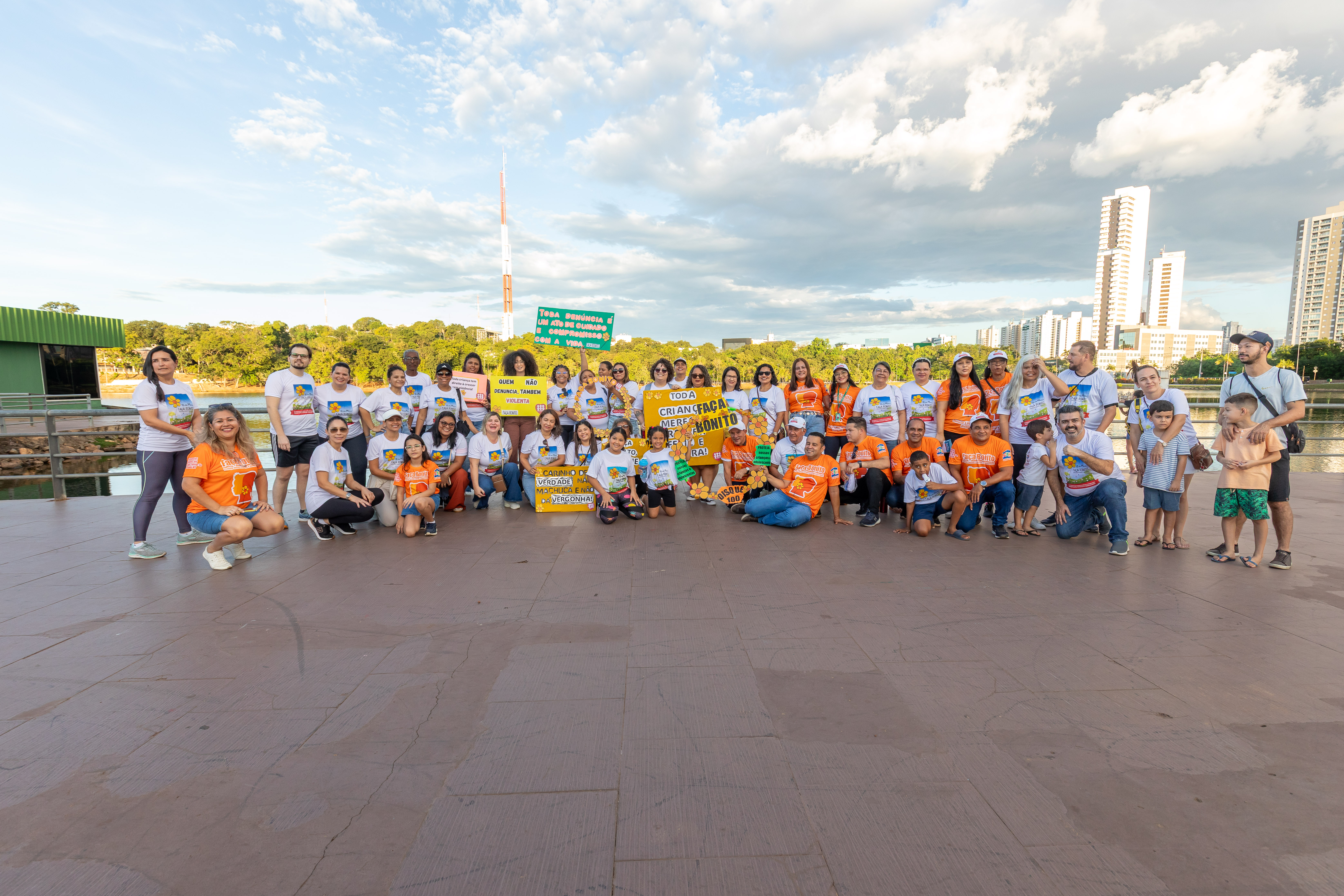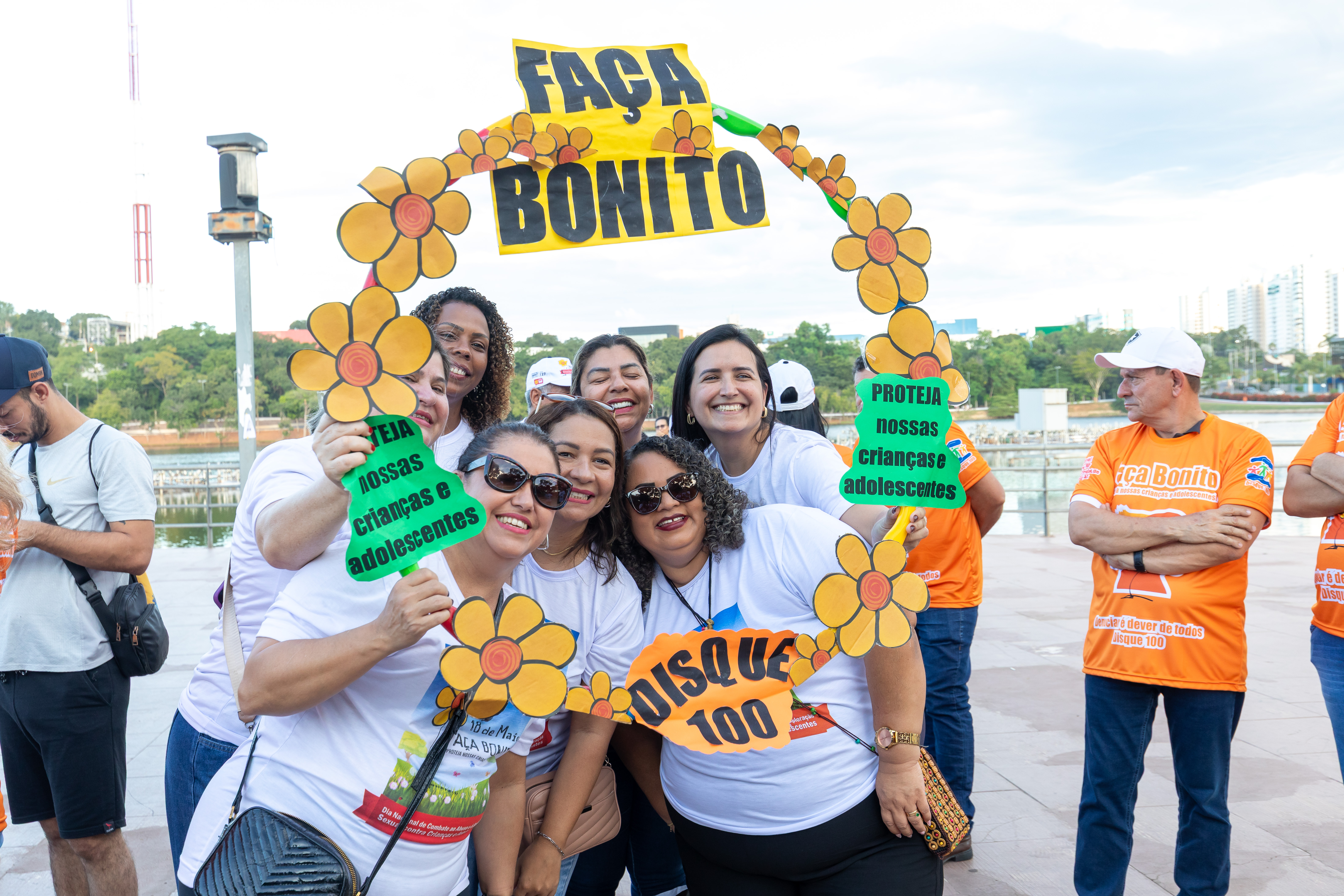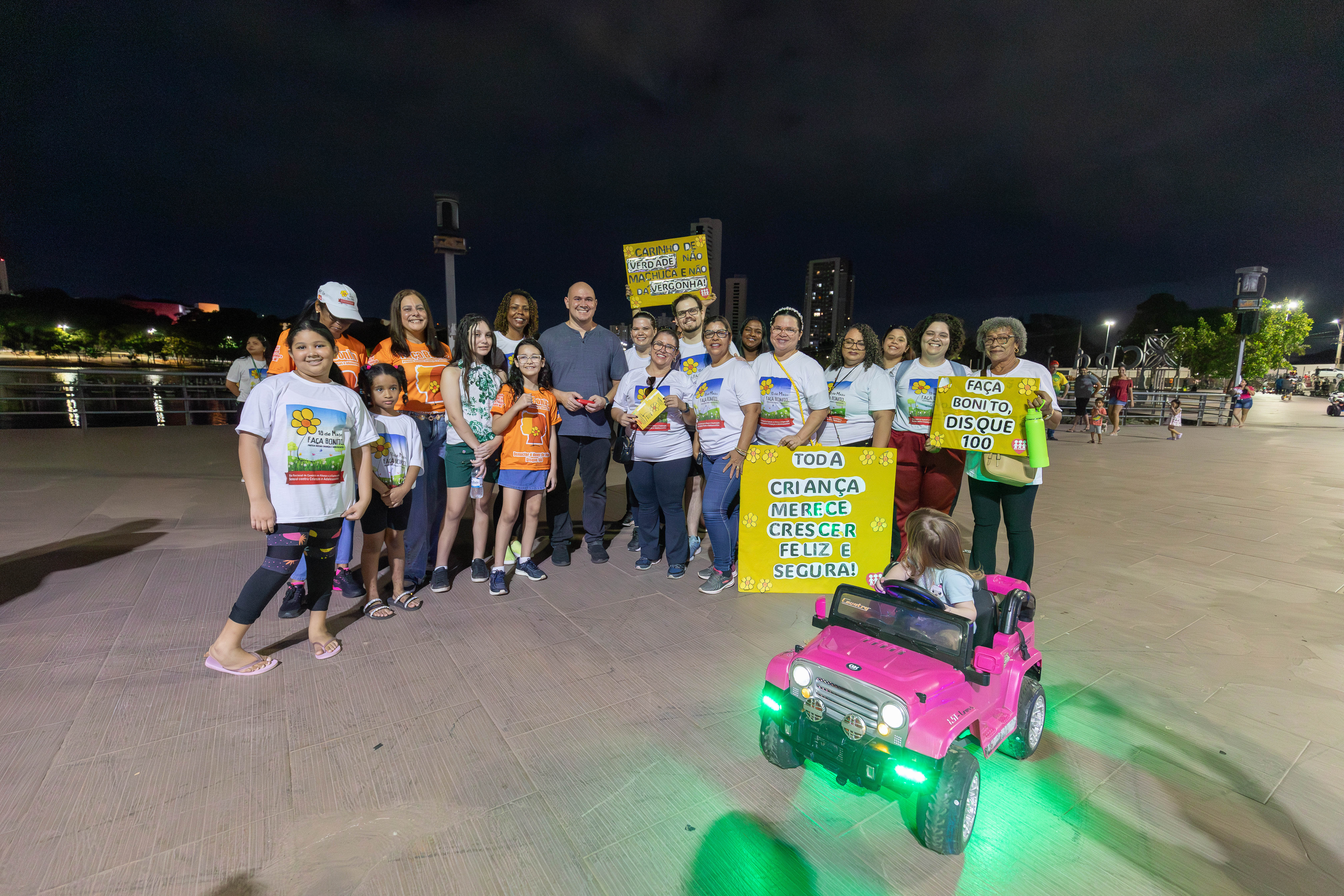 Com faixas com frases como: “Não se cale”, “Você pode salvar uma vida”, “Faça Bonito – Disque 100”, “Carinho de verdade não machuca e não dá vergonha”, “Toda denúncia é um ato de cuidado e compromisso com a vida”, “Toda criança merece crescer feliz e segura”, e “Quem não denuncia também violenta”, os participantes reforçaram a importância da denúncia e da proteção integral da infância.
