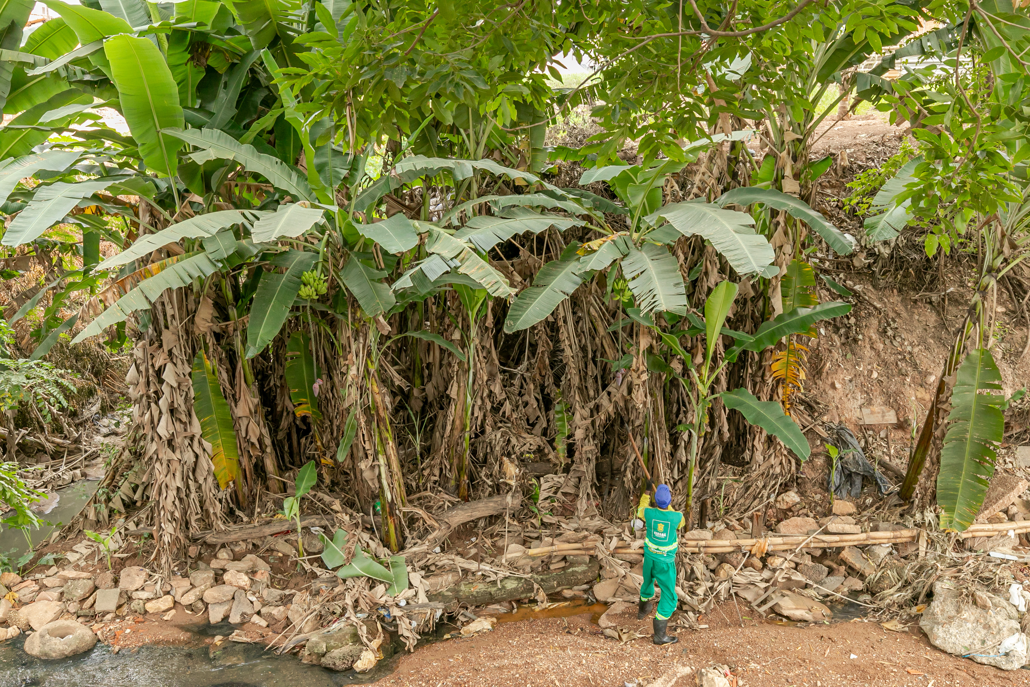A imagem mostra colaboradores da Limpurb no mutirão de limpeza no córrego do bairro Tancredo Neves. Os funcionários usam uniforme na cor verde, e estão munidos de Equipamento de Proteção Individual (EPIs).