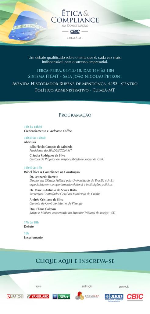 Com apoio da Prefeitura de Cuiabá, a Câmara Brasileira da Indústria da Construção (CBIC) e o Sesi Nacional, trazem à Capital o “Seminário Ética & Compliance – Para uma gestão eficaz”. O evento acontece na terça-feira (4) e promove discussões para a adoção de uma cultura da integridade junto às empresas da construção civil.