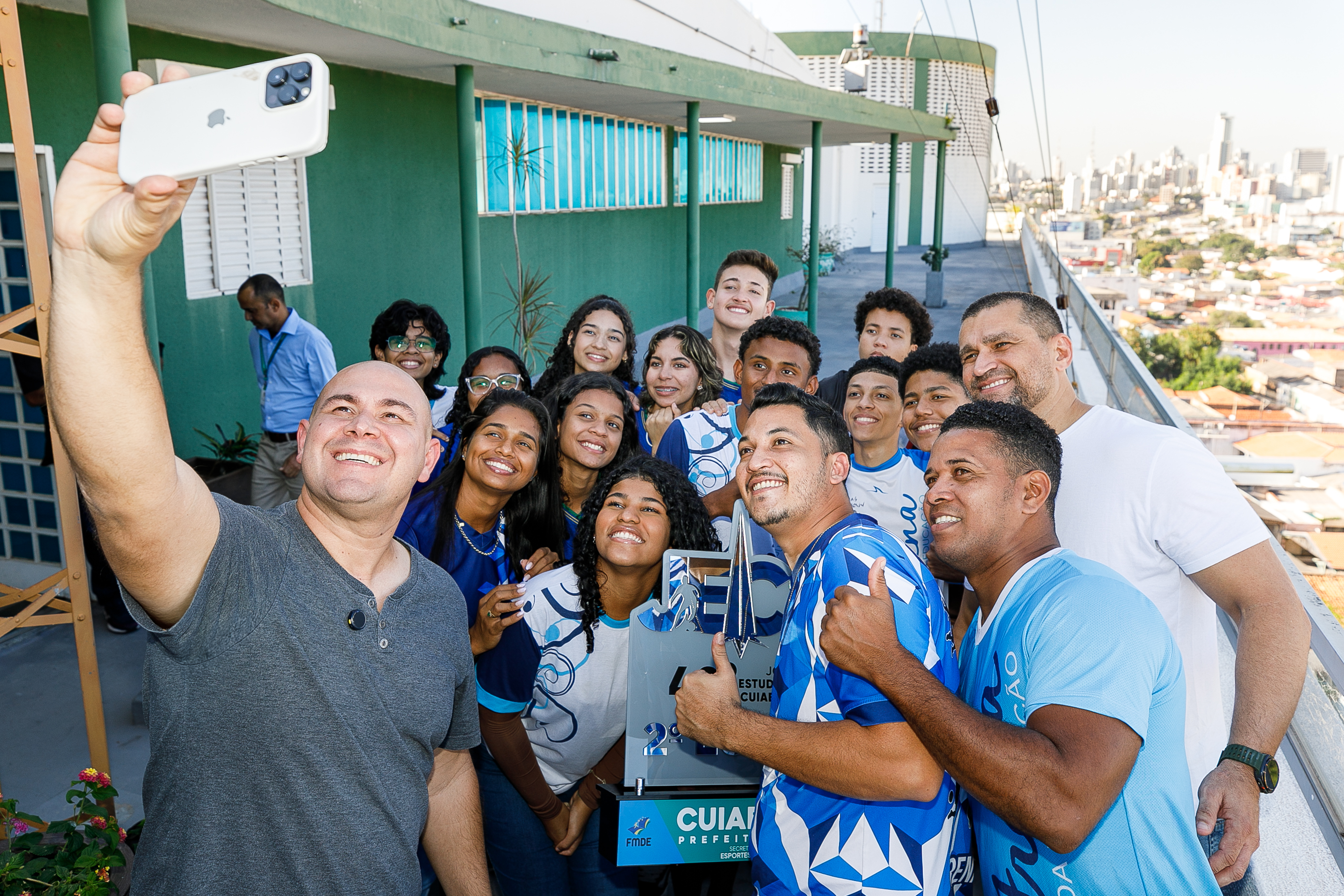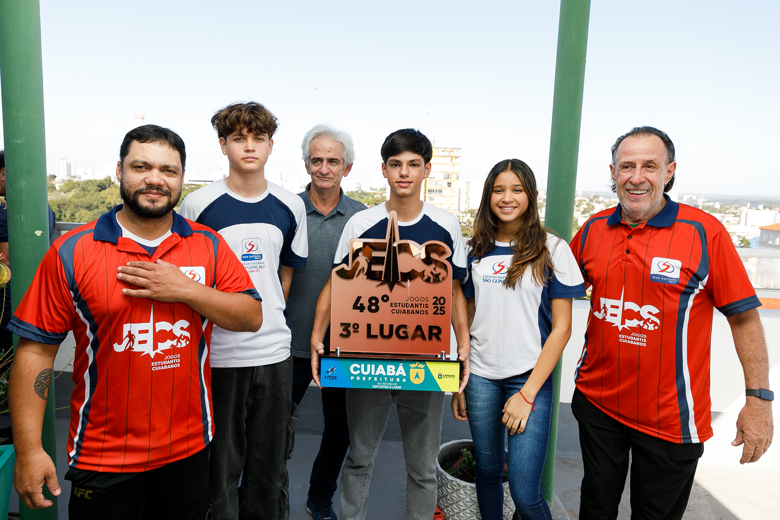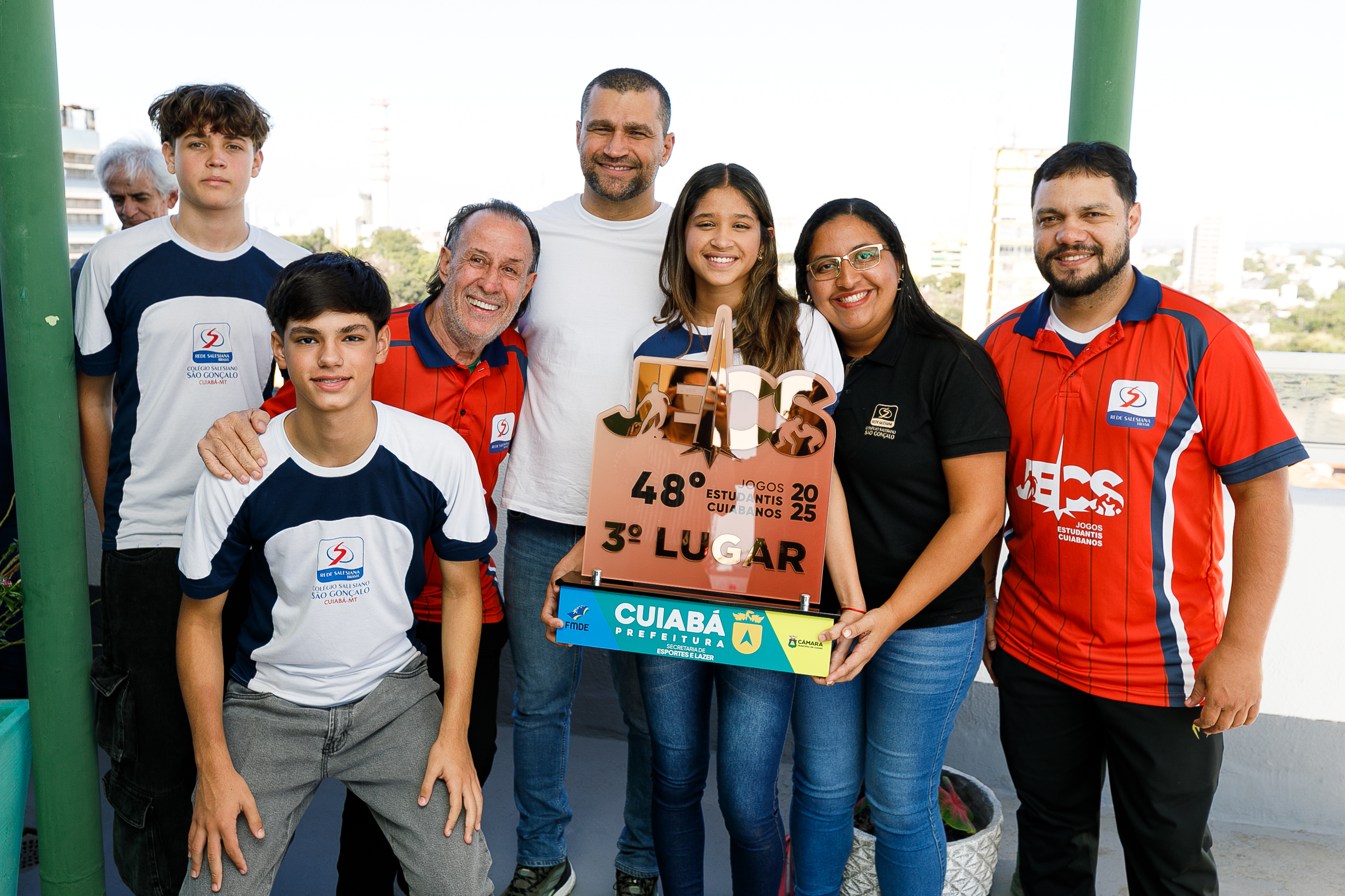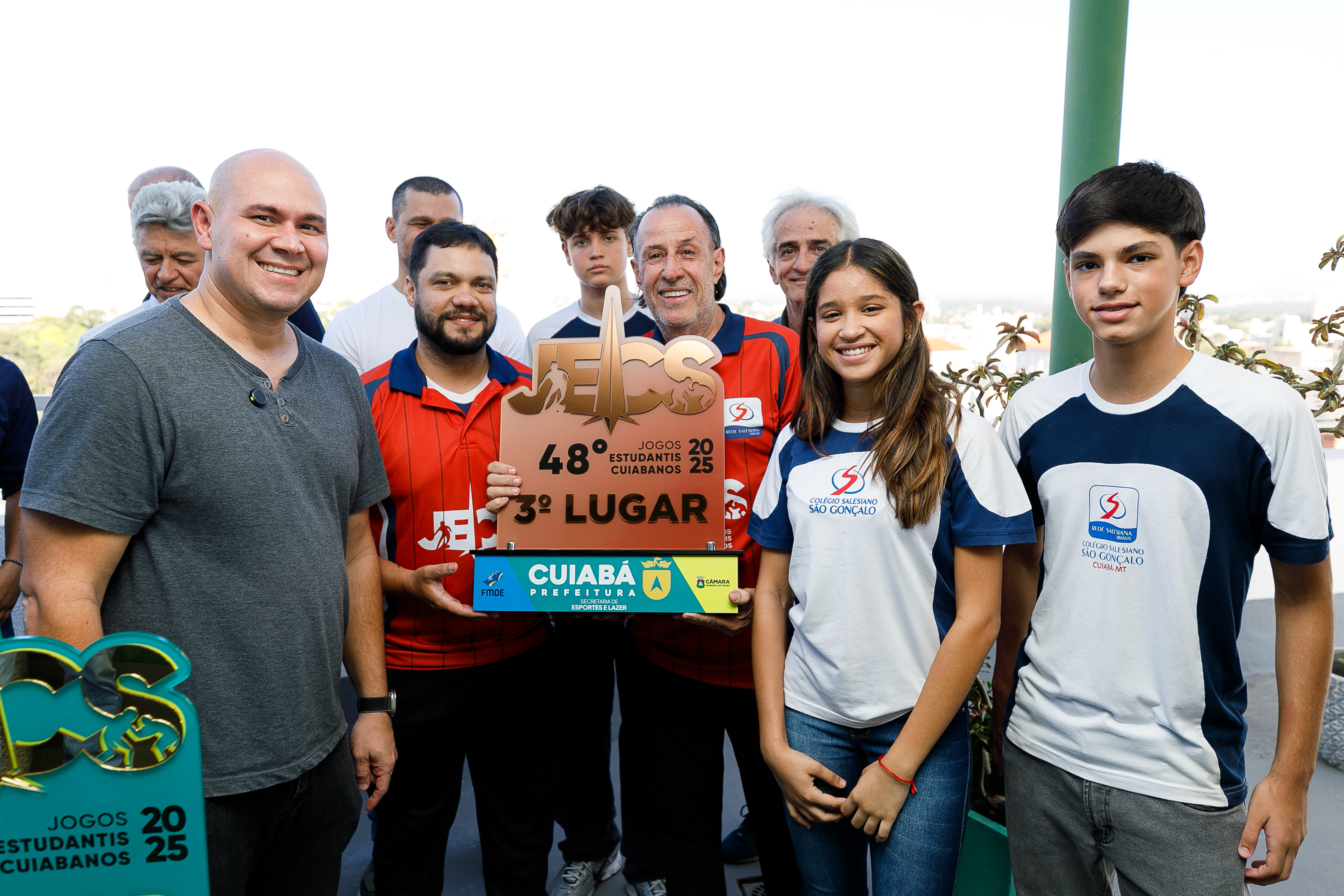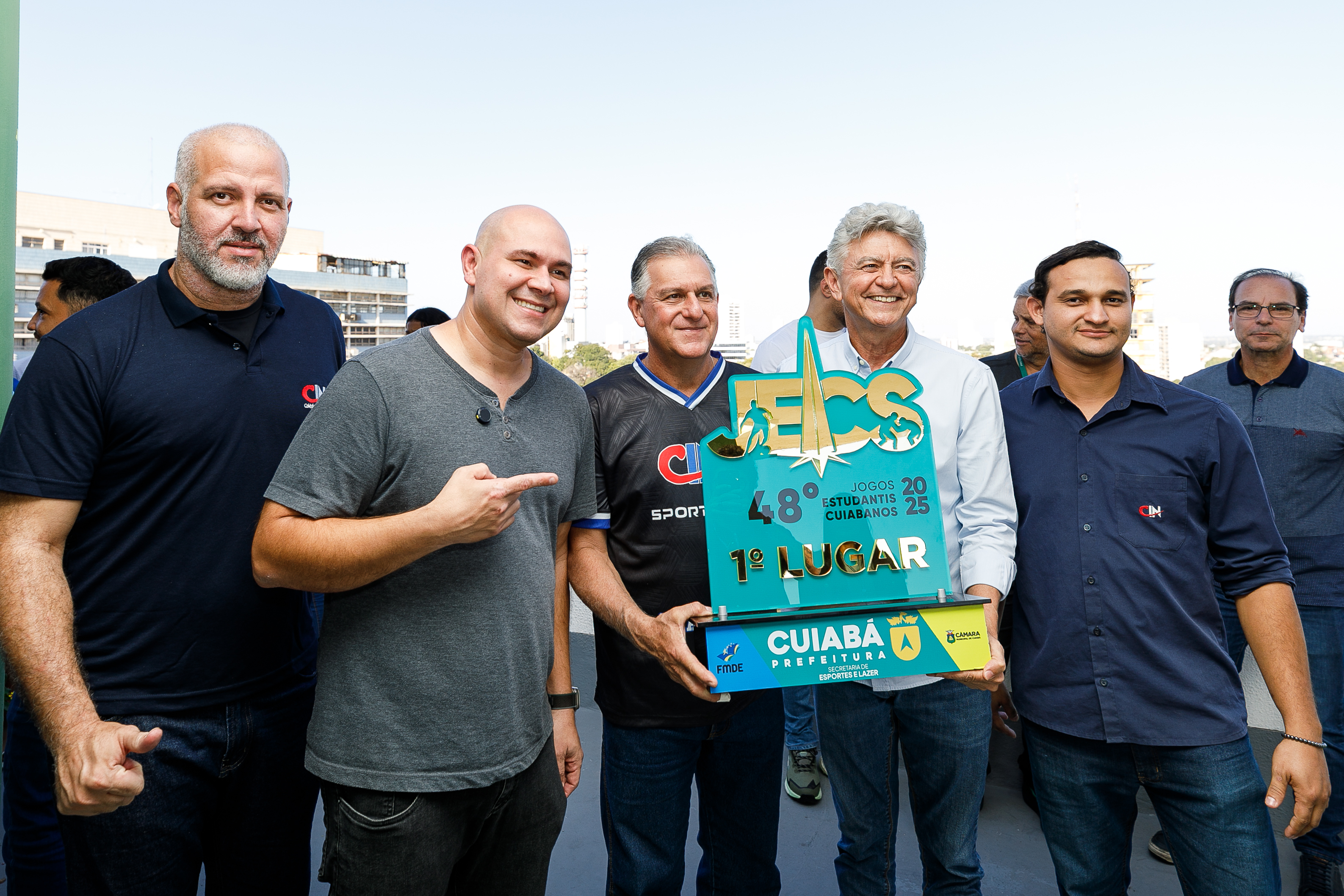 O prefeito de Cuiabá, Abilio Brunini, e o secretário municipal de Esportes, Jefferson Neves, recepcionaram, na tarde desta sexta-feira (4), no terraço da Prefeitura, as equipes escolares que mais conquistaram medalhas na 48ª edição dos Jogos Estudantis Cuiabanos (JECs). O evento premiou as três instituições que lideraram o quadro geral de medalhas, consolidando o encerramento da maior competição escolar da capital.