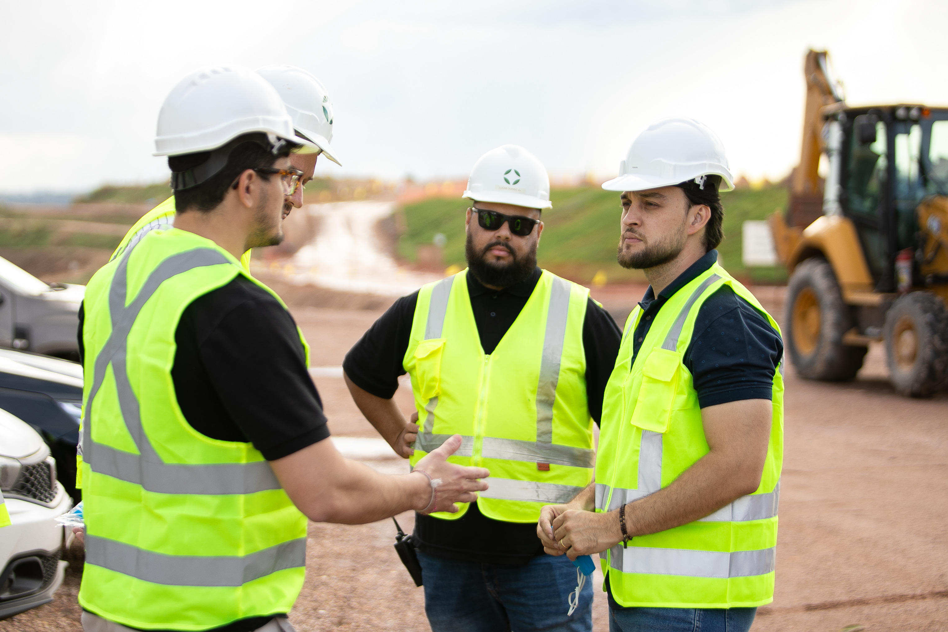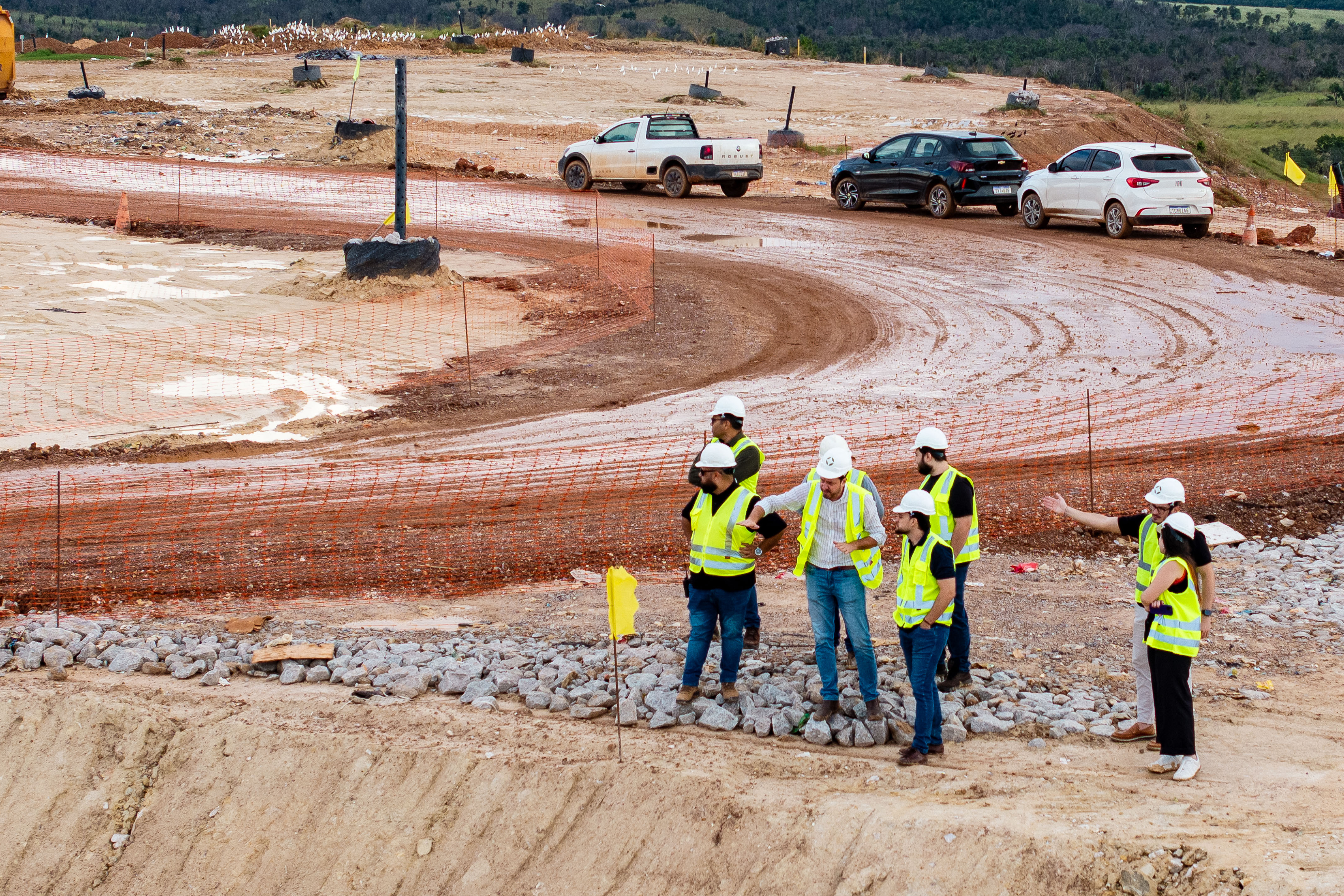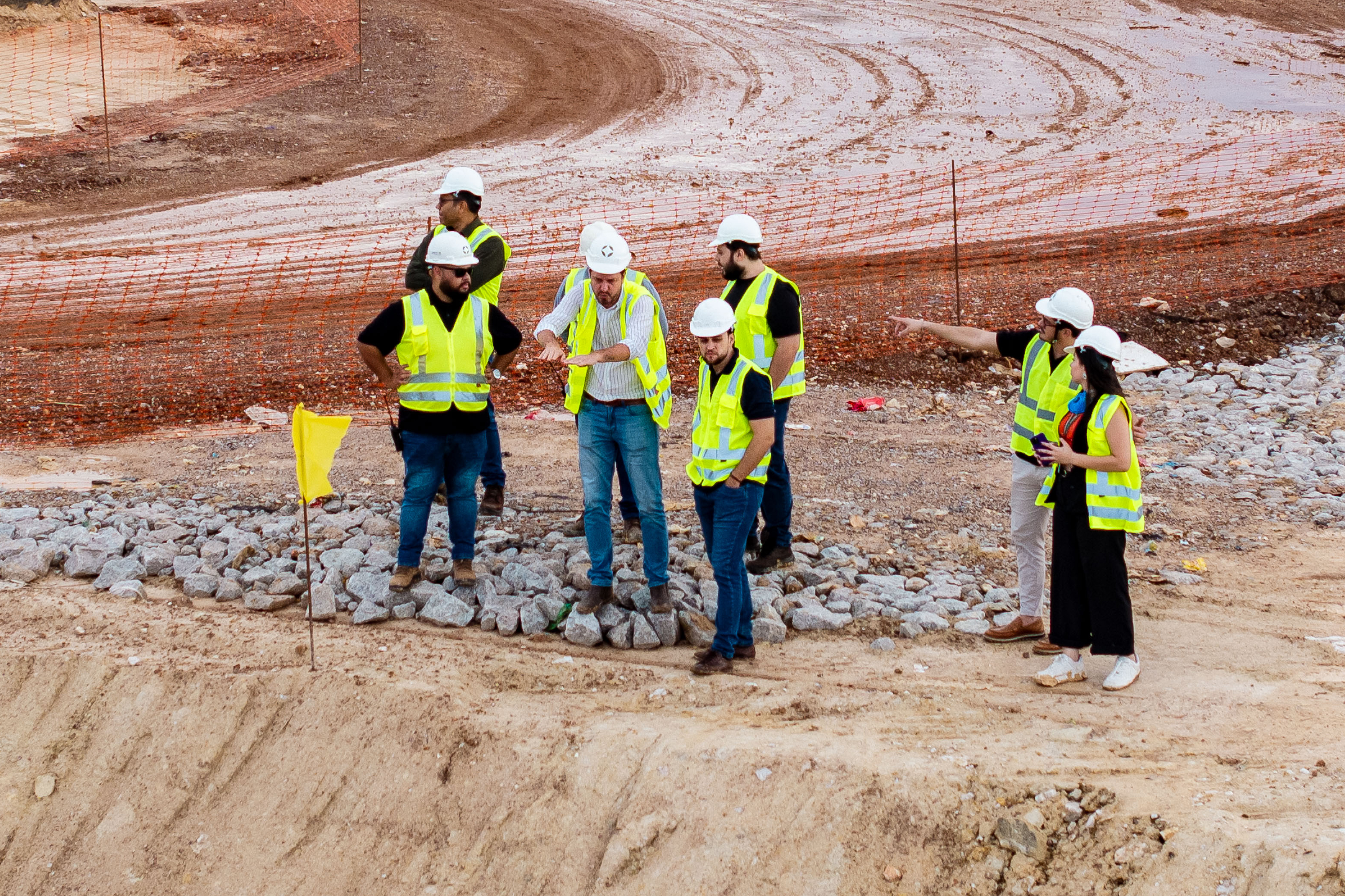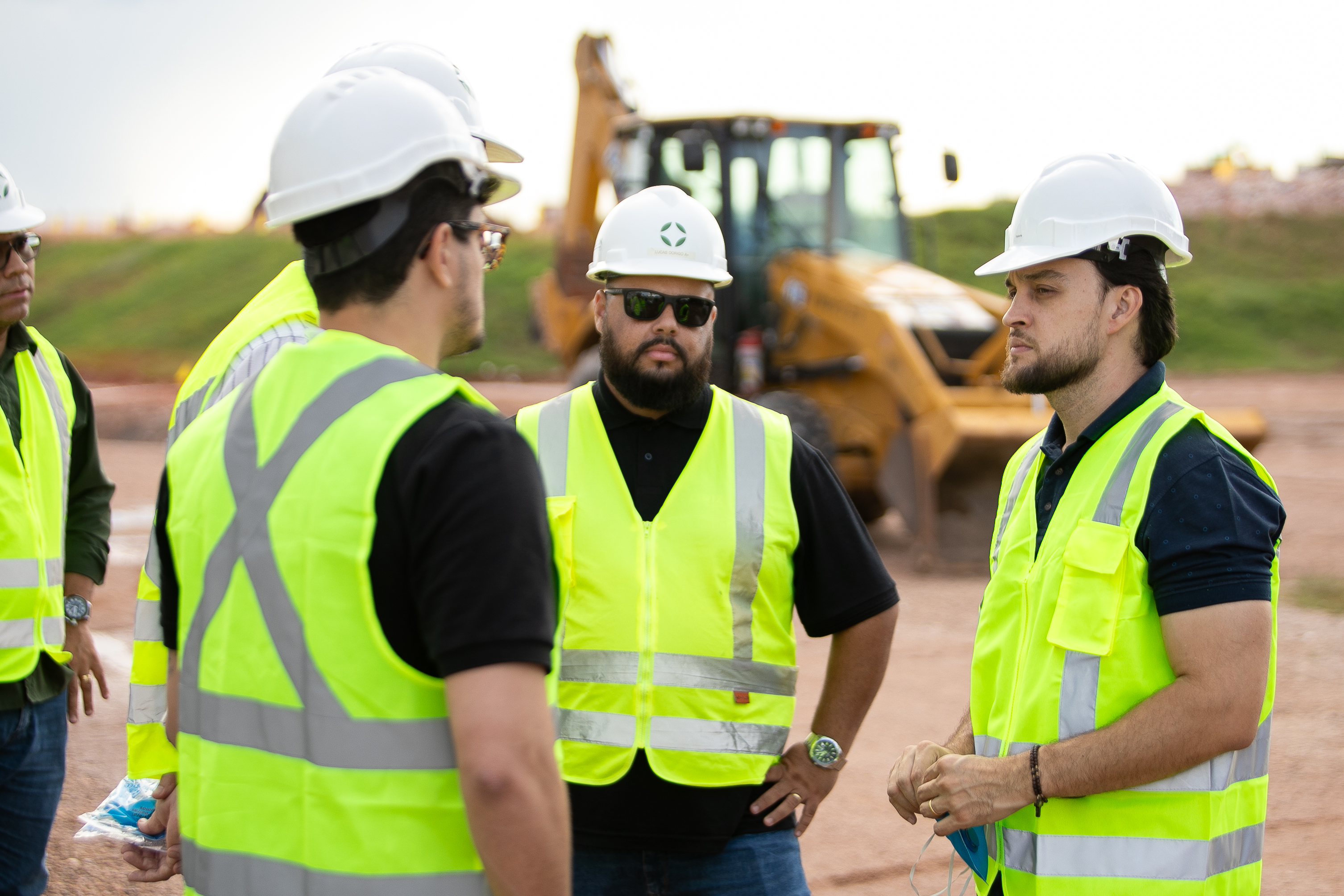 A imagem mostra o diretor-geral da Limpurb, Felipe Wellaton, ao lado de engenheiros da Limpurb e representantes da empresa Orizon, durante visita técnica ao Ecoparque Pantanal. Eles estão em área aberta do aterro sanitário, observando a estrutura e debatendo pontos técnicos da operação.