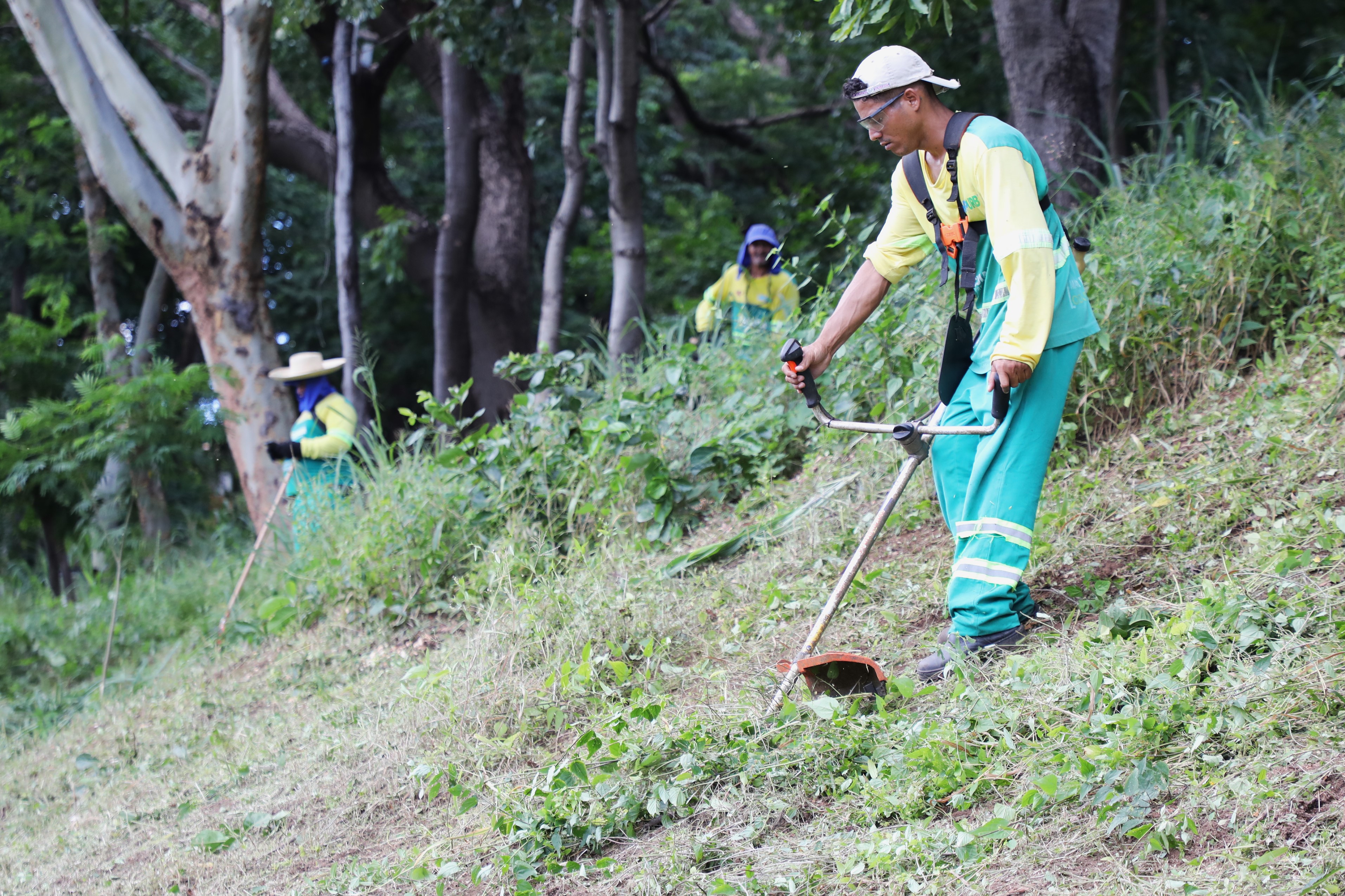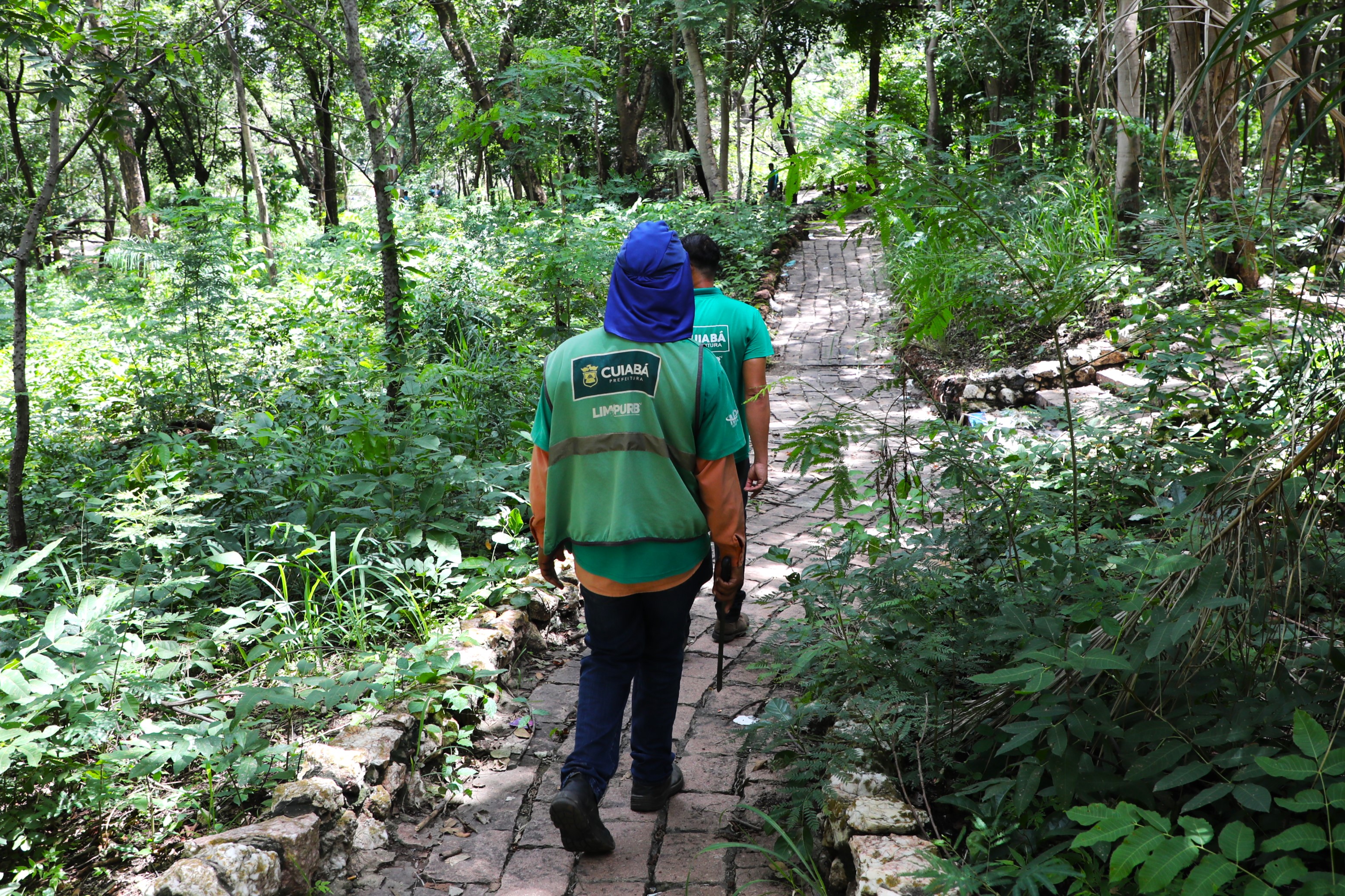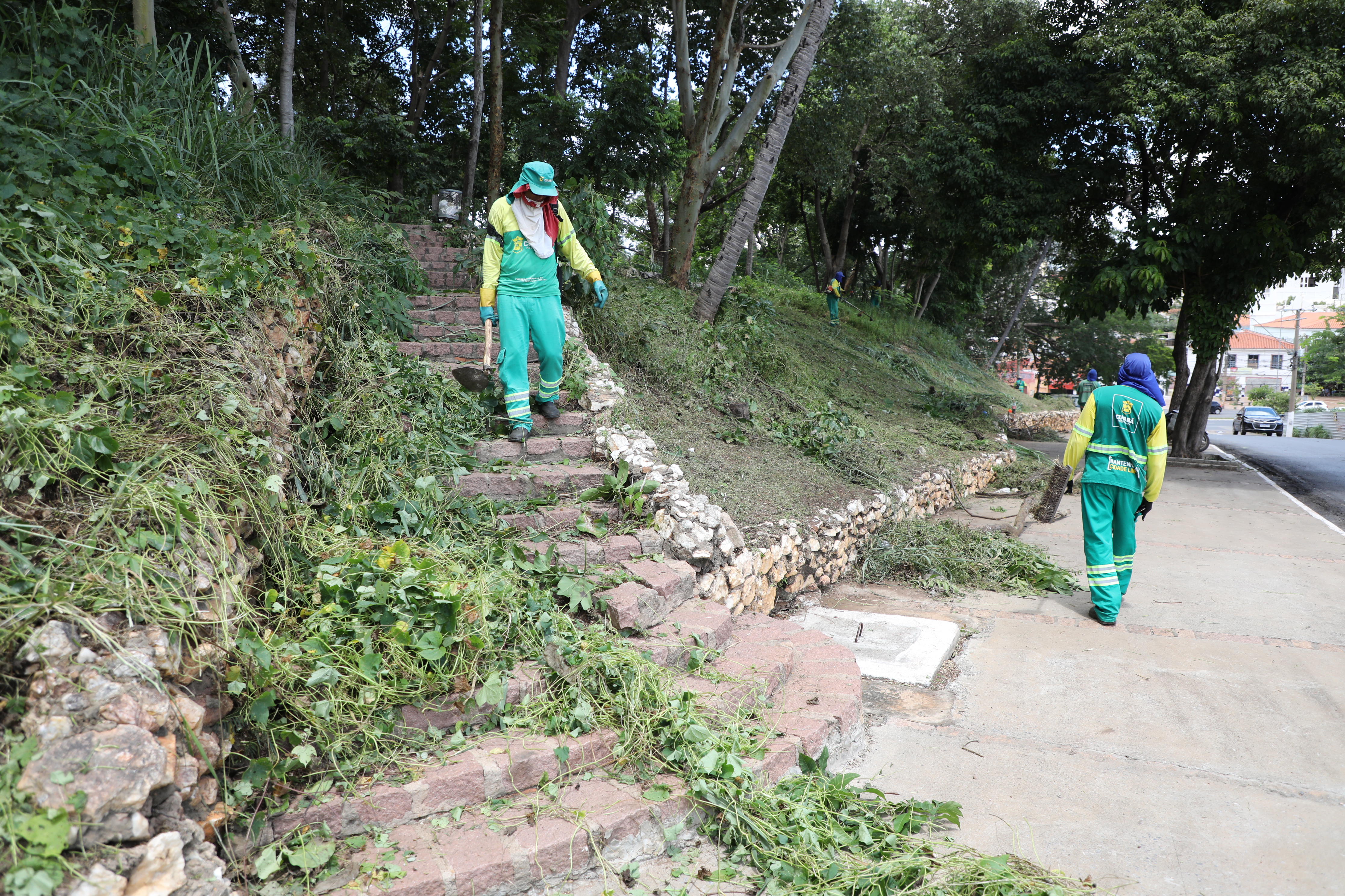 Na imagem, profissionais da Limpurb realizam a capinagem da vegetação no Morro da Luz. No canto esquerdo, uma placa marrom sinaliza que o local é um ponto turístico de Cuiabá.