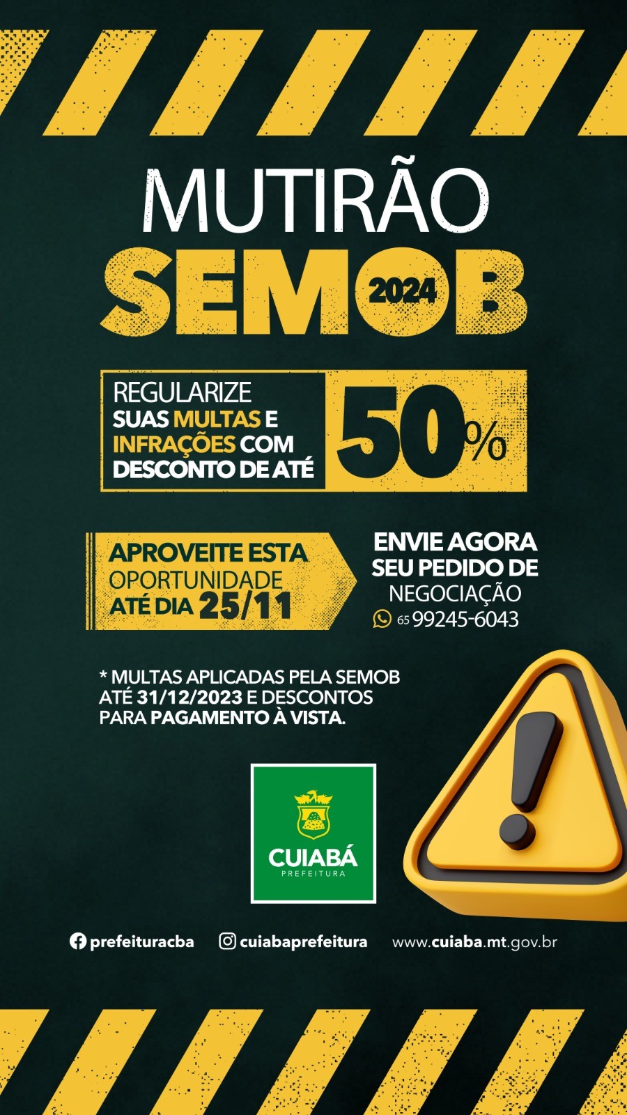 Para quem ainda não aproveitou a oportunidade de quitar débitos de multas ou infrações de trânsito, a Prefeitura de Cuiabá, por meio da Secretaria de Mobilidade Urbana (Semob), prorrogou até o dia 25 de novembro o prazo para pagamento com descontos de até 50%. Para acessar o benefício, basta enviar uma mensagem para o WhatsApp (65) 99245-6043 e solicitar a negociação dos valores pendentes. A negociação inclui débitos registrados até 31 de dezembro de 2023, inscritos ou não em dívida ativa.