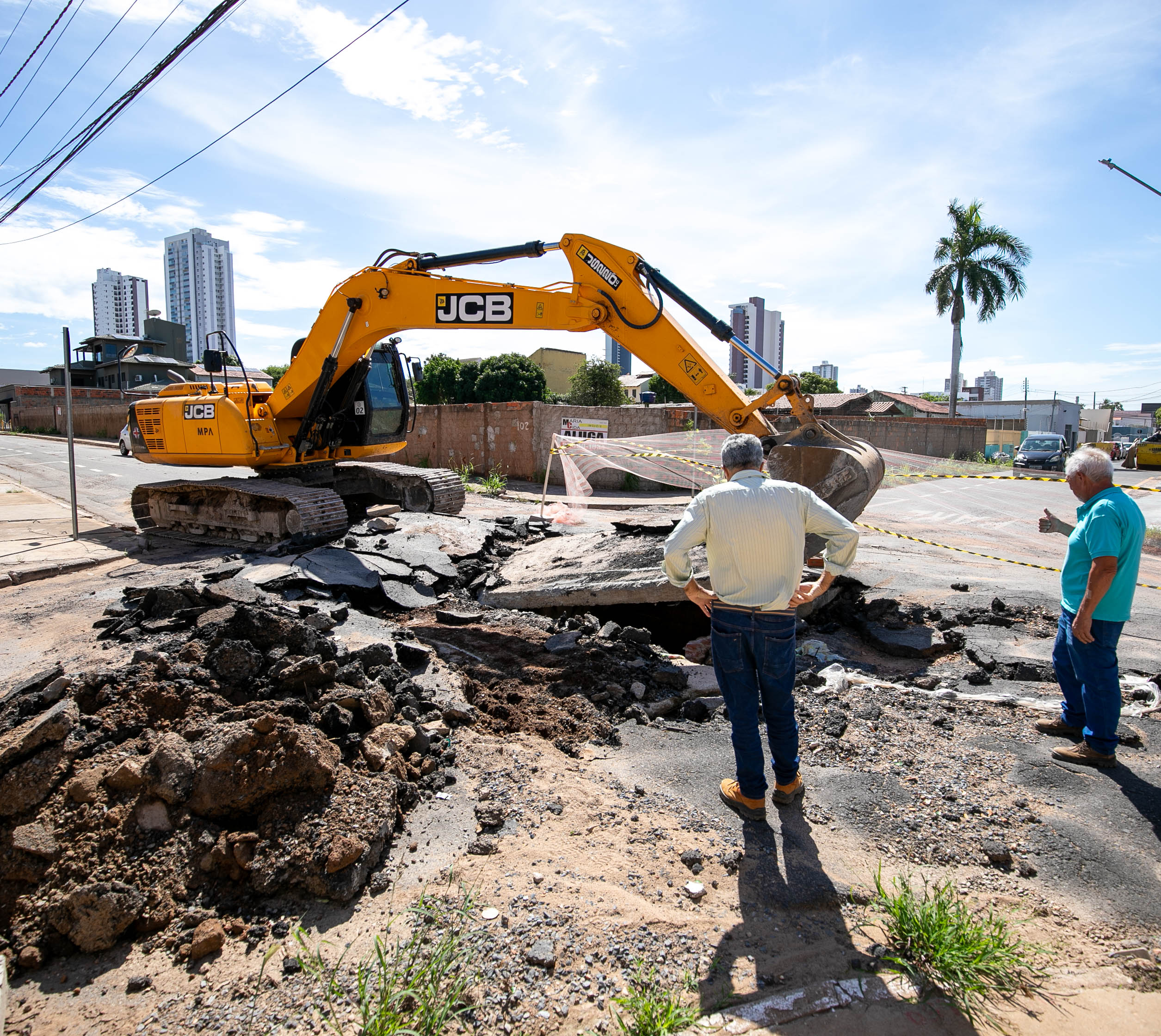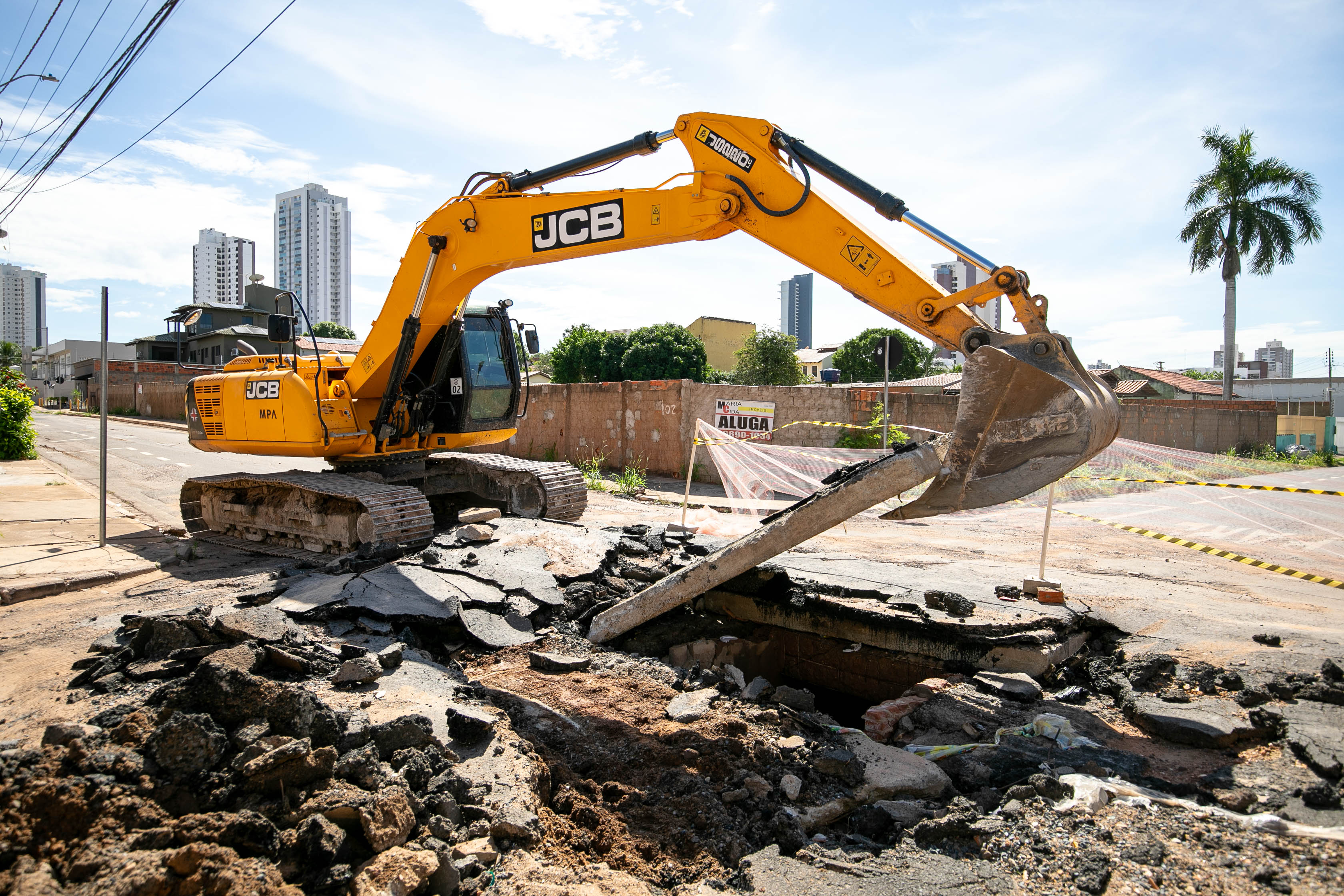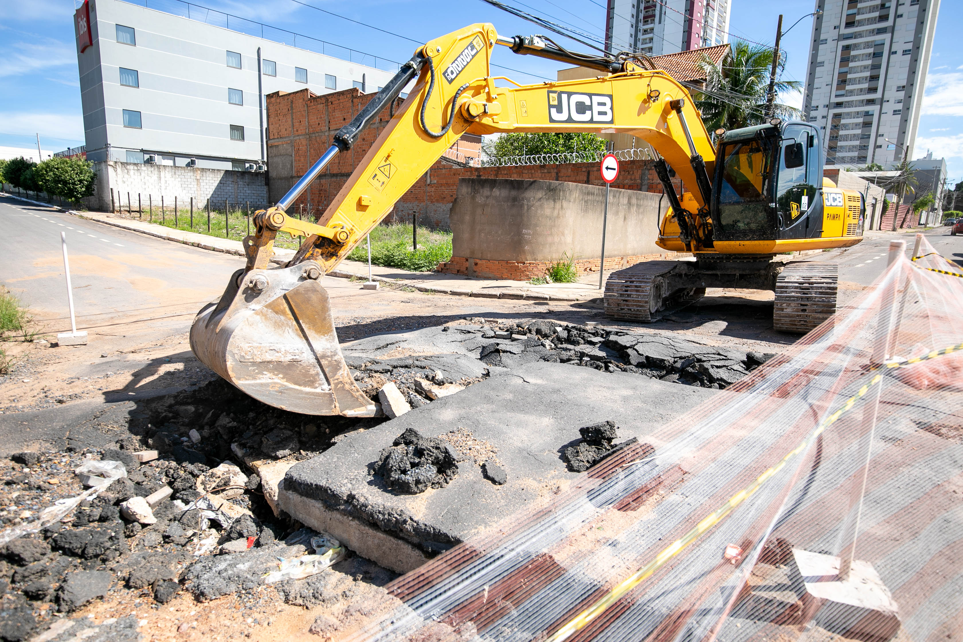 A imagem mostra uma escavadeira hidráulica amarela realizando obras no Jardim Cuiabá. O solo está quebrado, com pedaços de asfalto e terra espalhados. Há uma fita de isolamento delimitando a área, e ao fundo, é possível ver prédios altos, algumas casas e uma palmeira.