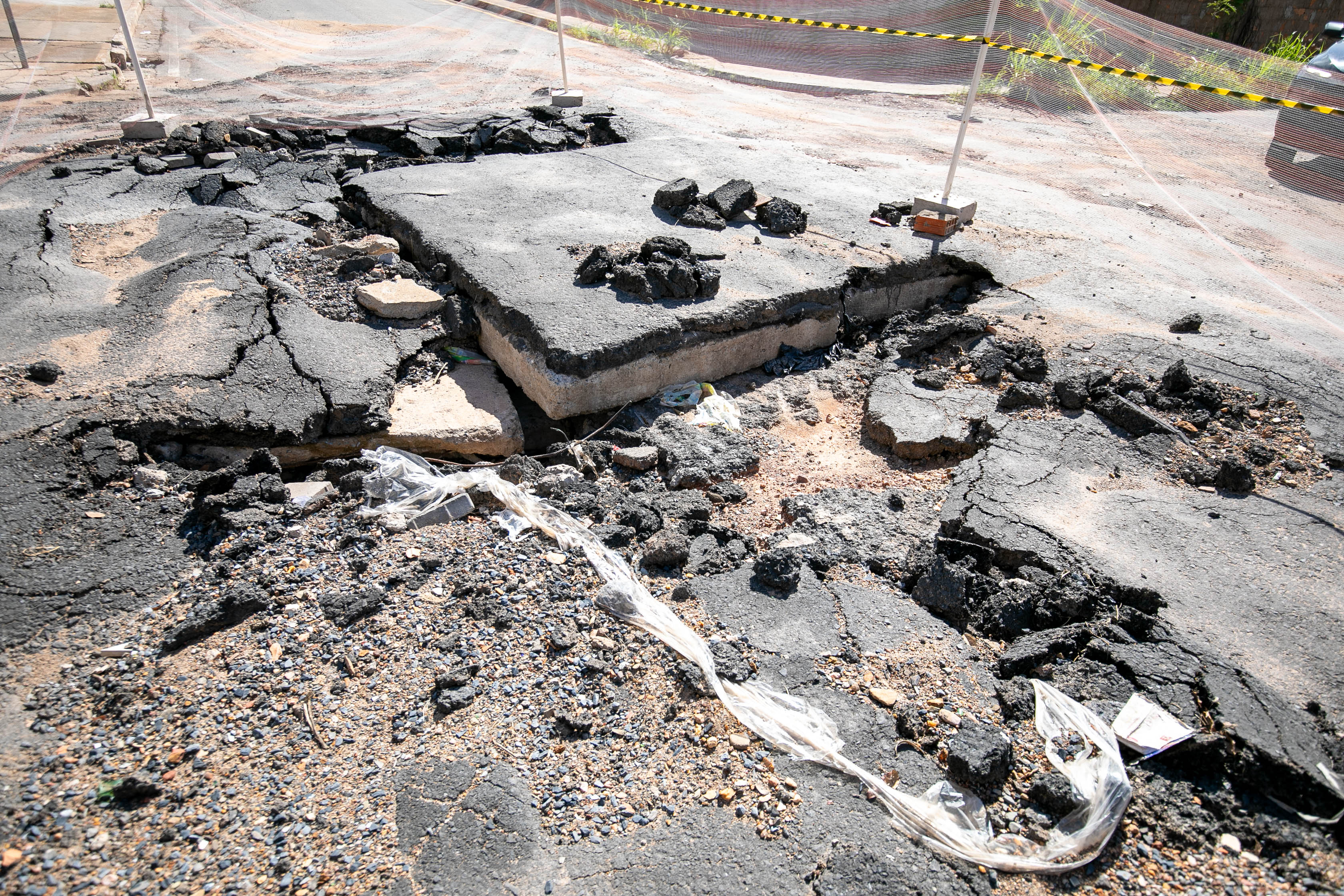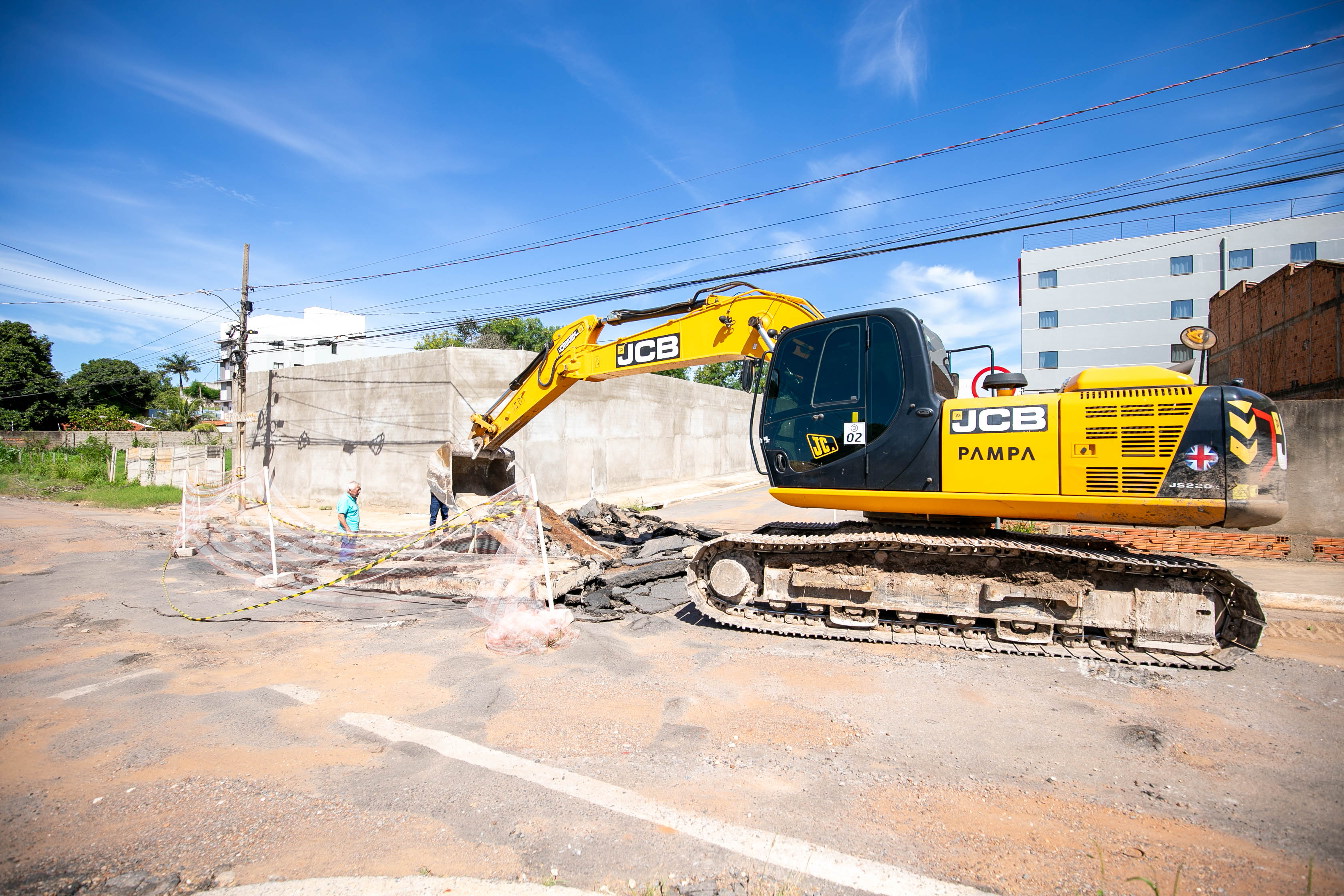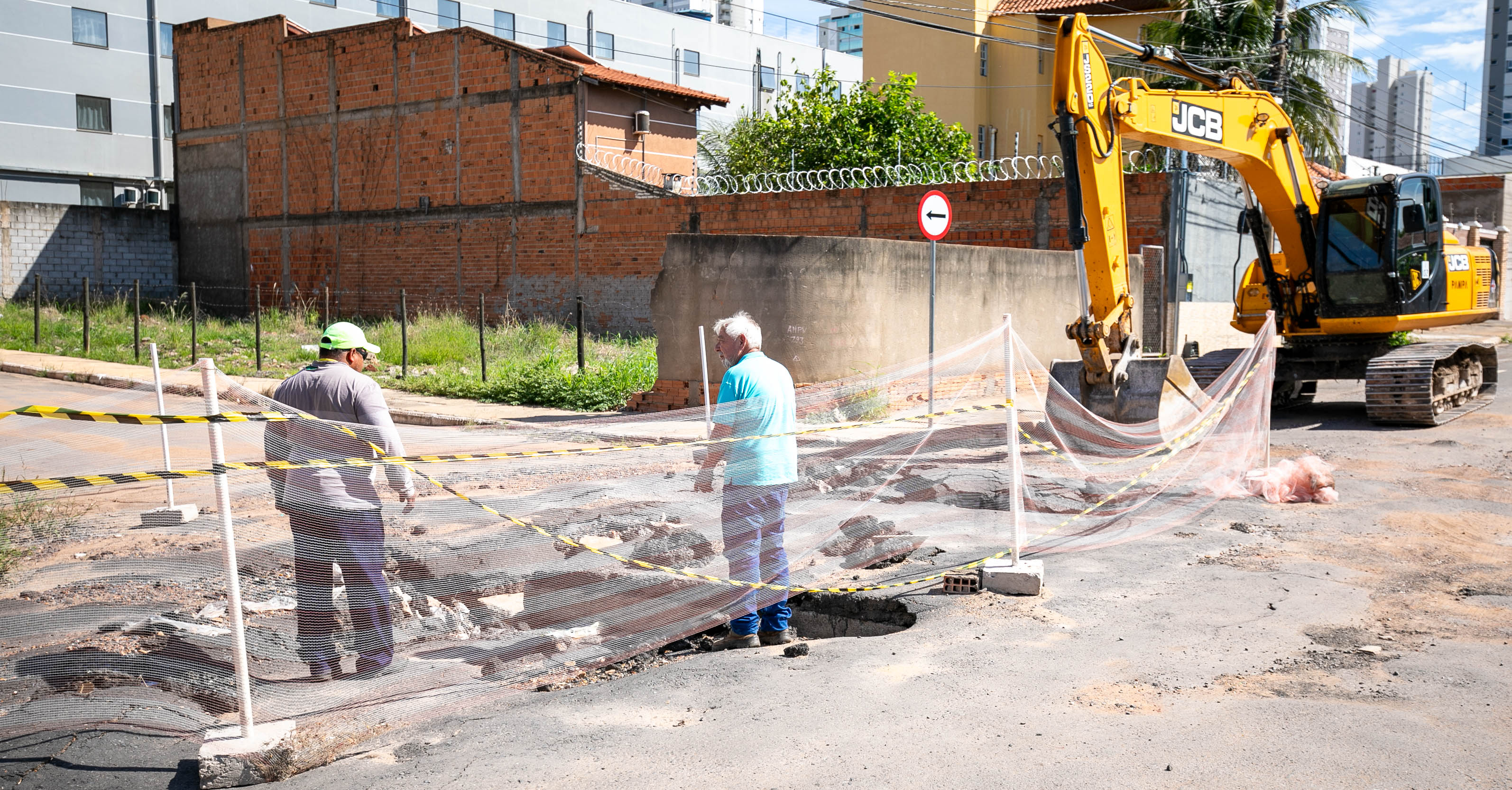 A imagem mostra uma escavadeira hidráulica amarela realizando obras no Jardim Cuiabá. O solo está quebrado, com pedaços de asfalto e terra espalhados. Há uma fita de isolamento delimitando a área, e ao fundo, é possível ver prédios altos, algumas casas e uma palmeira.