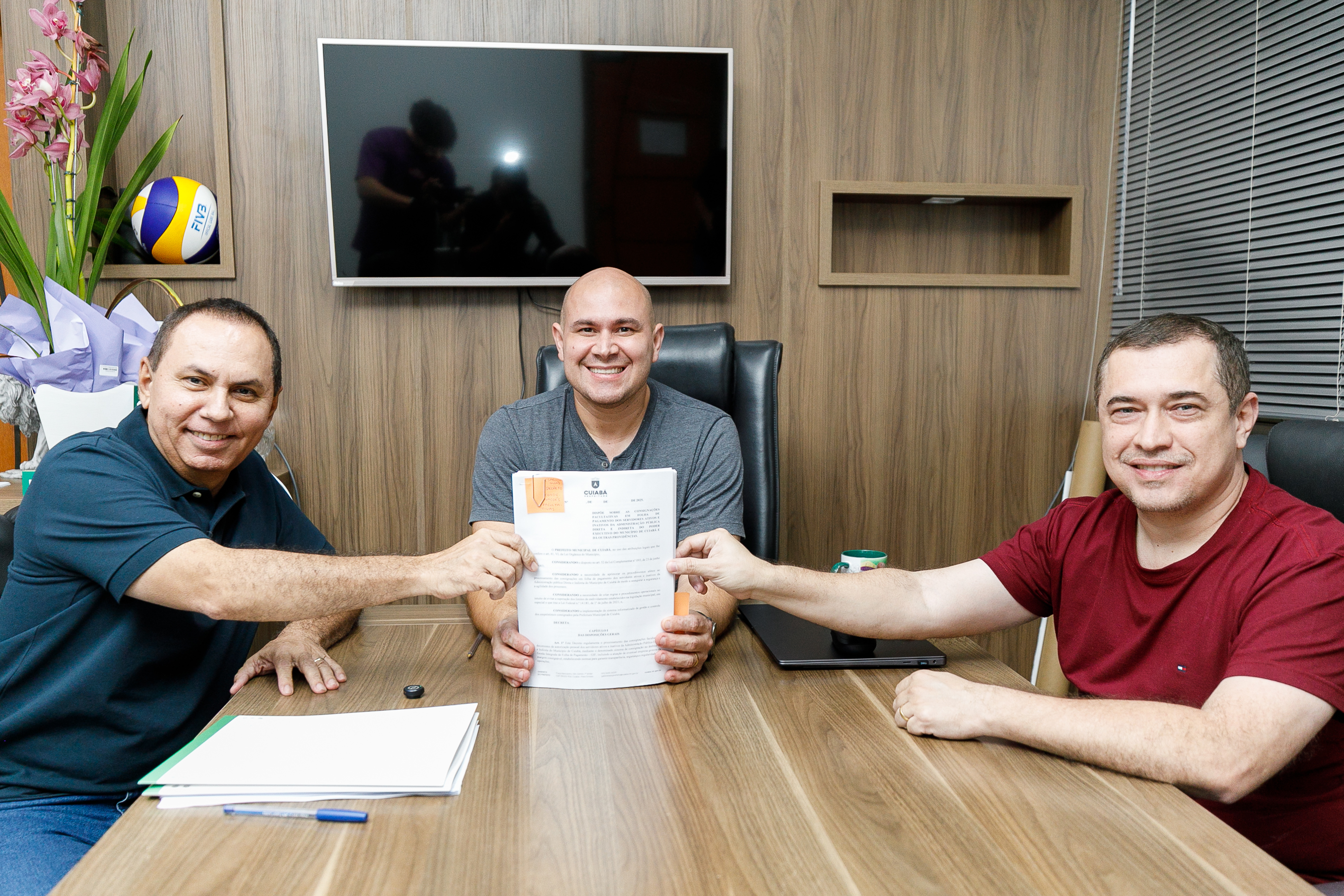 Na foto aparece o prefeito Abilio Brunini segundo o decreto com a mão direita ao lado do secretário de Economia de Cuiabá Marcelo Bussiki e o vereador Dilemário Alencar.