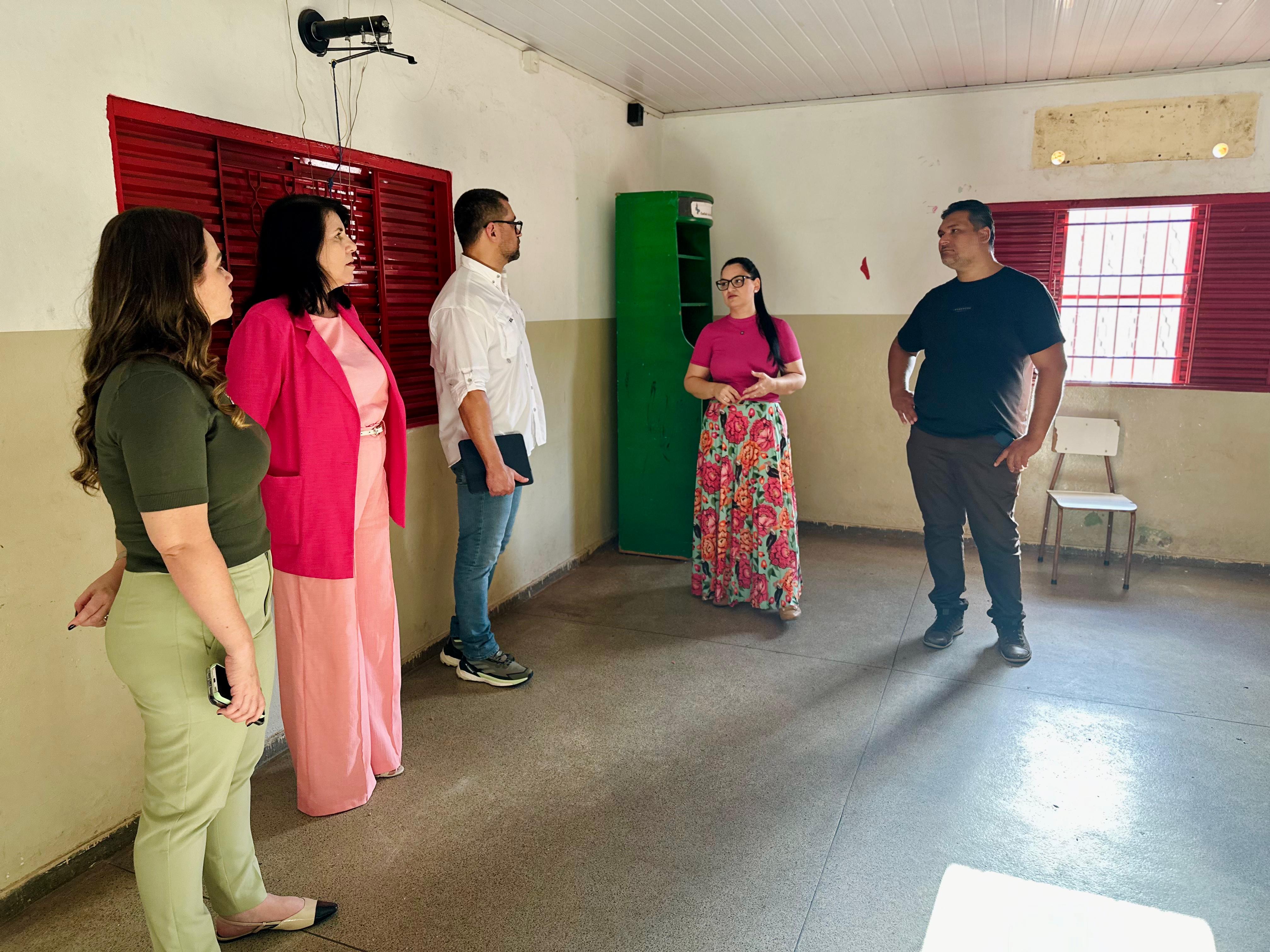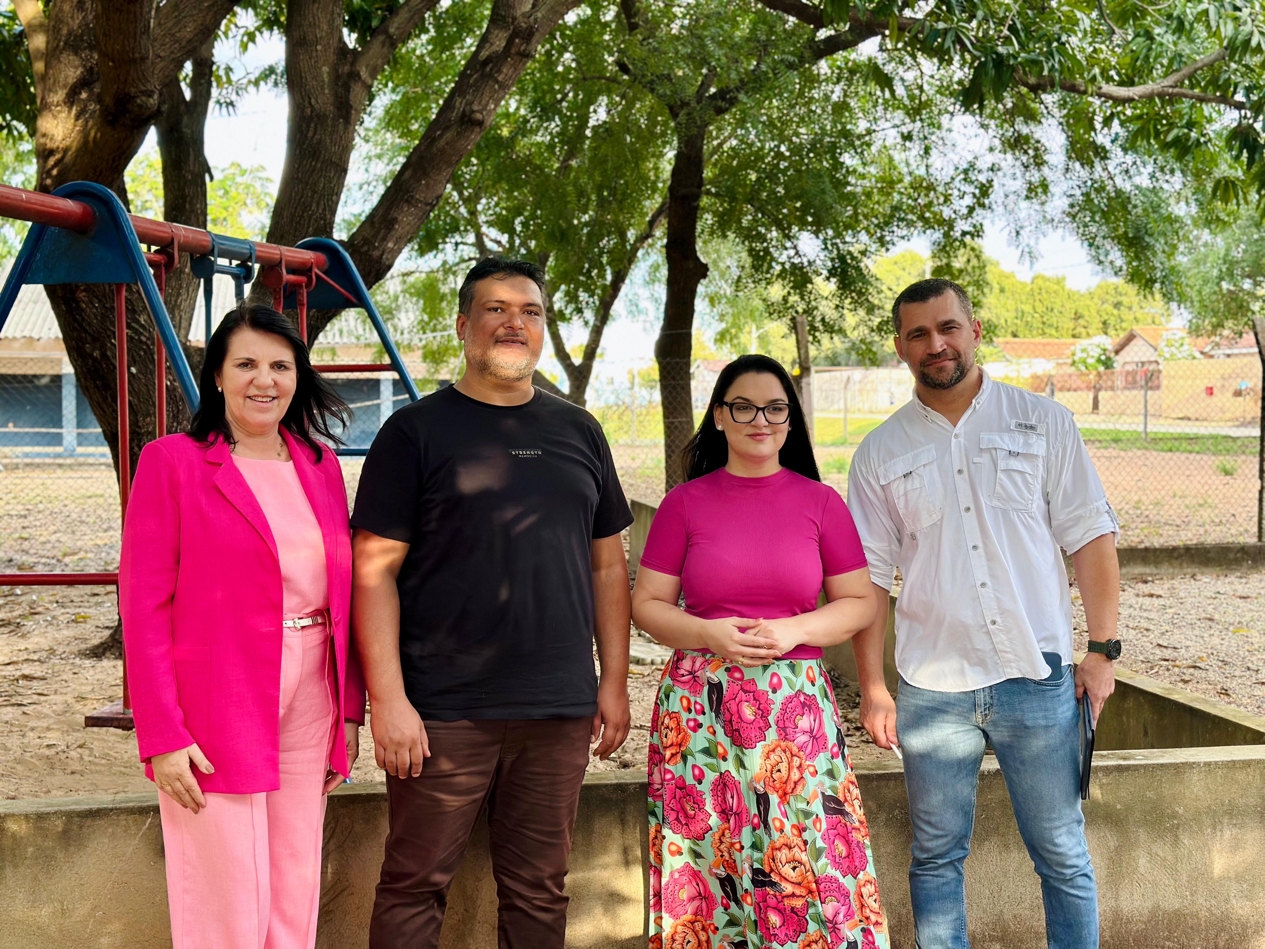 A imagem mostra Ivete Carneiro, coordenadora do Programa Siminina, usando blazer rosa, secretário-adjunto de Esportes, Pablo Queiroz, usando camiseta preta, a primeira-dama e vereadora de Cuiabá, Samantha Iris, usando blusa rosa e saia longa estampada e o secretário de Esportes, Jefferson Neves, usando camisa branca. Eles estão no espaço que abrigará uma nova unidade do Programa Siminina.