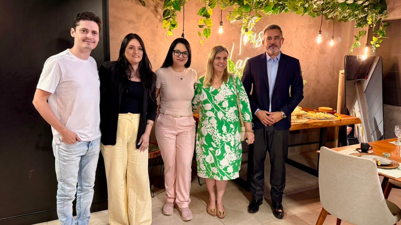 Na foto, a primeira-dama e vereadora de Cuiabá, Samantha Iris, veste conjunto rosa. Ao lado, o pastor Maik Aquino usa camisa branca e jeans claro, e a desembargadora Nilza Pôssas está de vestido verde com estampa de folhas brancas. Também aparecem Adriana Escarpino, da equipe da igreja, de calça amarela e blazer preto, e o Dr. Antônio Veloso Peleja Junior, com blazer azul-marinho, camisa azul e calça cinza escura. Todos posam para a foto em um dos ambientes da Igreja Lagoinha.
