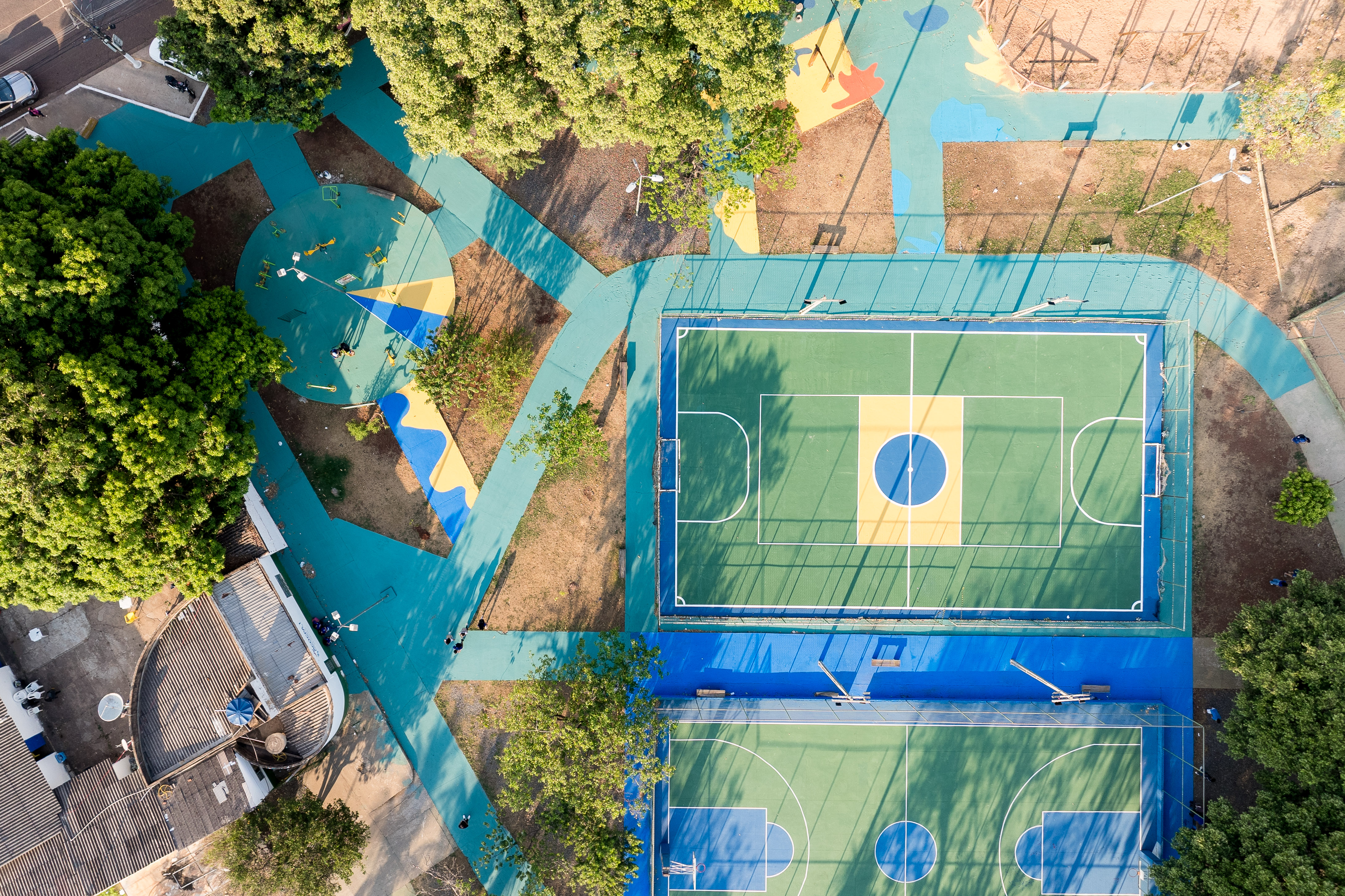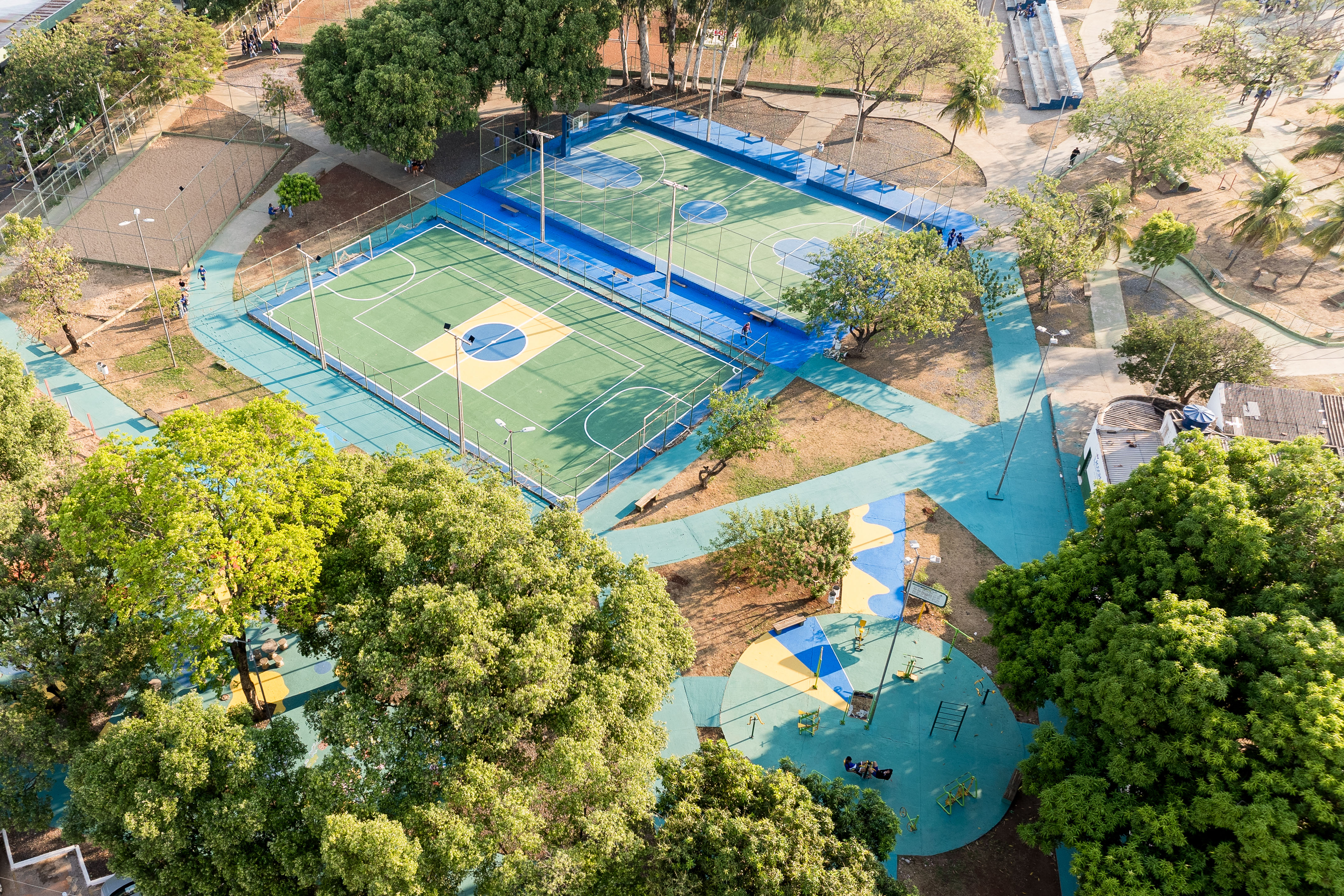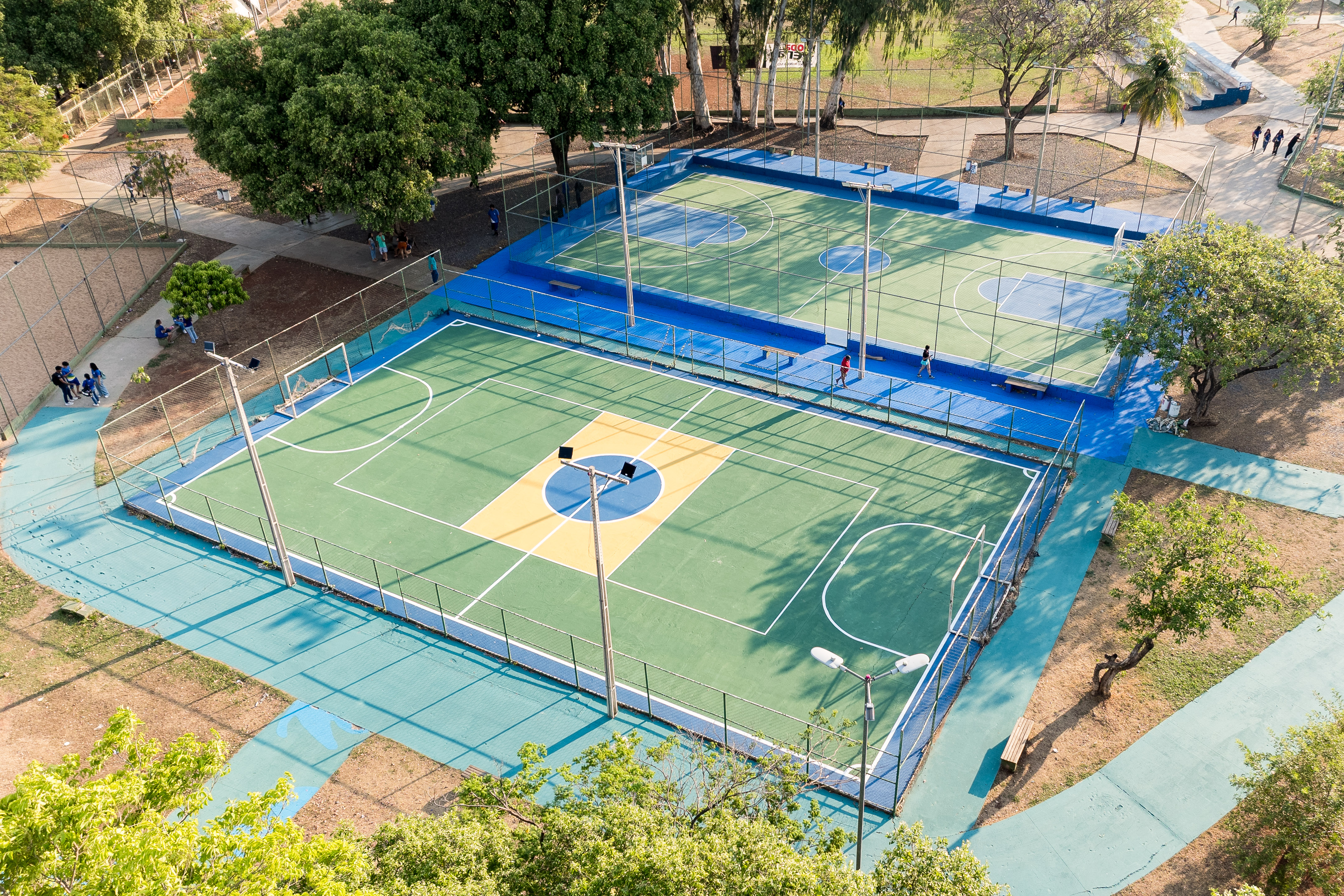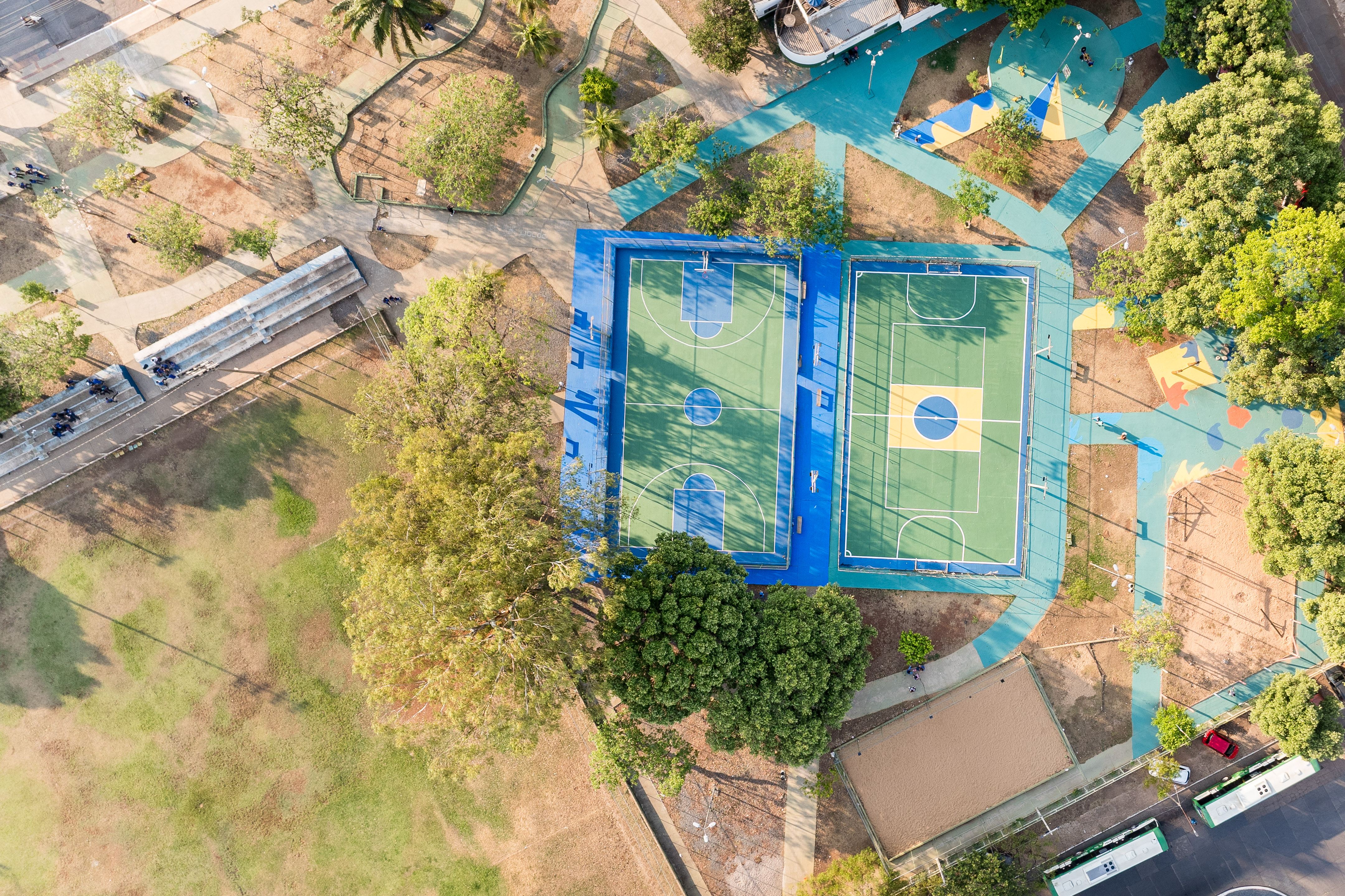 A foto mostra a vista aérea do Complexo do CPA I, onde a primeira-dama e vereadora de Cuiabá, Samantha Iris, promoveu mutirão de pintura e melhorias em quadras poliesportivas.