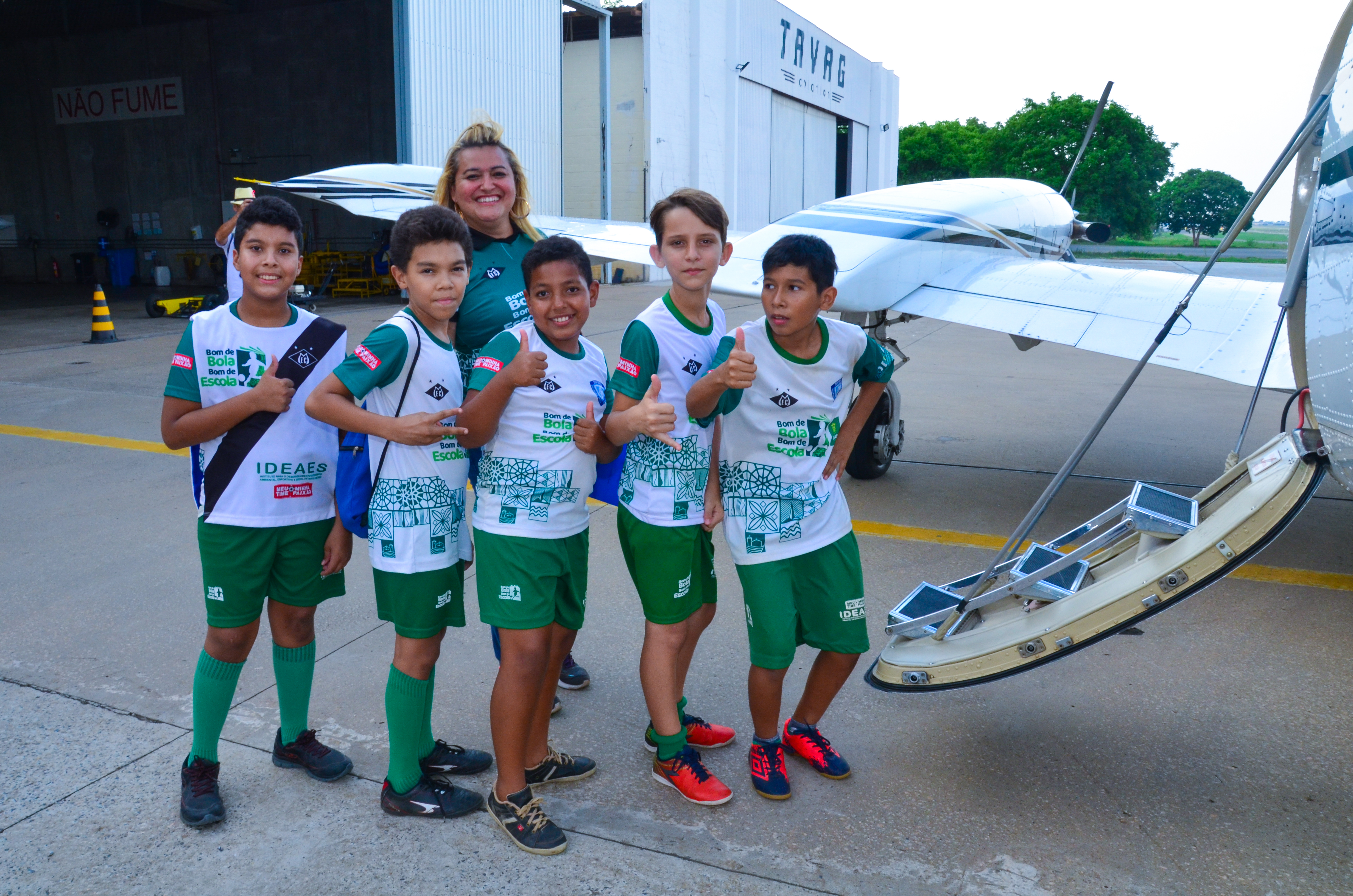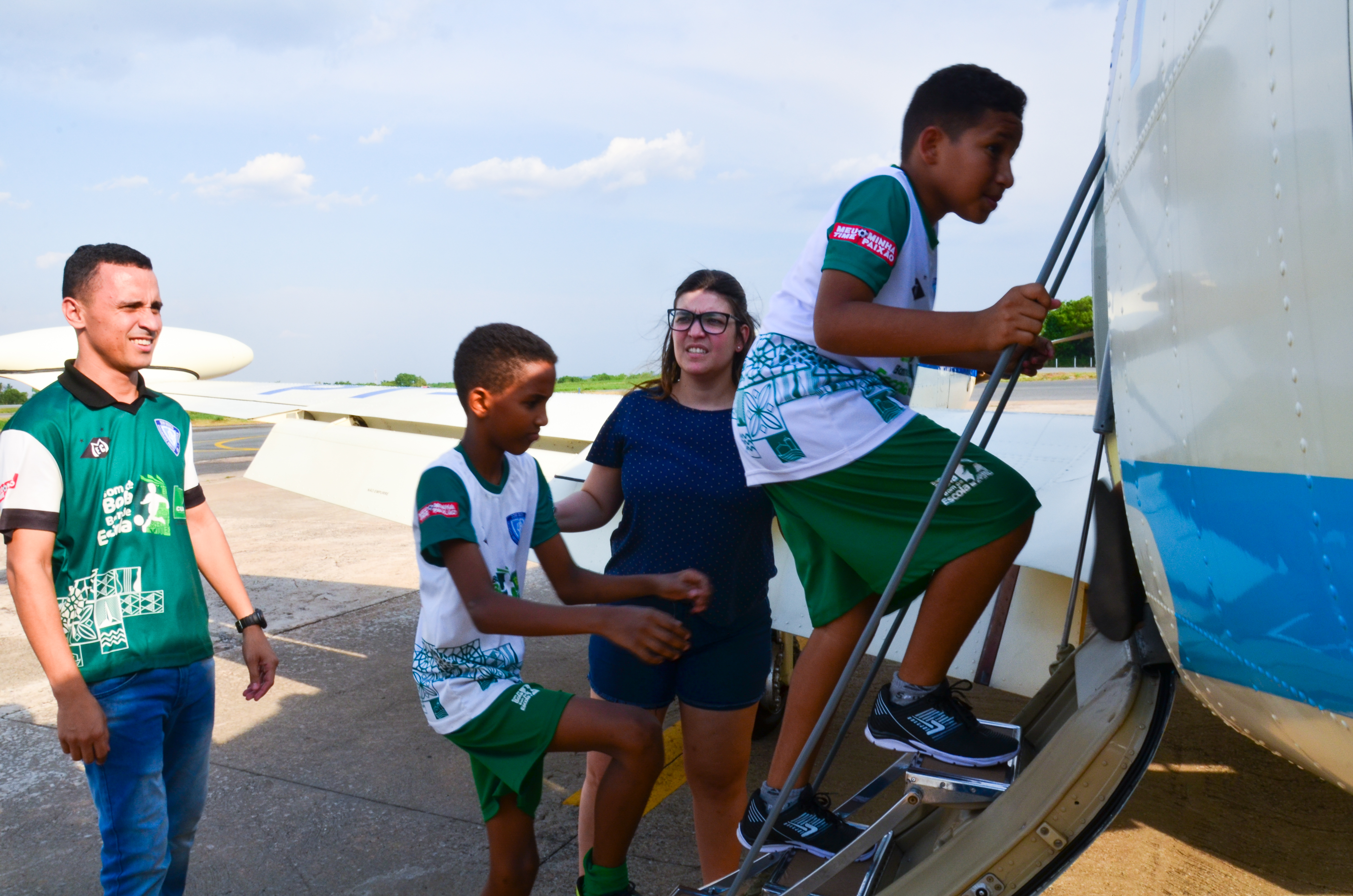 Alunos do projeto Bom de Bola, Bom de Escola, da Prefeitura de Cuiabá, tiveram um encontro diferente neste sábado (19). Acompanhados pela primeira-dama da Capital, Márcia Pinheiro, a maioria deles realizou o seu primeiro voo de avião, no hangar da empresa Abelha Táxi Aéreo. A proposta faz alusão ao Dia das Crianças, celebrado em 12 de outubro, e do Aviador, lembrado em 23 de outubro.