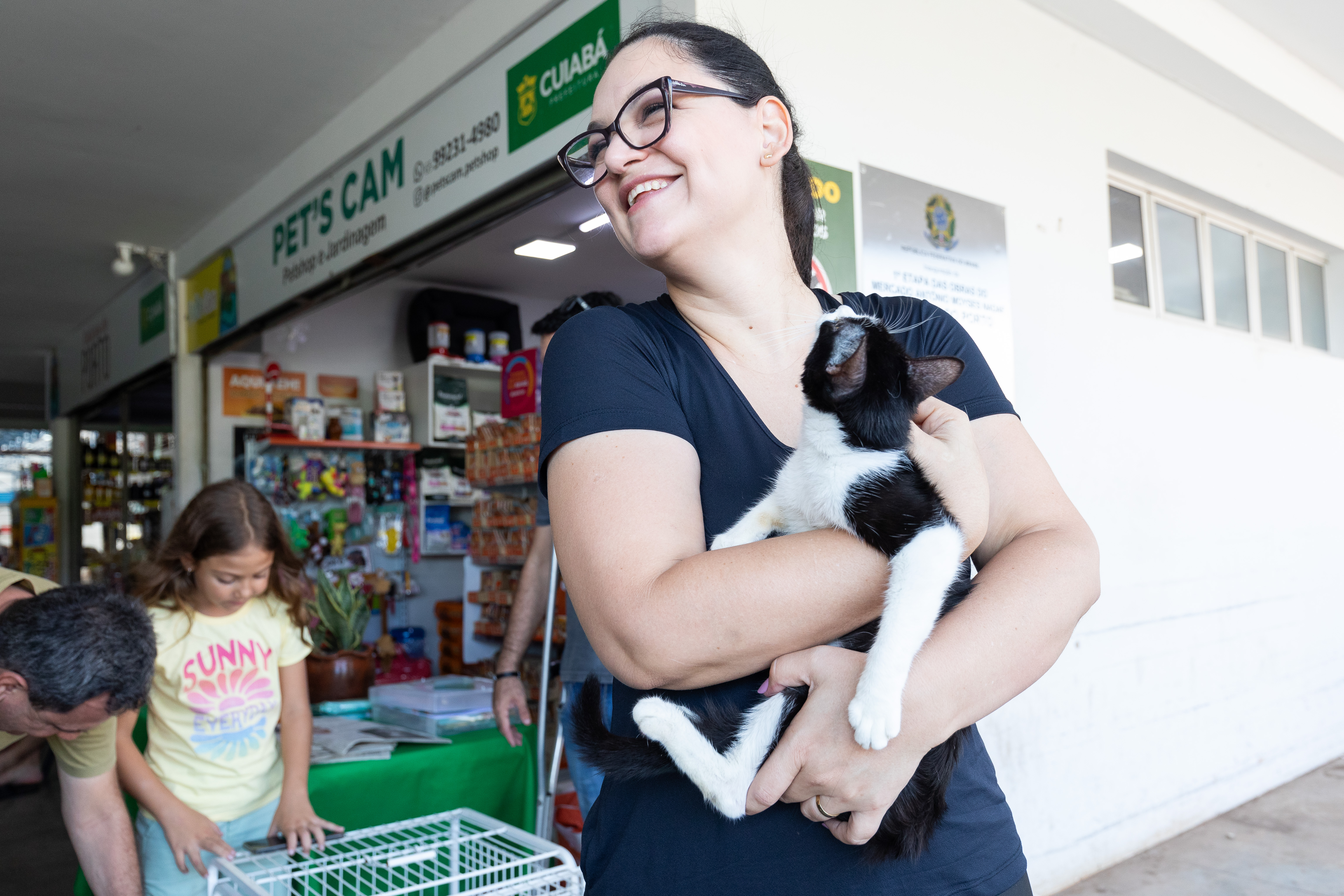 A imagem mostra a primeira-dama sorrindo e abraçando um gato em uma feira de adoção. Ela usa camisa preta e o gato é das cores preto e branco.