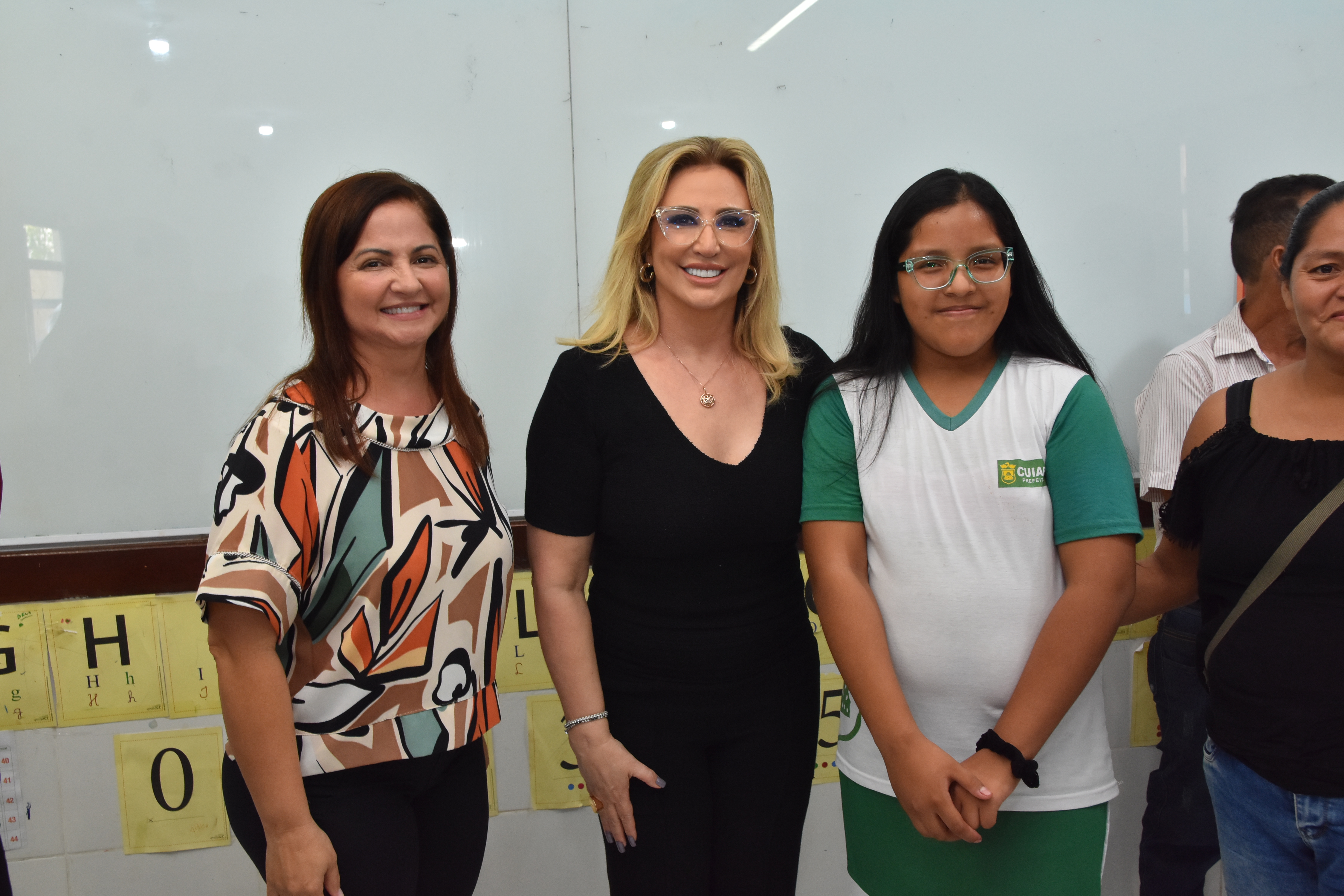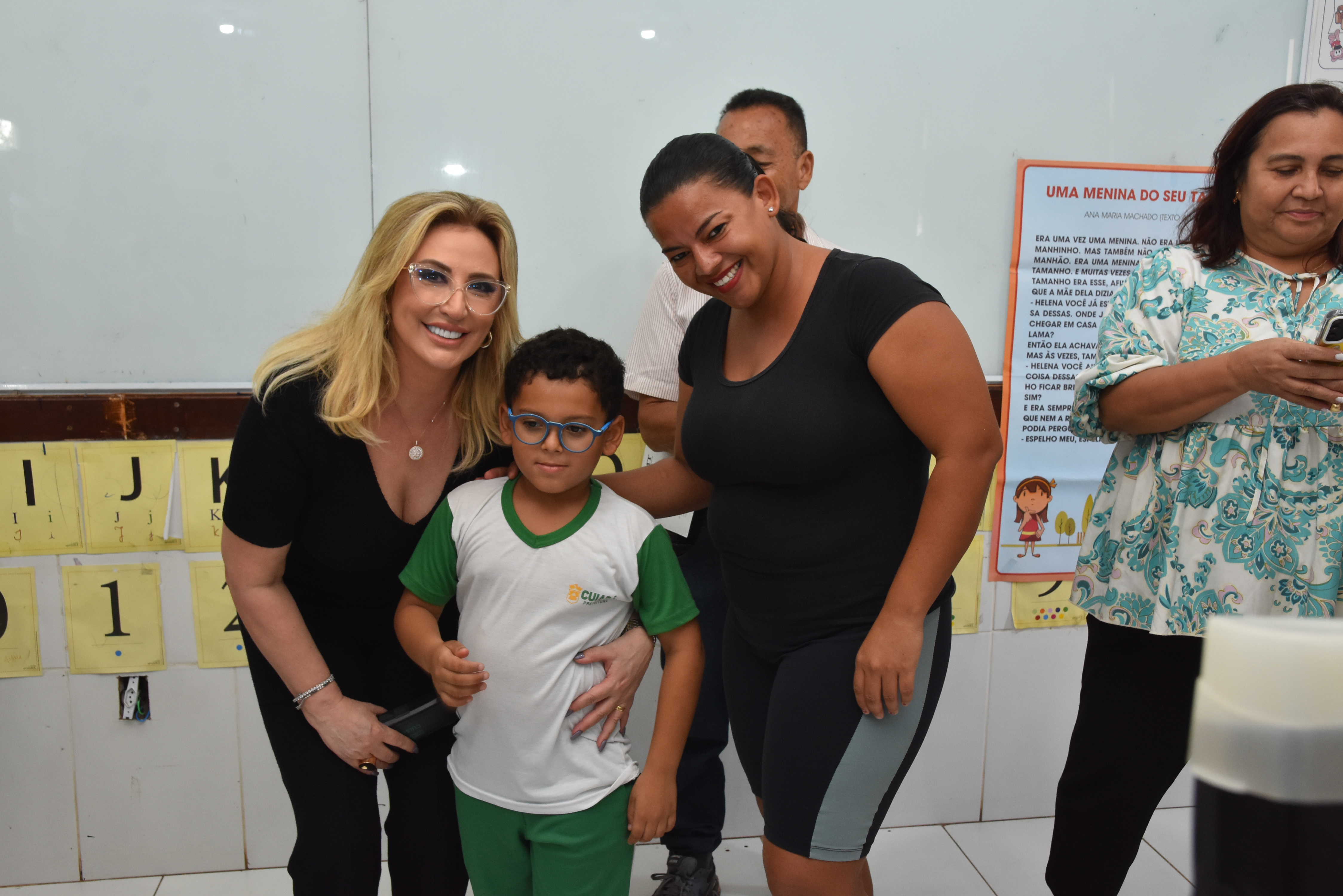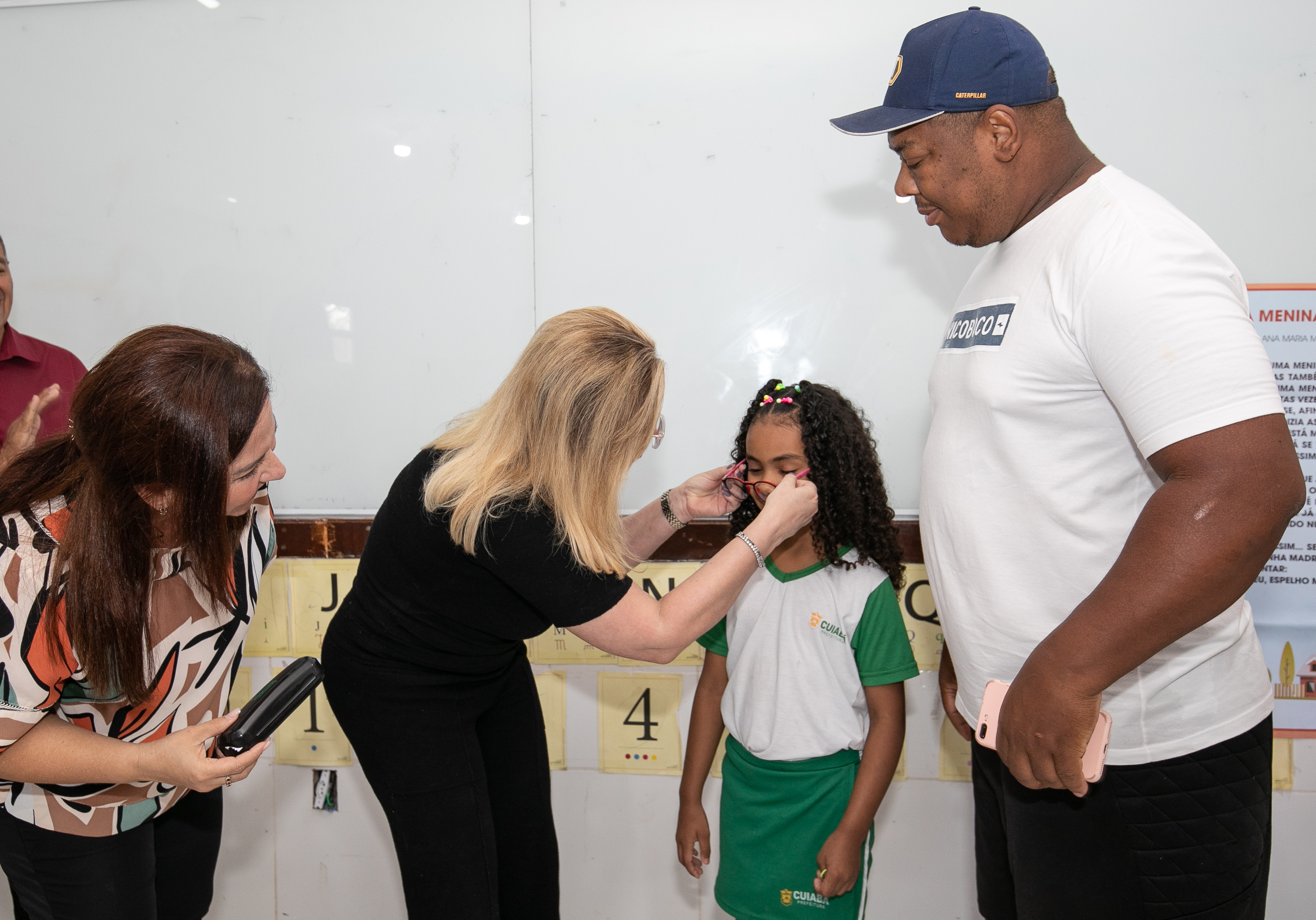 Primeira-dama Márcia Pinheiro entrega óculos a estudantes da EMEBC Profª. Hilda Caetano