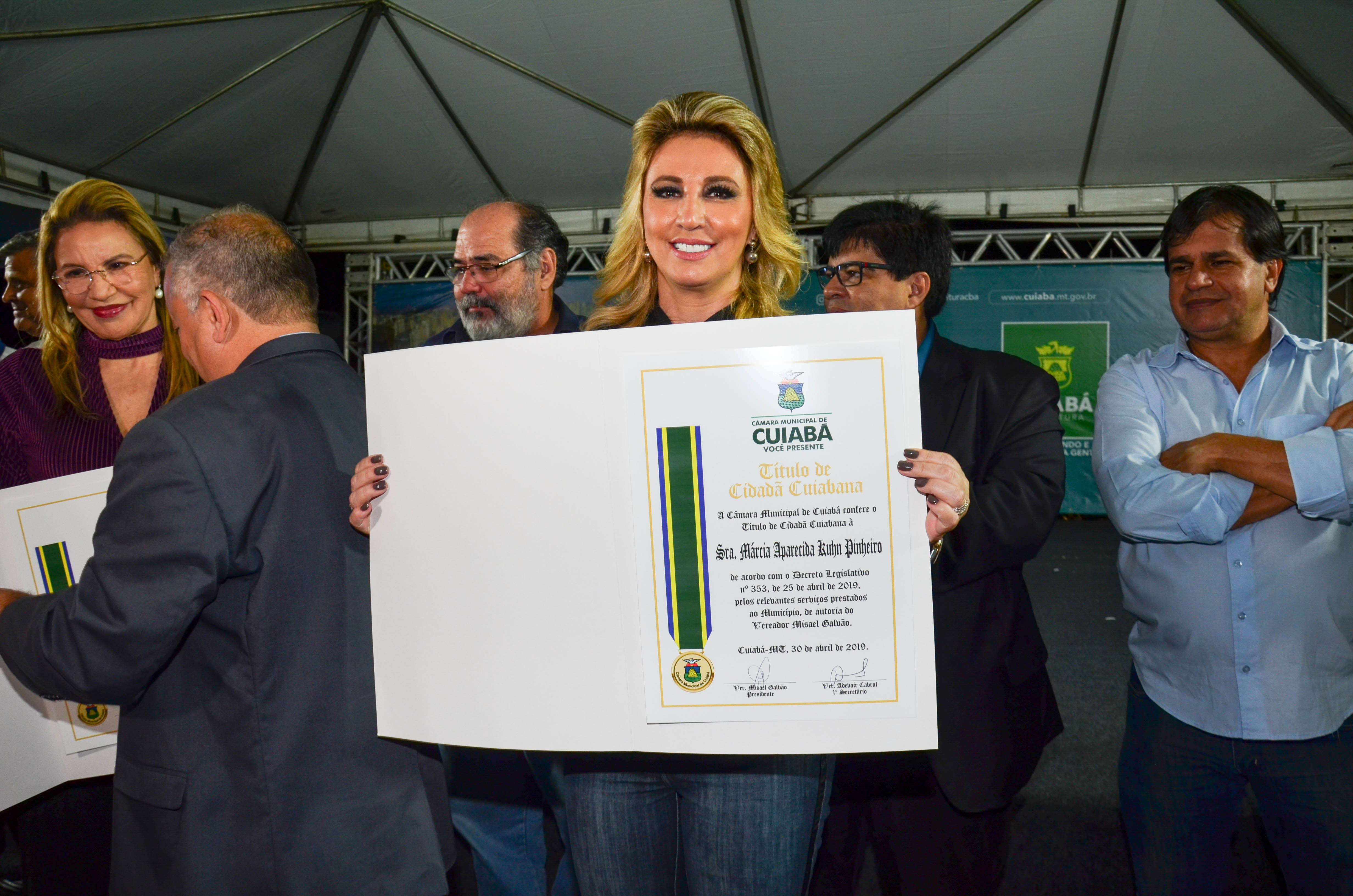 A primeira-dama Márcia Pinheiro recebeu o título de cidadã cuiabana, nesta quinta-feira (16), durante a inauguração do Parque da Nascente, no bairro Morada do Ouro. A honraria do Parlamento Municipal foi entregue pelo presidente da Câmara Municipal, vereador Misael Galvão.