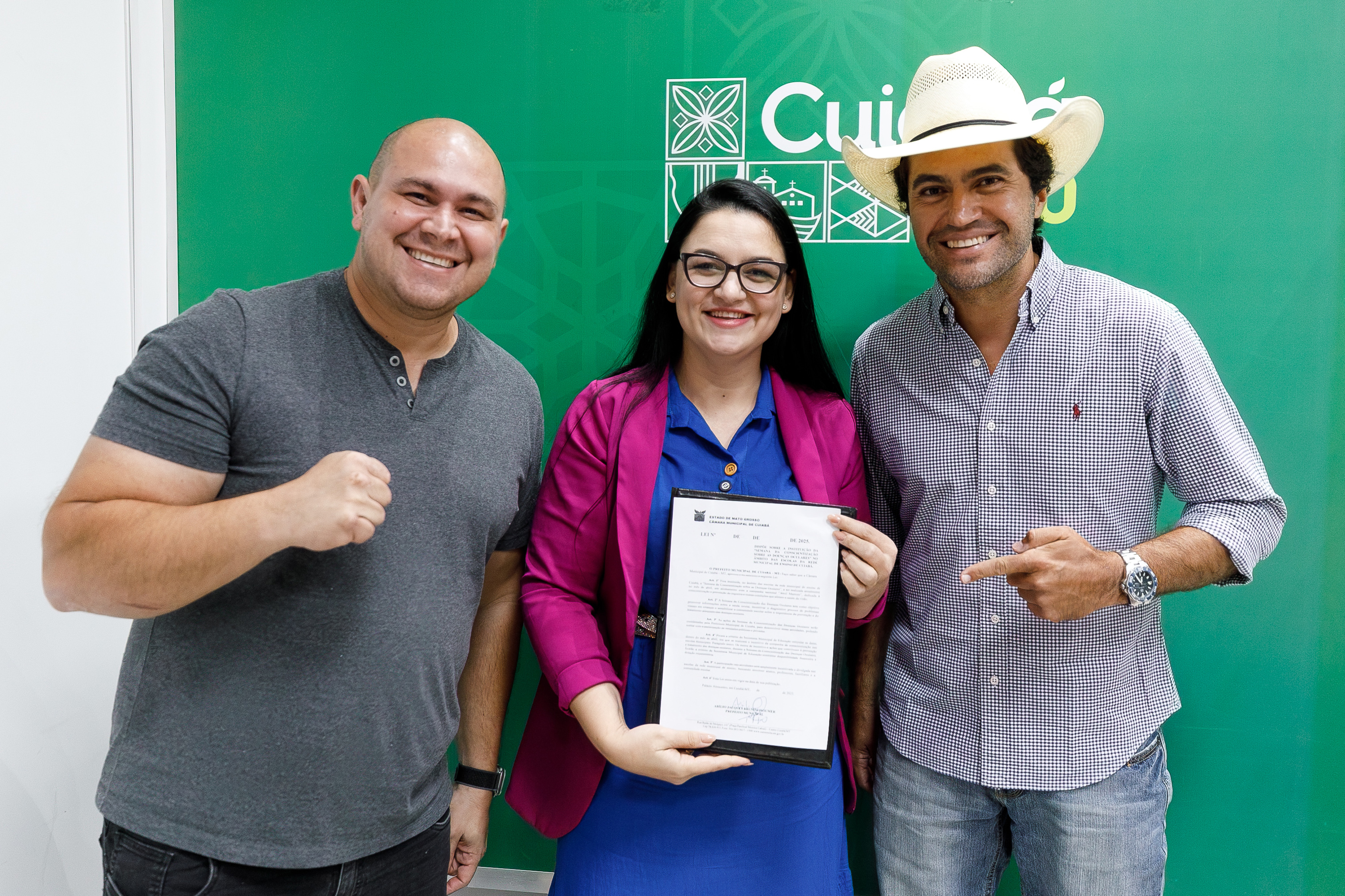 A foto mosta Samantha ao lado do prefeito Abilio e do deputado federal Thiago Boava, viúvo da deputada federal Amália Barros. Eles seguram a nova lei que institui a "Semana da Conscientização sobre as Doenças Oculares" no calendário oficial das escolas municipais.