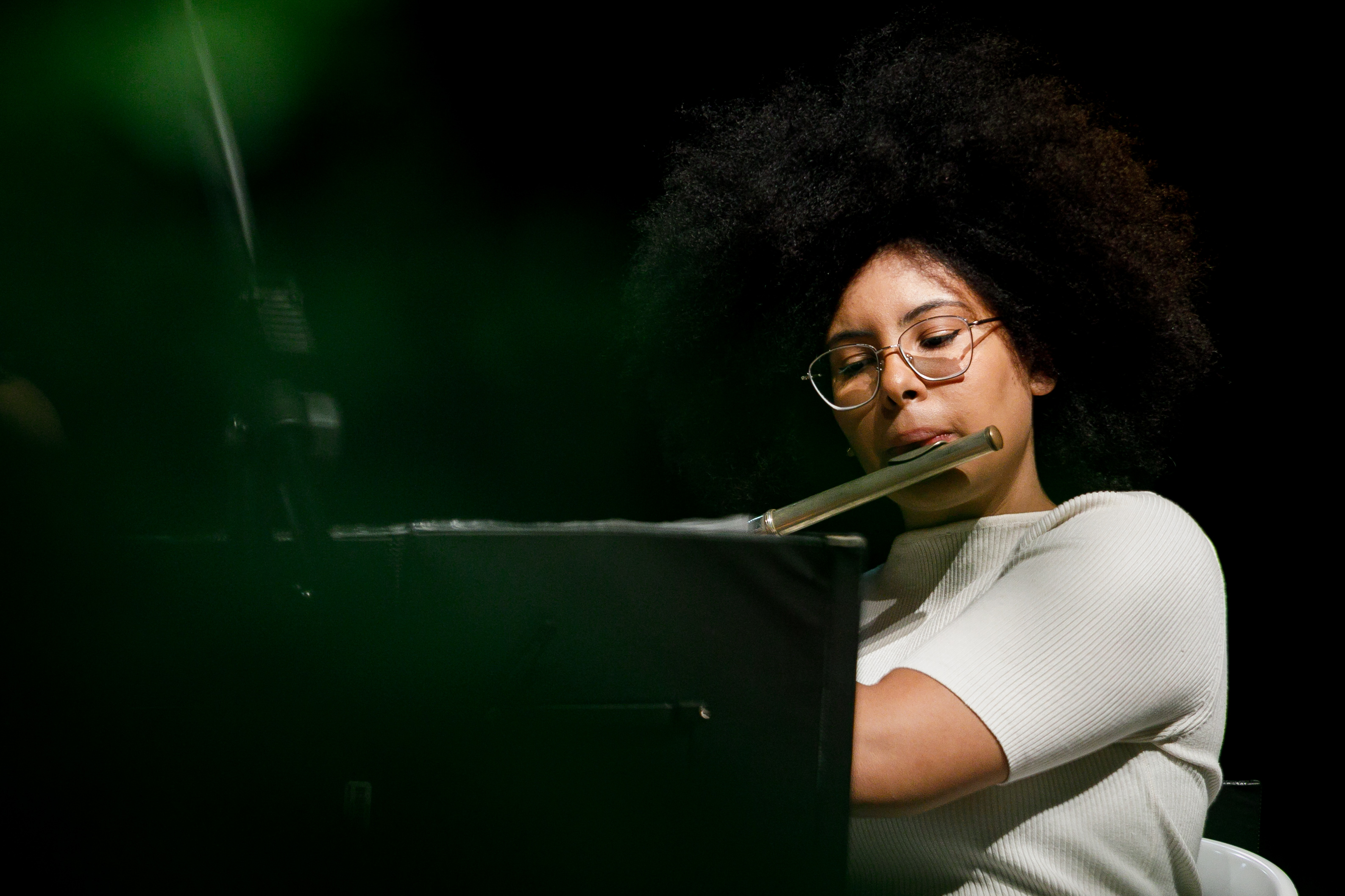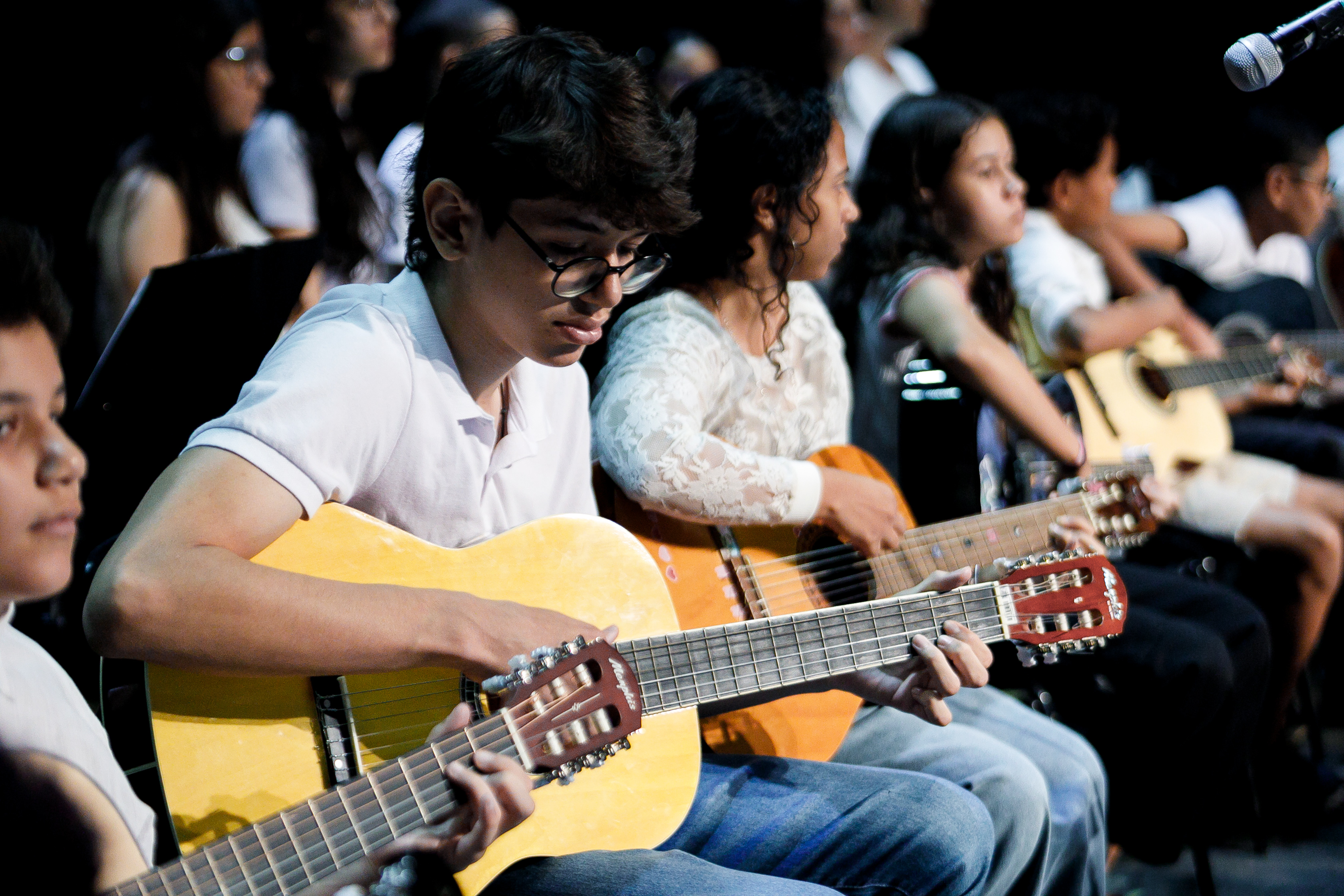 Marcos Gabriel subiu em um palco de teatro pela primeira vez, mas experiência com instrumentos ele tem. Ele toca bateria e flauta, e na Escola de Música aprendeu a tocar violão. “Eu gosto de música, é muito bom. No primeiro tempo a gente fica nervoso, mas depois passa e não tem mais nervosismo. É só se entregar para a música”.